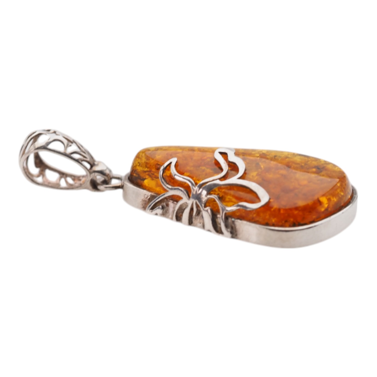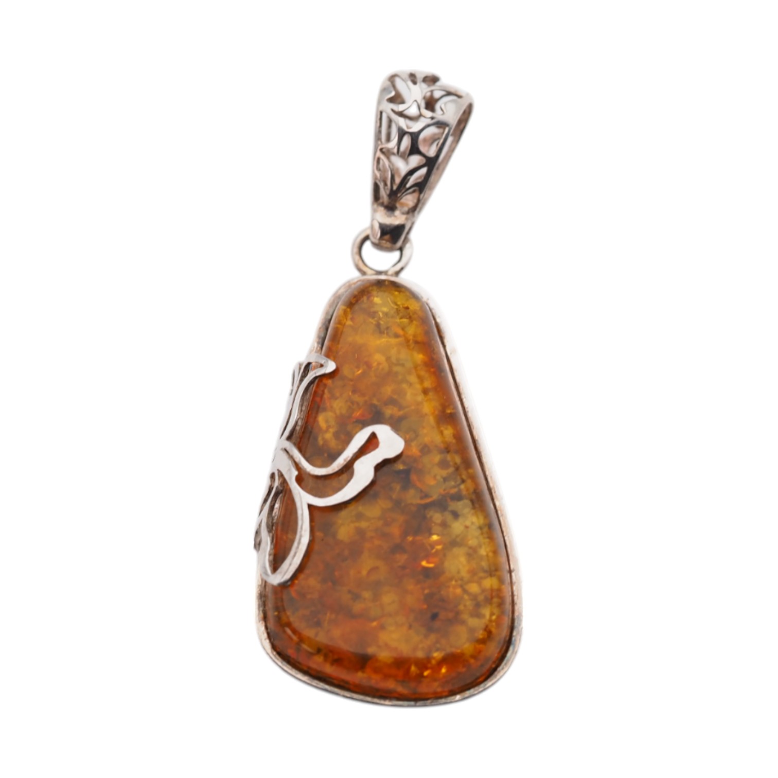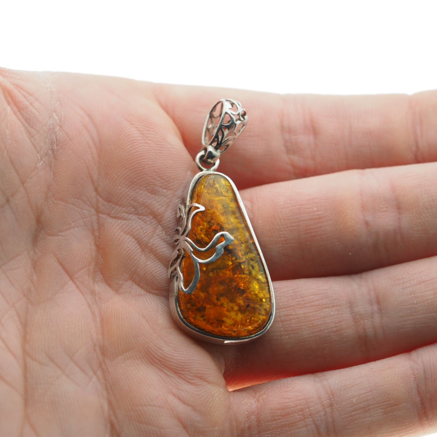 Ręcznie wykonana zawieszka z naturalnego bursztynu bałtyckiego o trójkątnym kształcie. Kamień ma ciepłą, miodowo-złotą tonację i charakterystyczne „łuski”, które nadają mu wyrazistą fakturę oraz efekt głębi. Całość osadzono w srebrnej oprawie, co podkreśla jubilerski, elegancko-naturalny styl biżuterii.