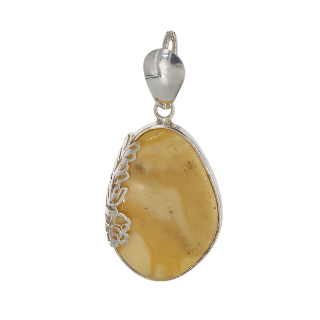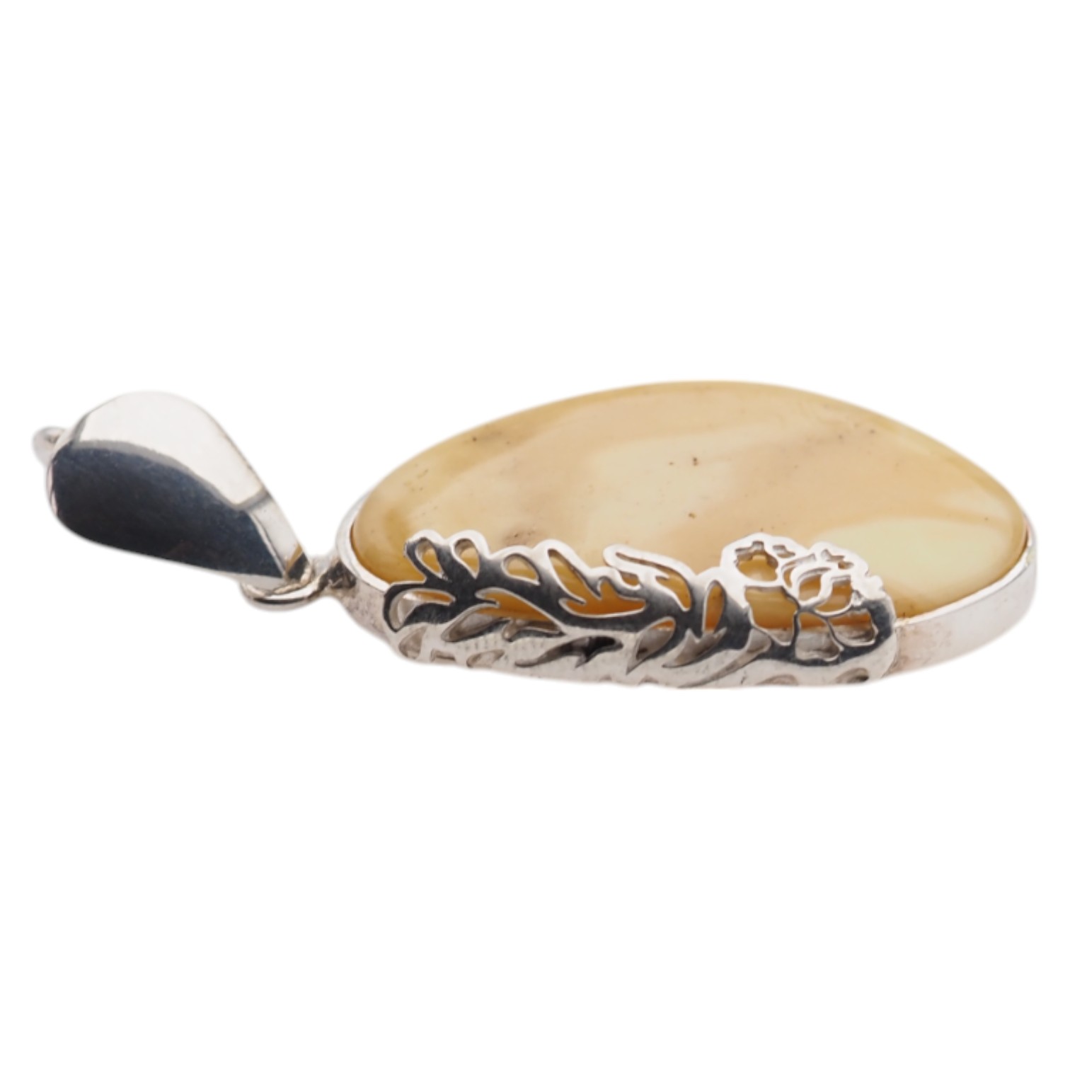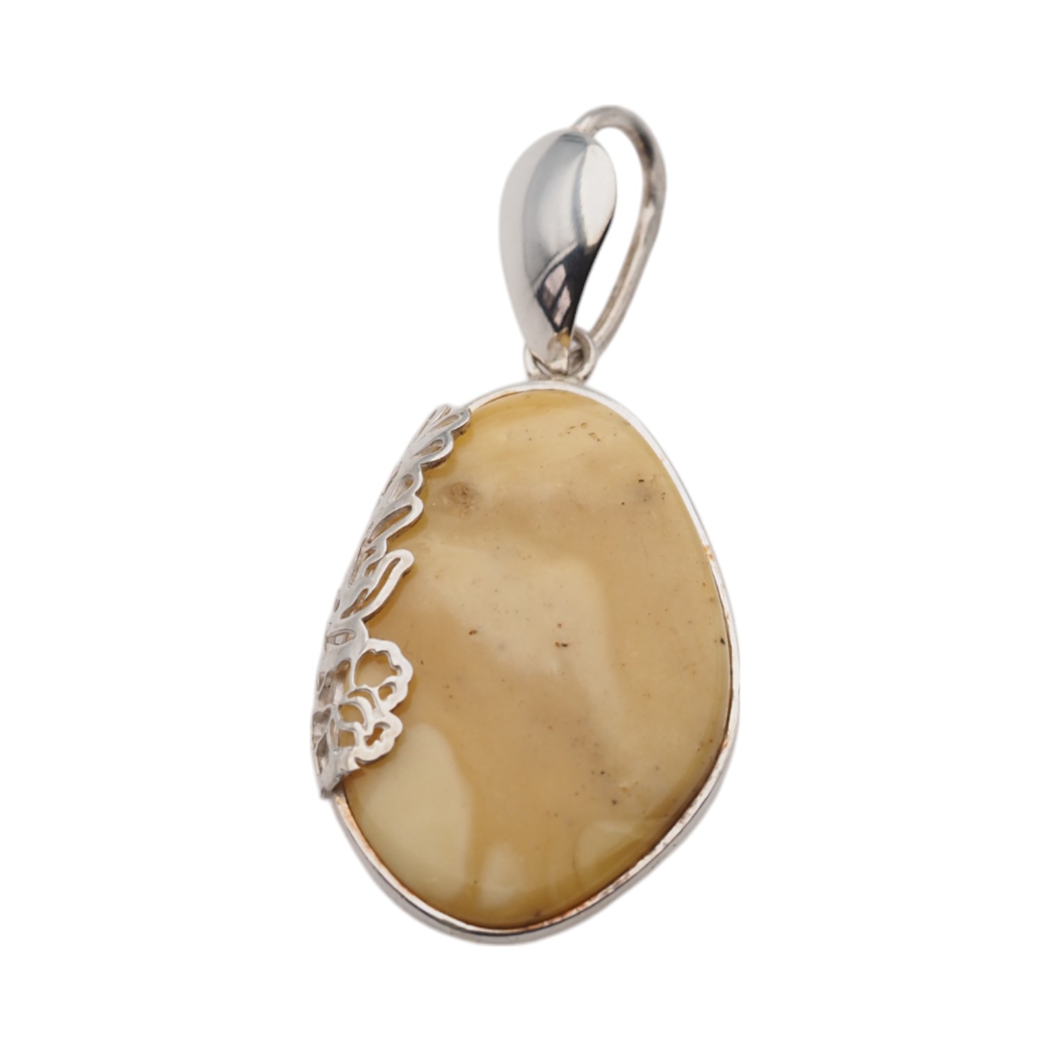 Ręcznie wykonana zawieszka z bursztynem mlecznym wyróżnia się jasną, kremowo-miodową barwą i delikatnie organicznym charakterem kamienia. Naturalny bursztyn osadzono w srebrnej oprawie z motywem kwiatka, co nadaje całości subtelnie dekoracyjny, kobiecy styl.