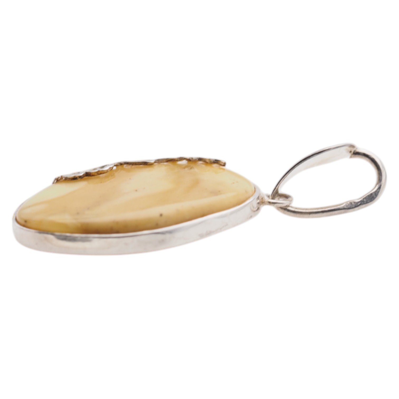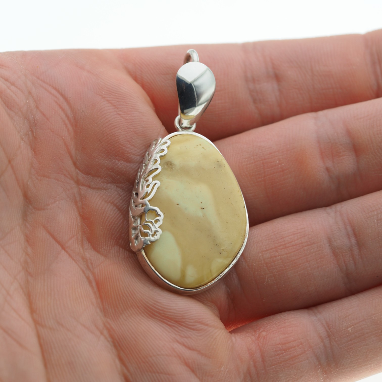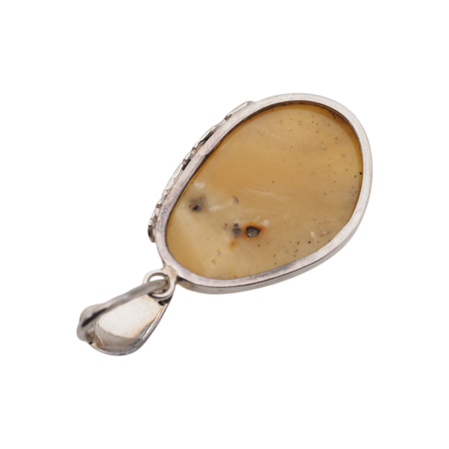 Ręcznie wykonana zawieszka z bursztynem mlecznym wyróżnia się jasną, kremowo-miodową barwą i delikatnie organicznym charakterem kamienia. Naturalny bursztyn osadzono w srebrnej oprawie z motywem kwiatka, co nadaje całości subtelnie dekoracyjny, kobiecy styl.