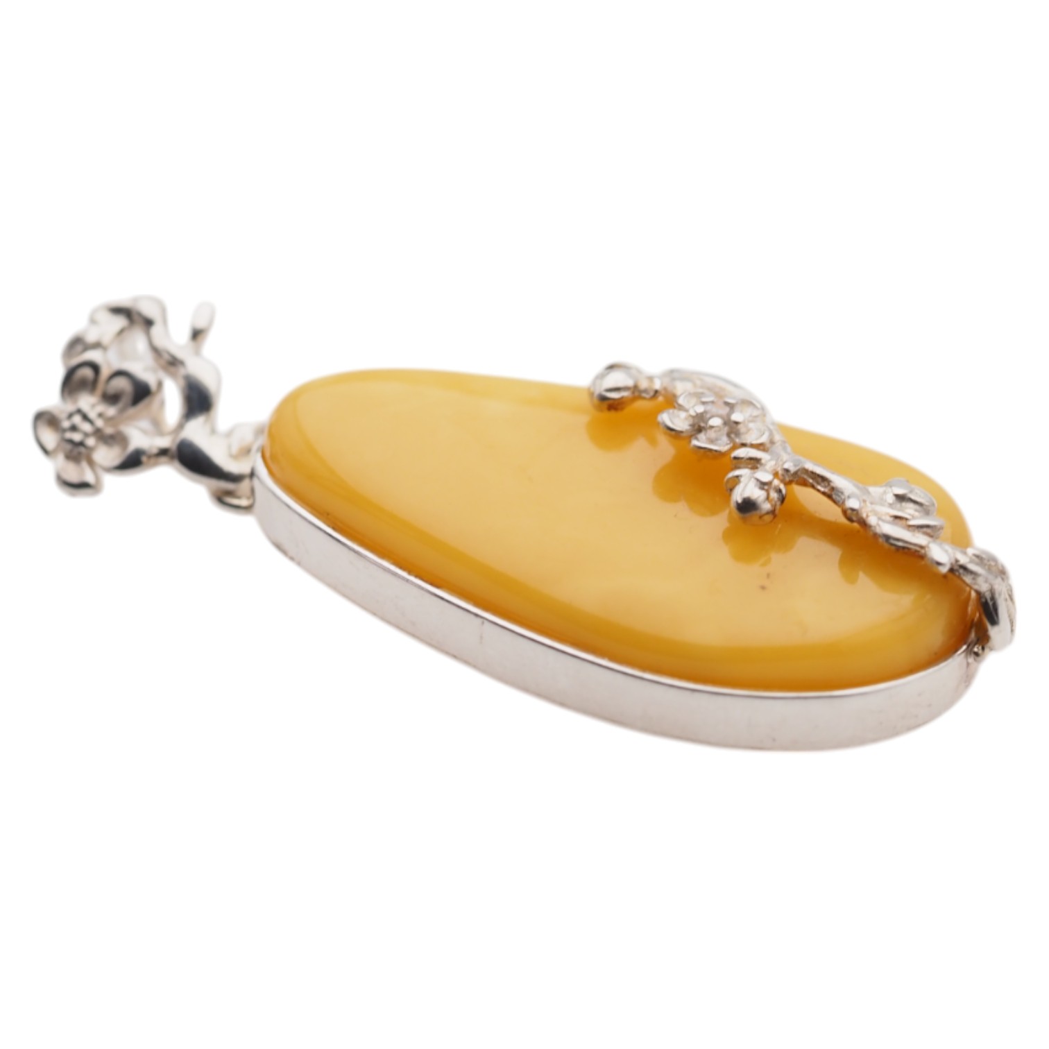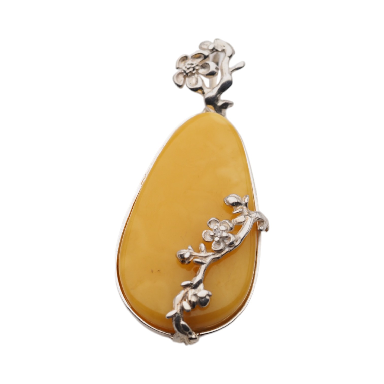 Ręcznie wykonana zawieszka z bursztynem mlecznym w formie łzy przyciąga subtelną, kremowo-miodową tonacją i naturalnym, delikatnie zamglonym charakterem kamienia. Całość osadzona jest w srebrnej oprawie z dekoracyjnym motywem kwiatka, co nadaje biżuterii romantyczny, klasyczny wygląd.