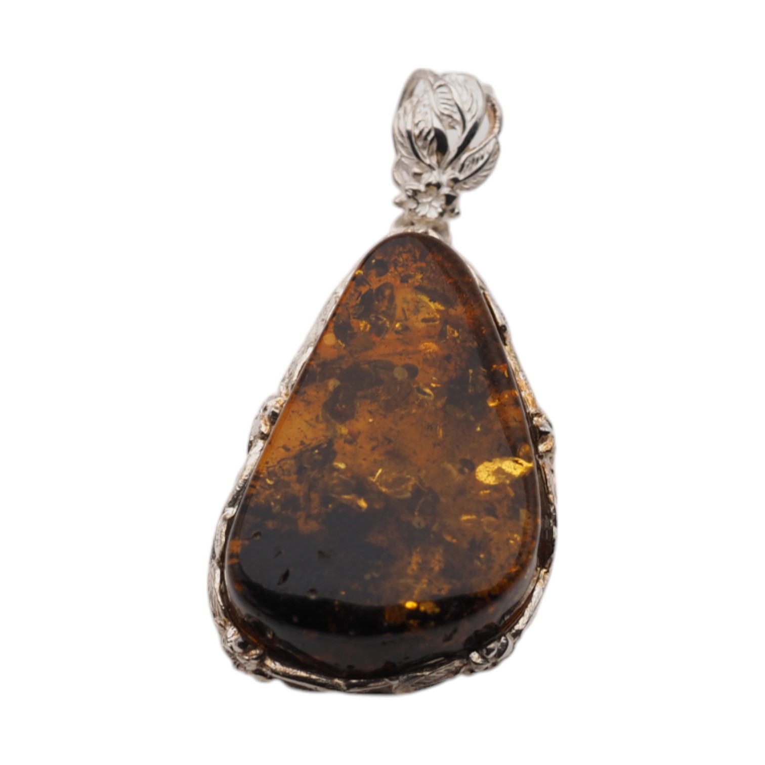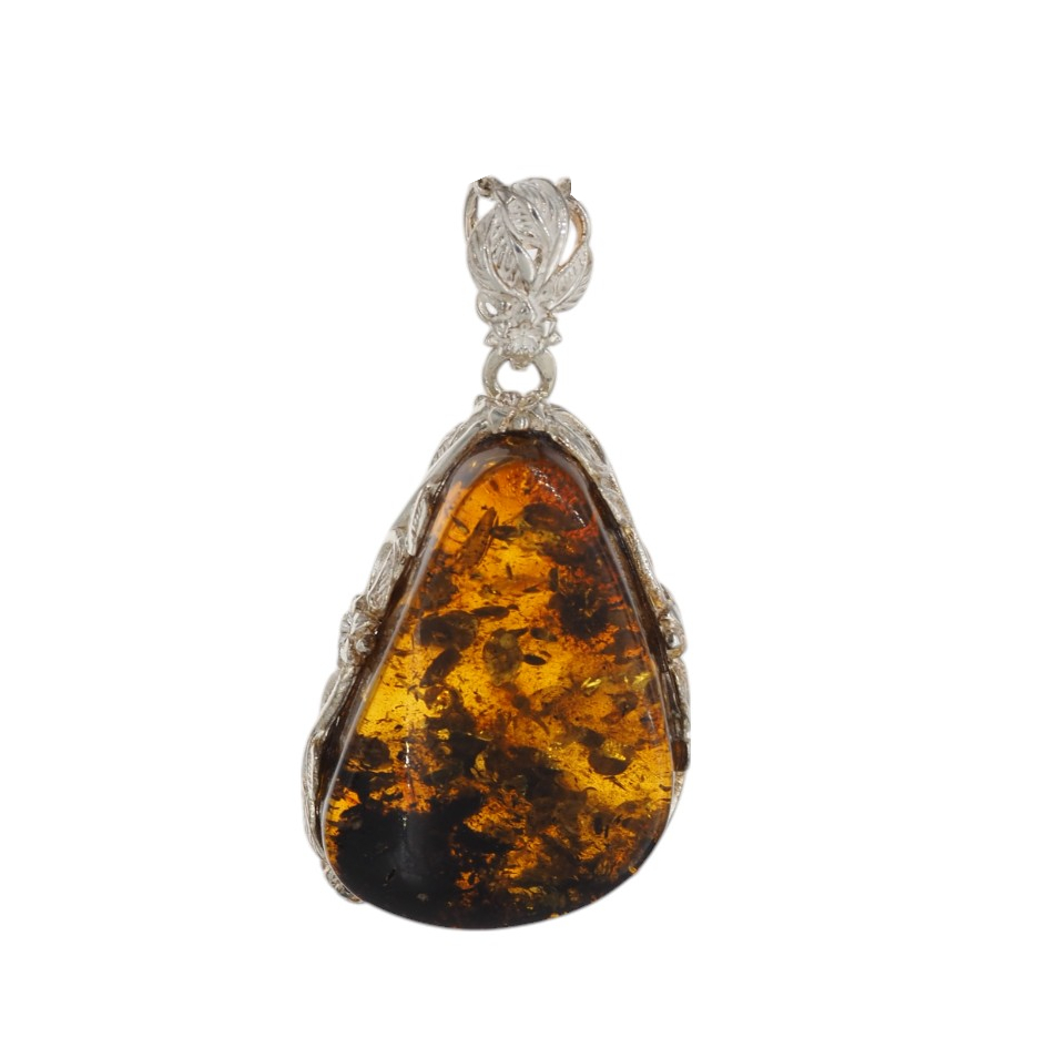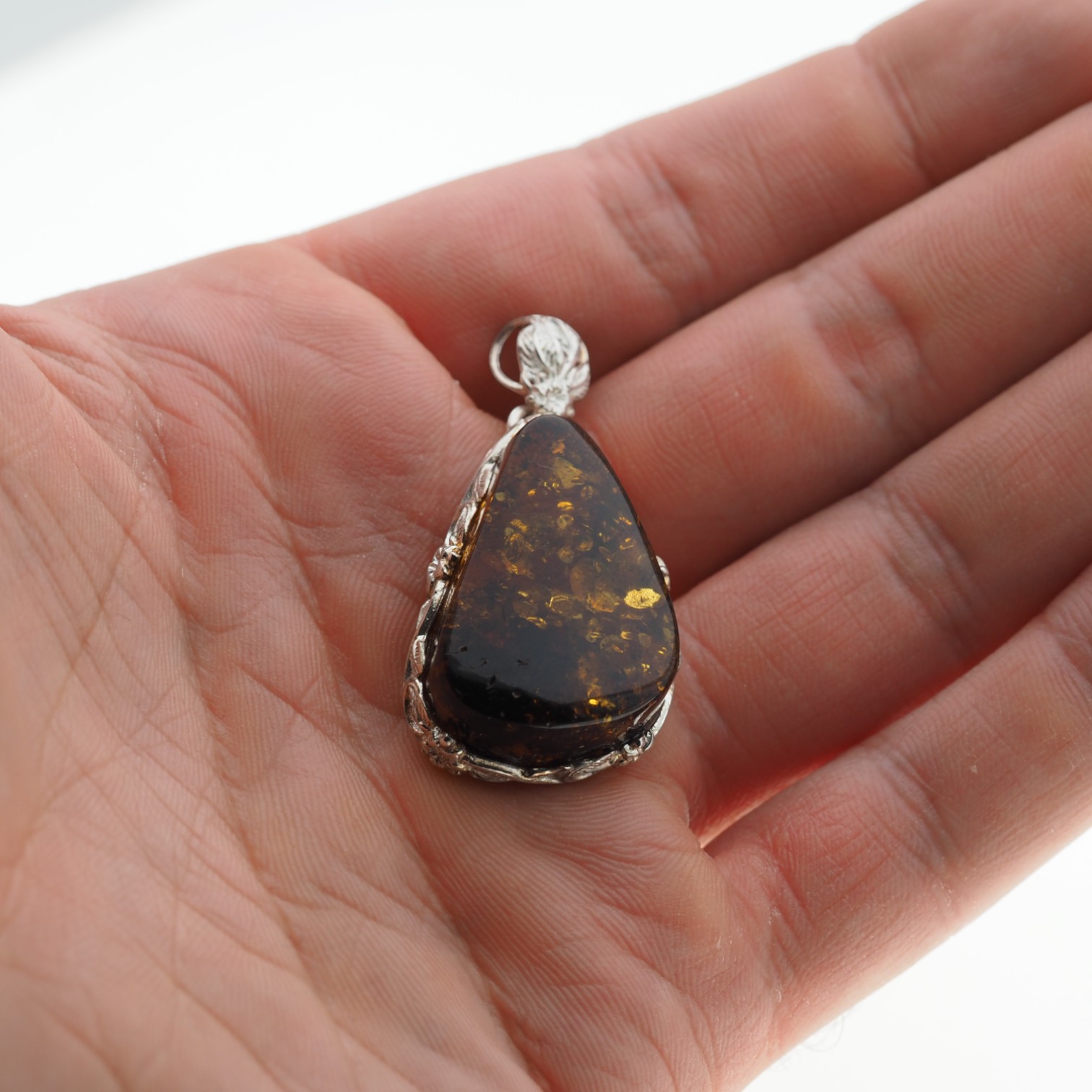 Ręcznie wykonana zawieszka z bursztynem koniakowym z łuskami przyciąga ciepłym, miodowo-brązowym odcieniem i naturalną głębią inkluzji. Kamień ma formę trójkąta, a całość dopełnia srebrna oprawa z dekoracyjnym motywem kwiatów, która nadaje biżuterii bardziej ozdobny, jubilerski charakter.