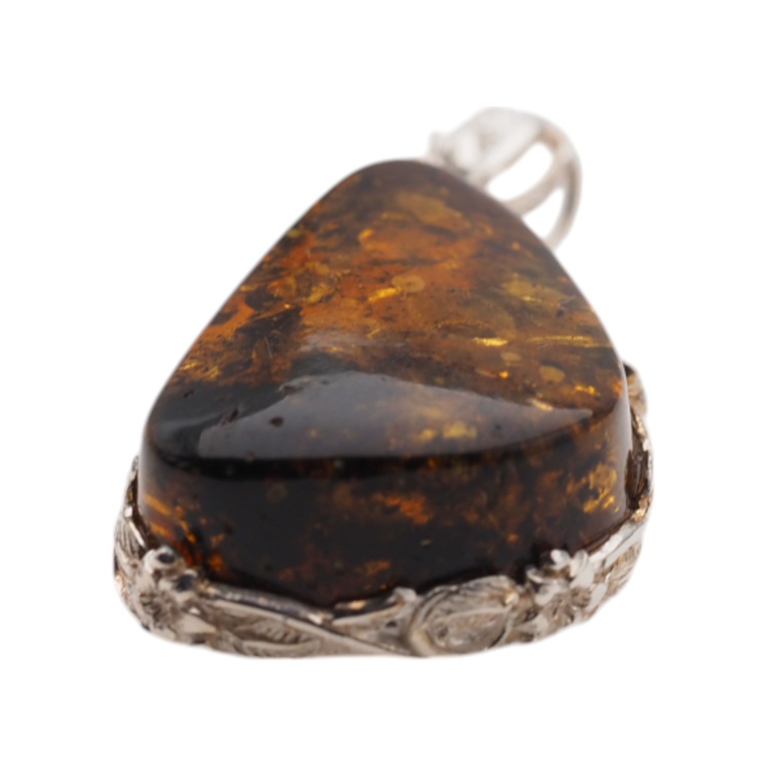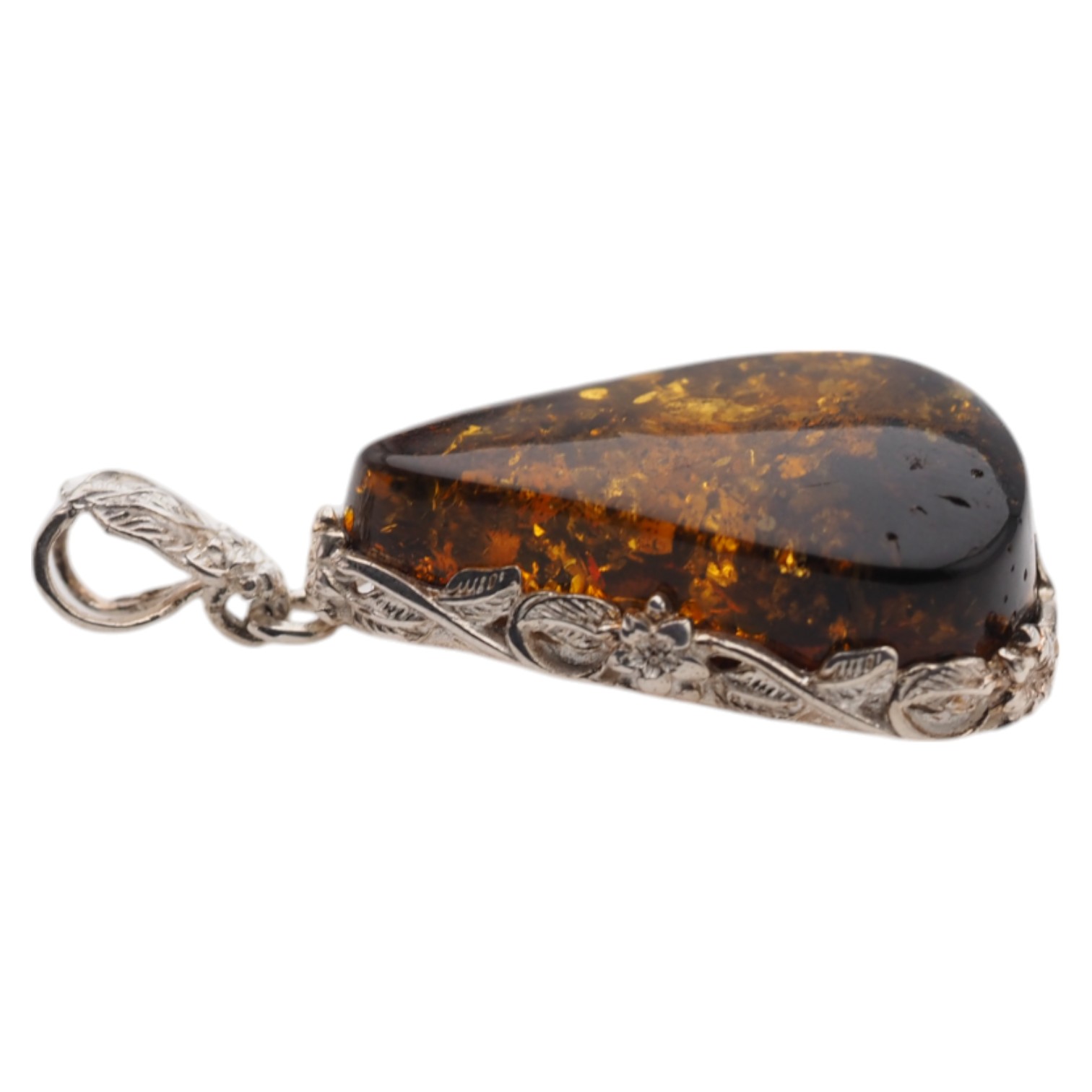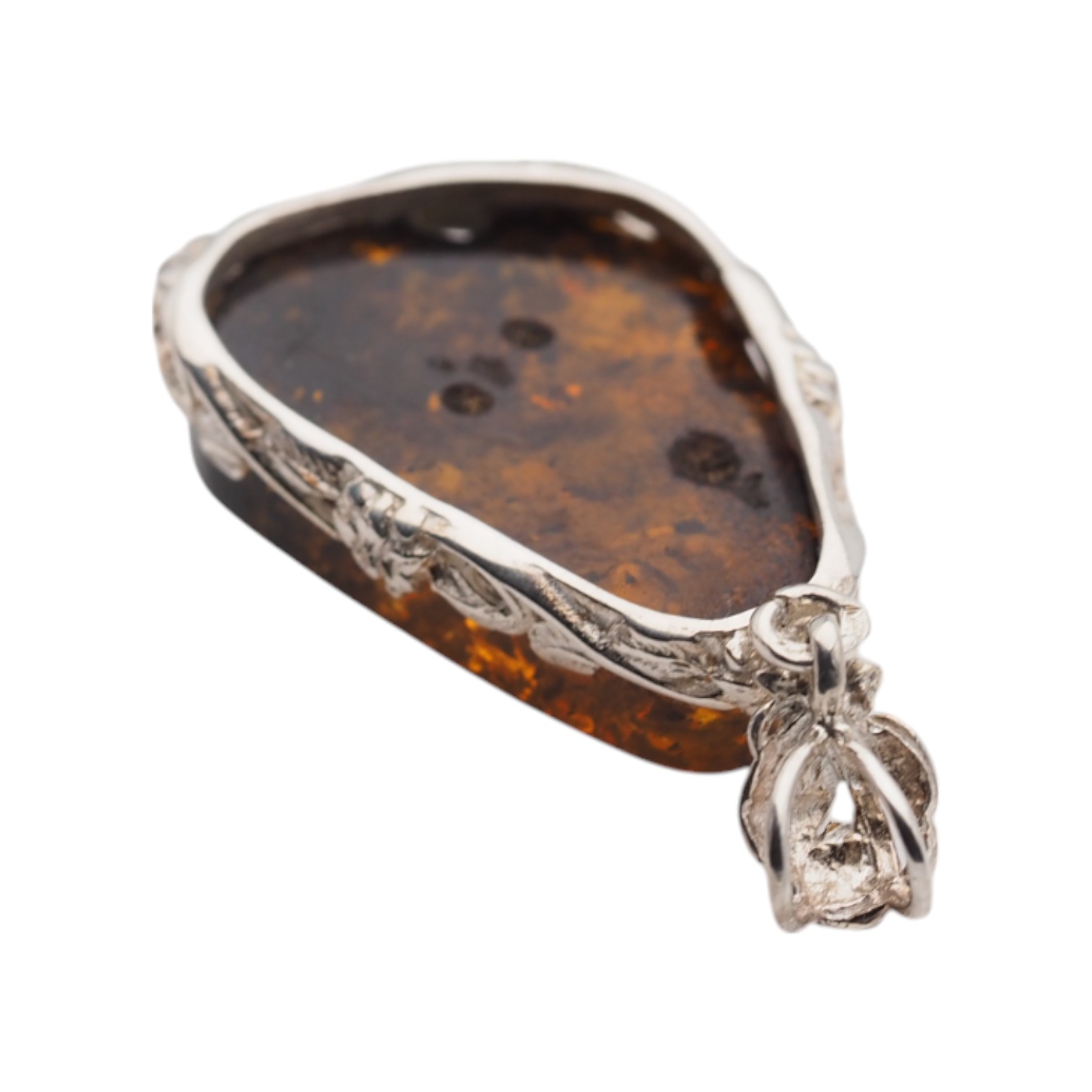 Ręcznie wykonana zawieszka z bursztynem koniakowym z łuskami przyciąga ciepłym, miodowo-brązowym odcieniem i naturalną głębią inkluzji. Kamień ma formę trójkąta, a całość dopełnia srebrna oprawa z dekoracyjnym motywem kwiatów, która nadaje biżuterii bardziej ozdobny, jubilerski charakter.