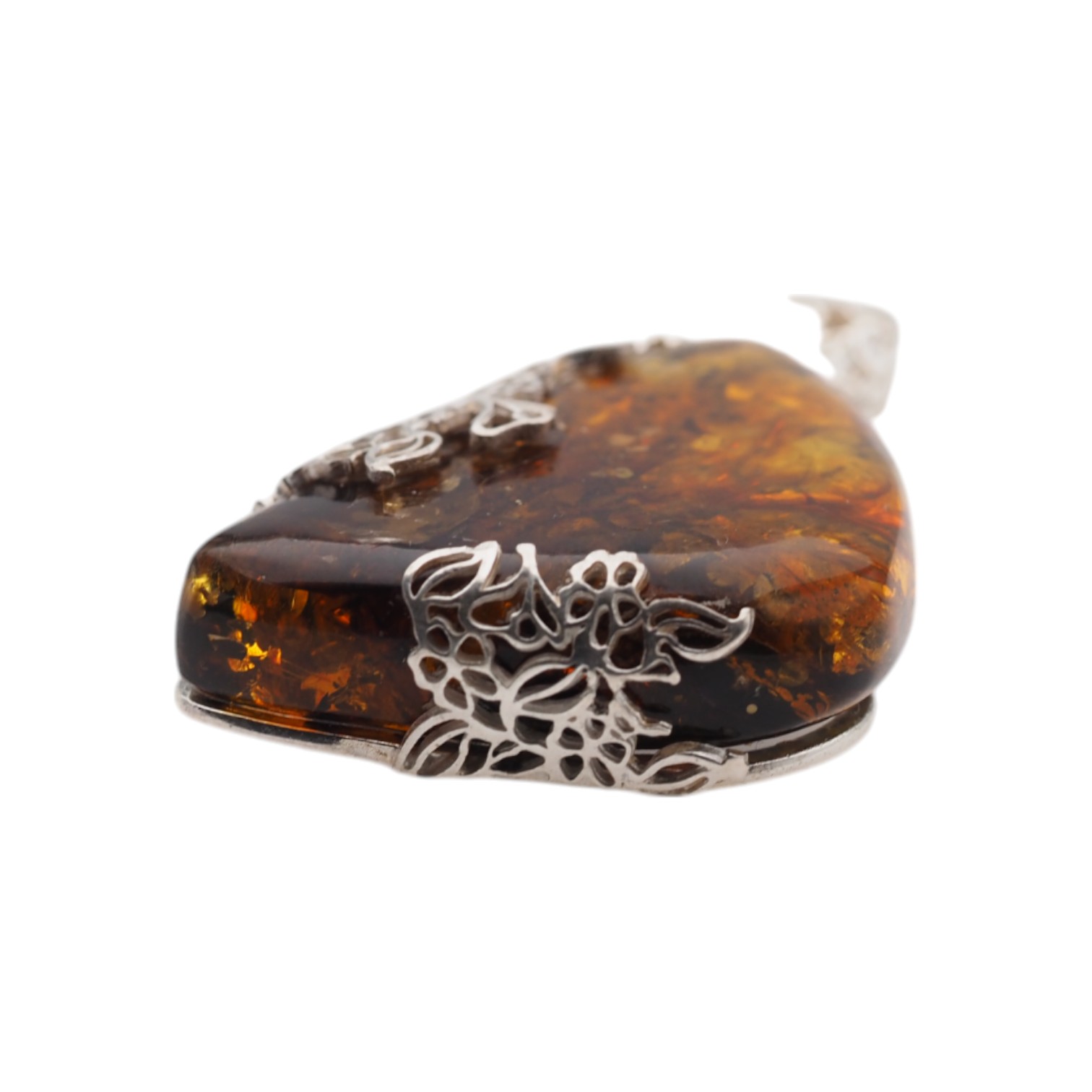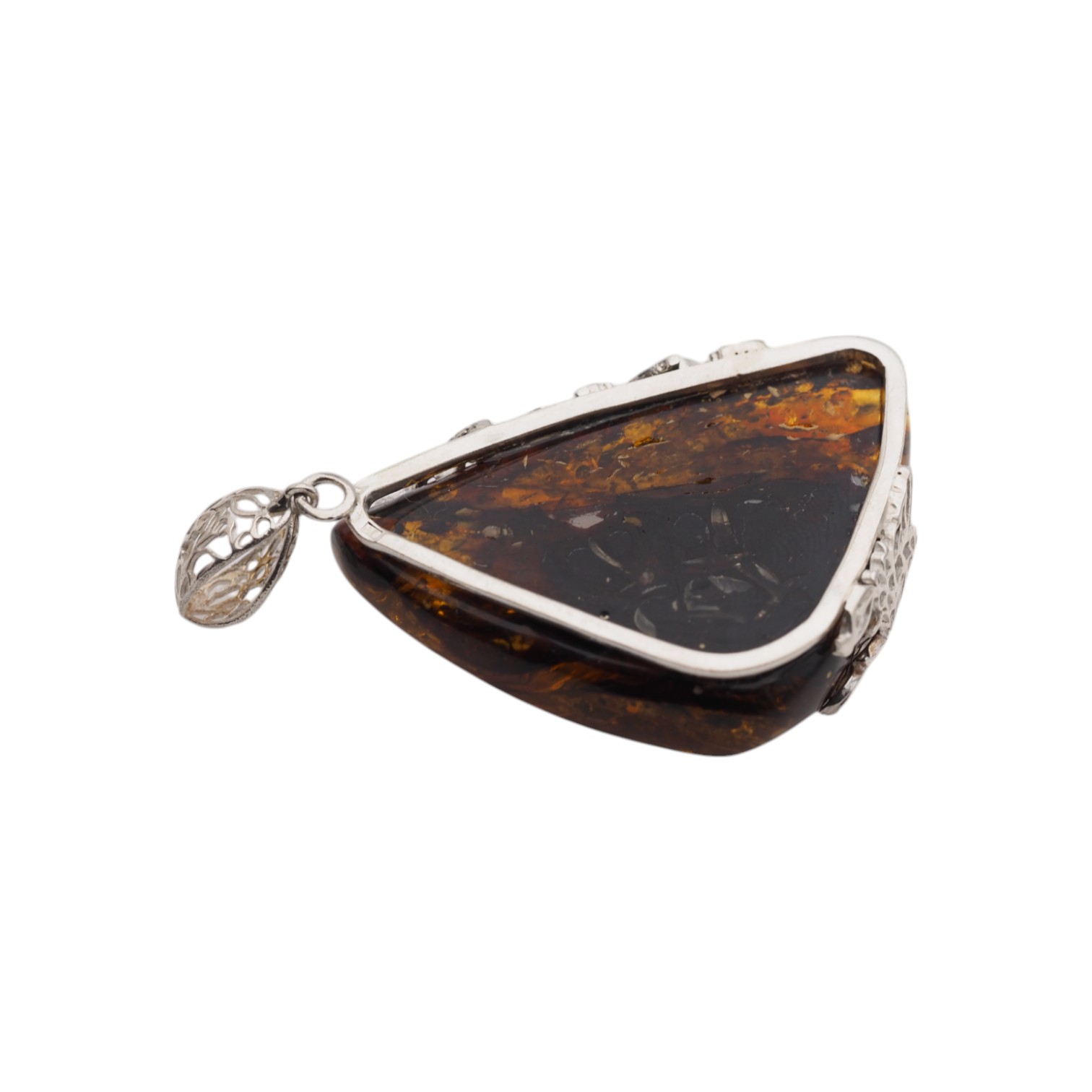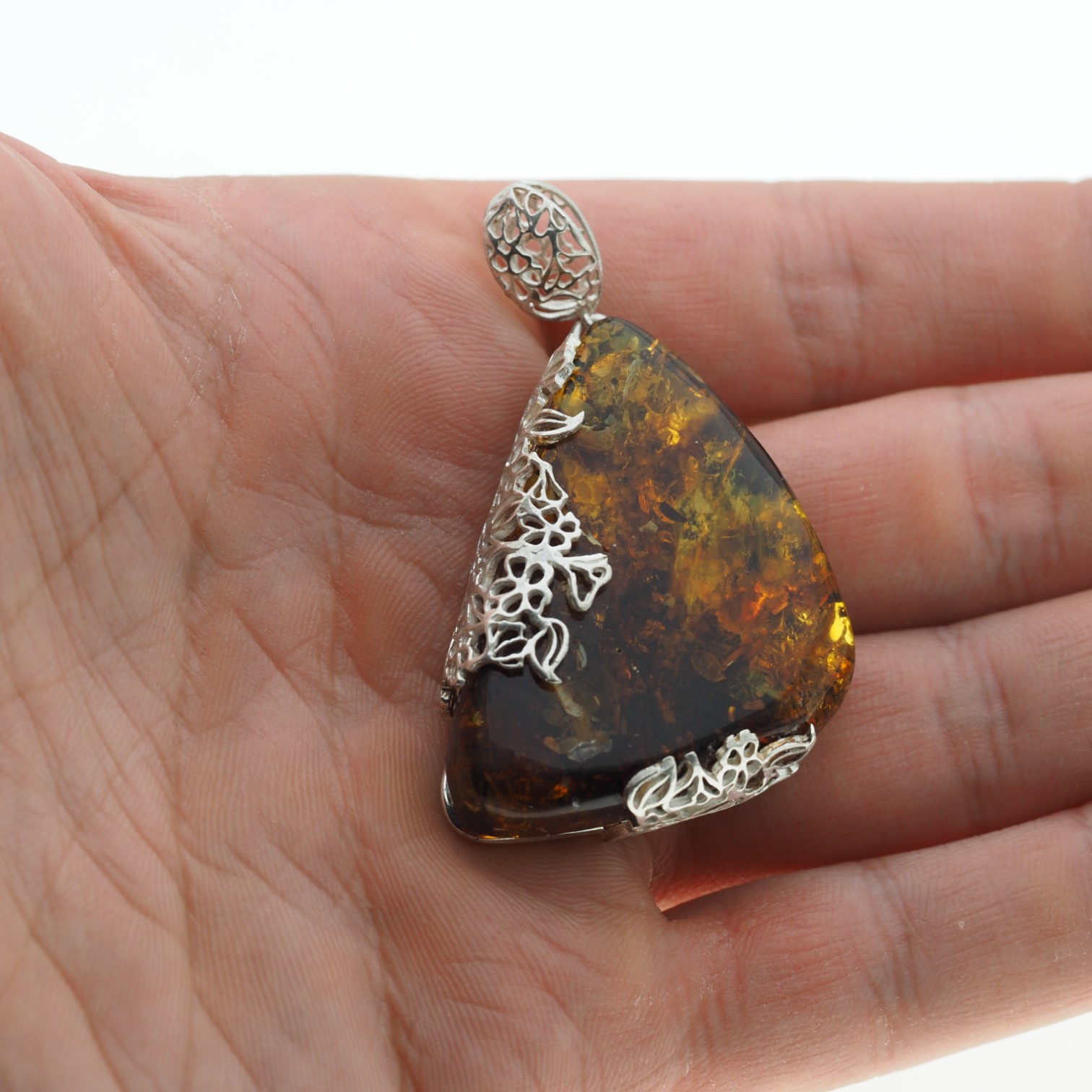 Ręcznie wykonana zawieszka z bursztynem koniakowym z widocznymi łuskami przyciąga ciepłym, miodowo-brązowym odcieniem i naturalną głębią. Kamień ma formę trójkąta, a całość osadzono w srebrnej oprawie z dekoracyjnym motywem kwiatów, co nadaje biżuterii bardziej ozdobny, jubilerski charakter.