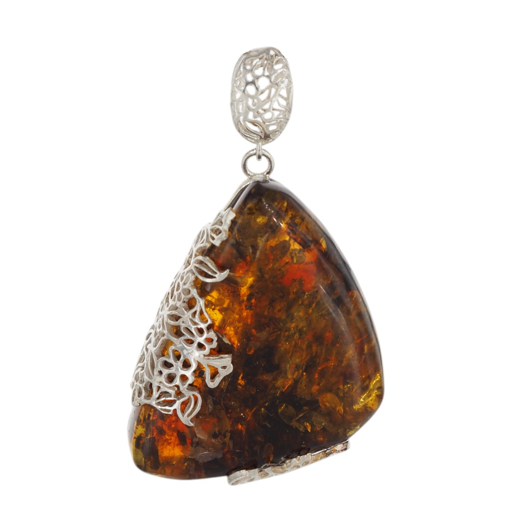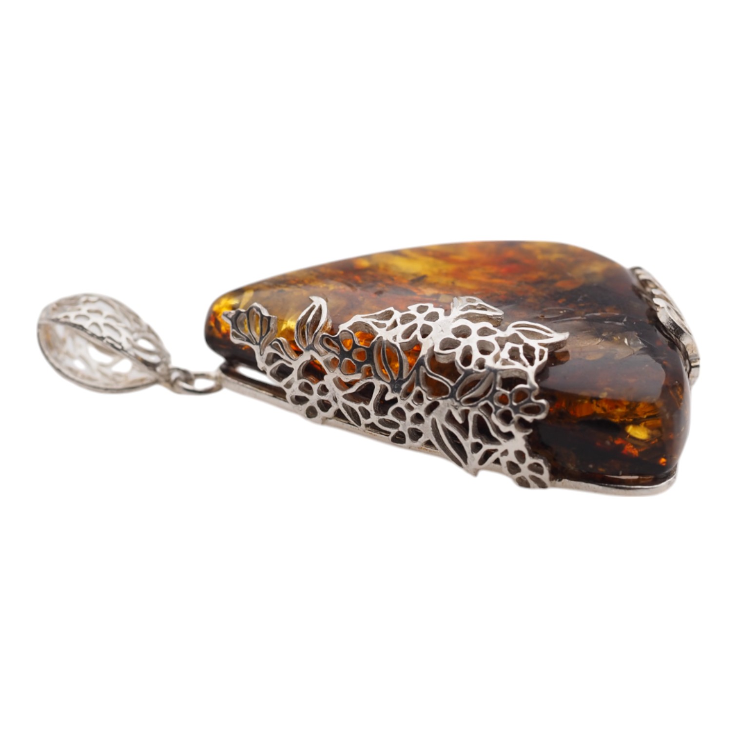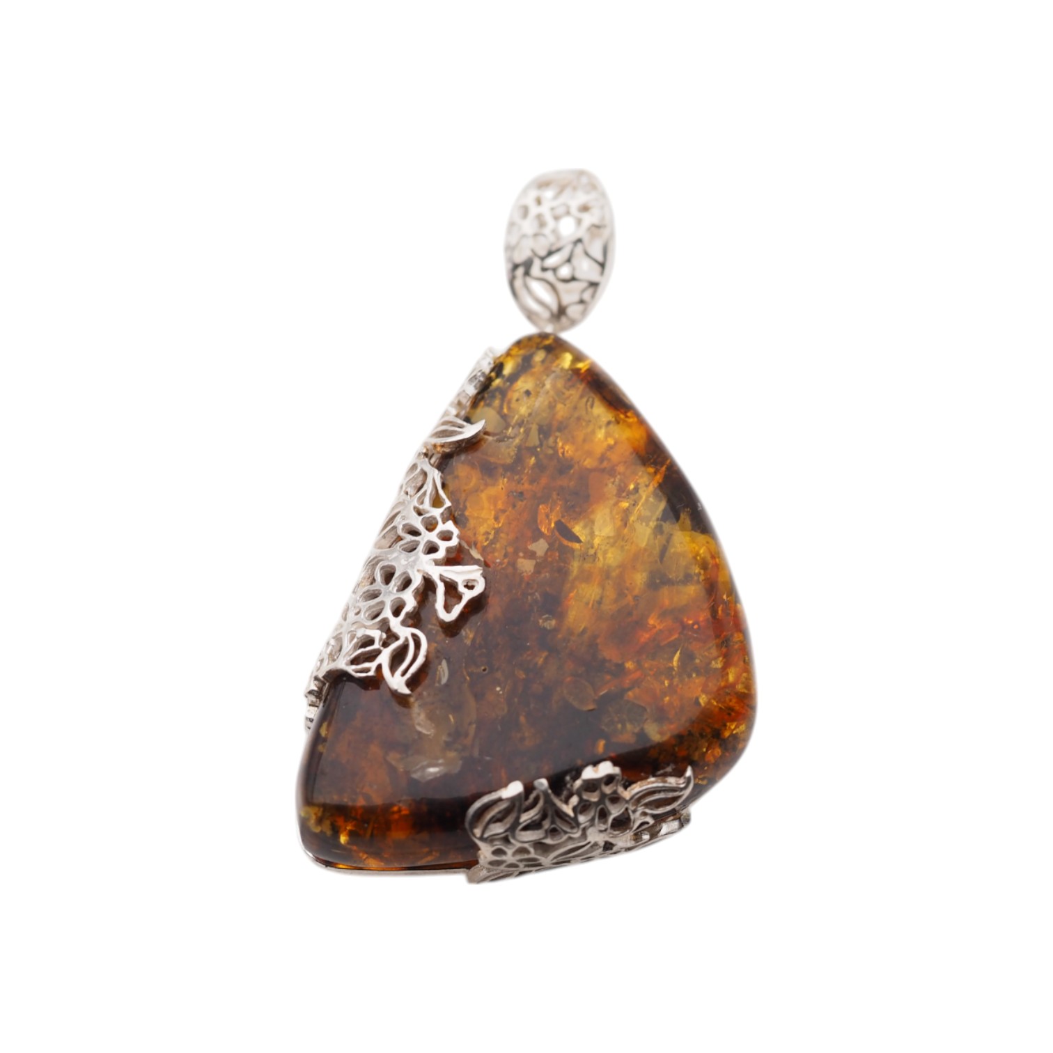 Ręcznie wykonana zawieszka z bursztynem koniakowym z widocznymi łuskami przyciąga ciepłym, miodowo-brązowym odcieniem i naturalną głębią. Kamień ma formę trójkąta, a całość osadzono w srebrnej oprawie z dekoracyjnym motywem kwiatów, co nadaje biżuterii bardziej ozdobny, jubilerski charakter.