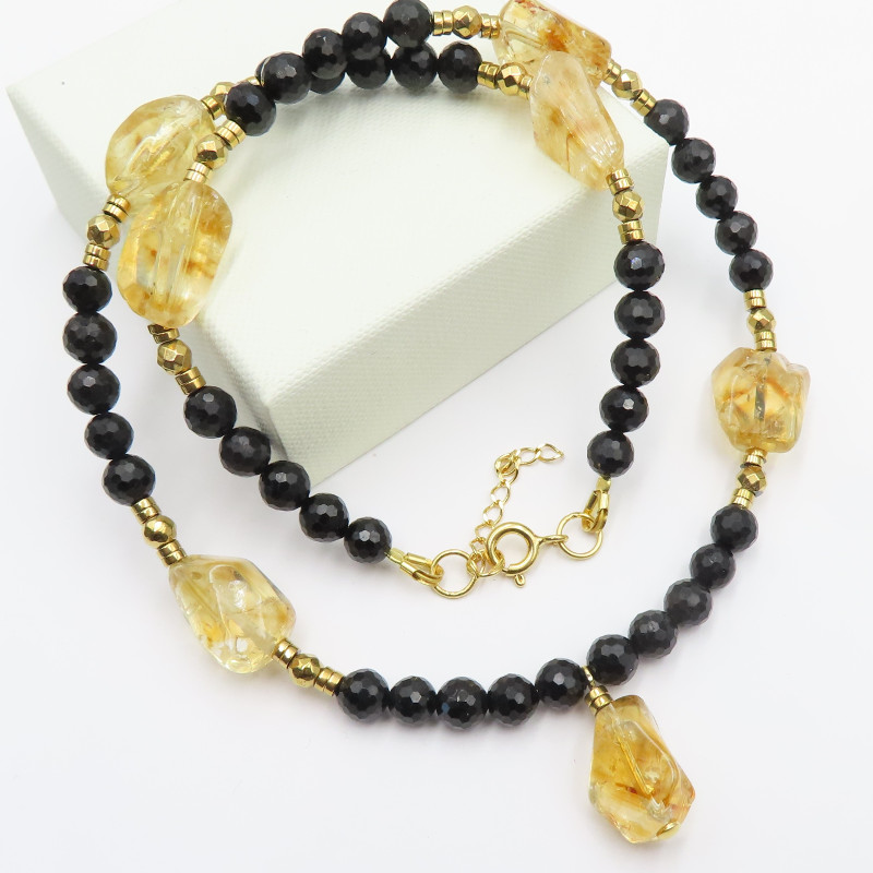 Naszyjnik Mix Kamieni to delikatna kompozycja naturalnych barw i eleganckiego blasku: ciepły odcień cytrynu łączy się z głęboką czernią turmalinu, a całość dopełnia hematyt złocony oraz oprawa w srebrze złoconym 24K (próba 925). Zestawienie kontrastów sprawia, że biżuteria wygląda nowocześnie, ale pozostaje ponadczasowa.