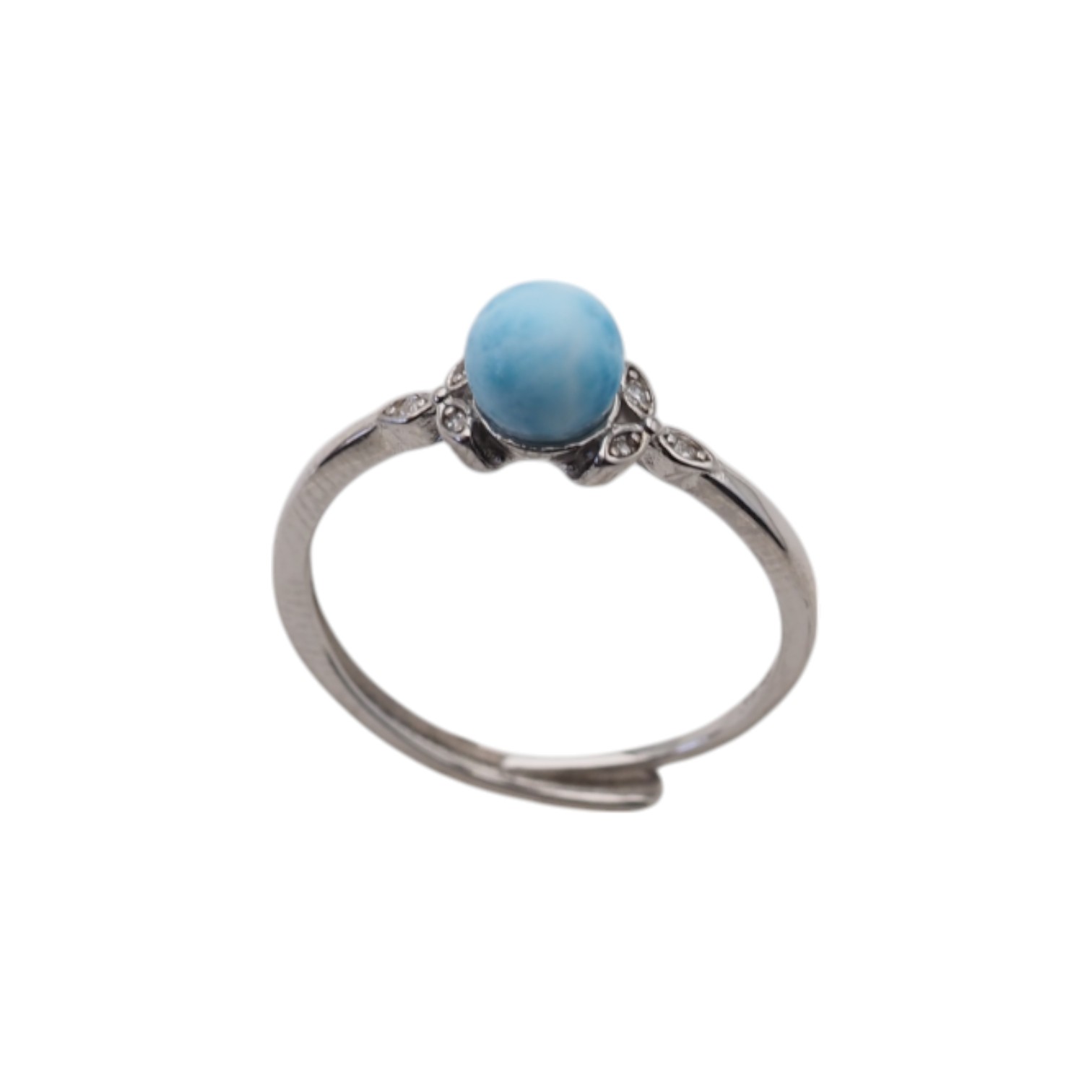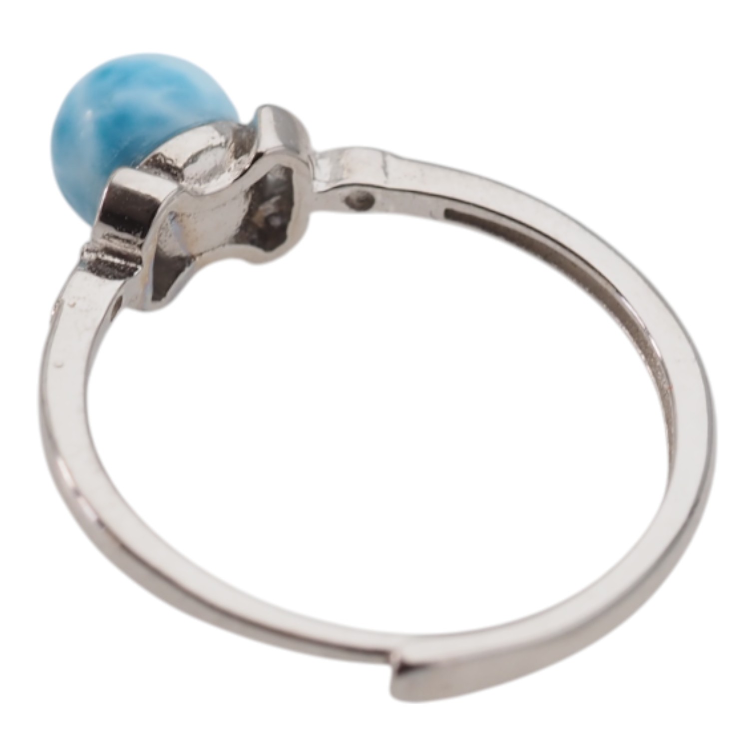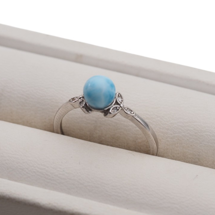 Regulowany pierścionek z naturalnym larimarem przyciąga wzrok jasnoniebieską barwą kamienia i jego gładką, kulistą formą. Srebrna oprawa z rodowanego srebra próby 925 nadaje całości chłodny, elegancki charakter i podkreśla „morski” odcień minerału.