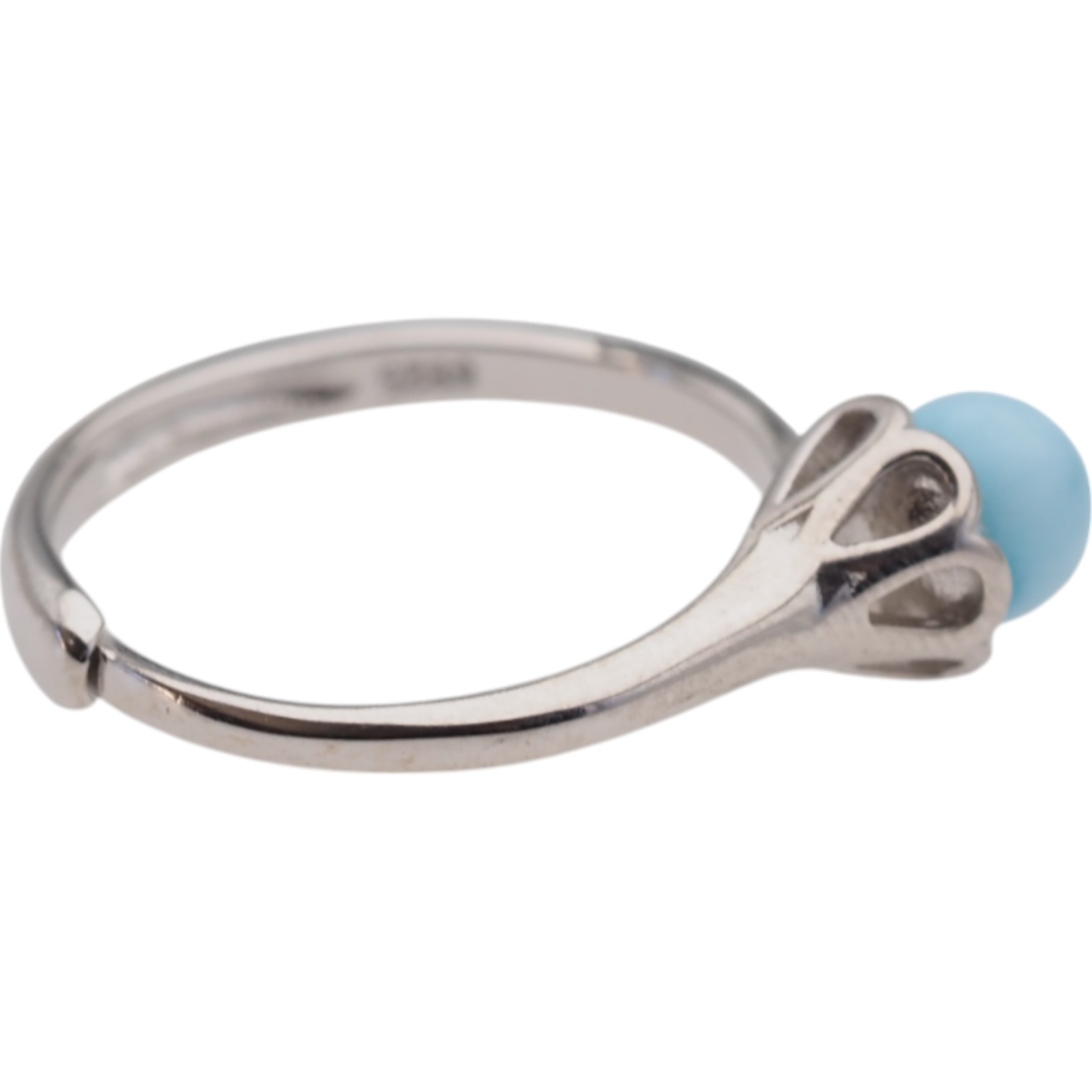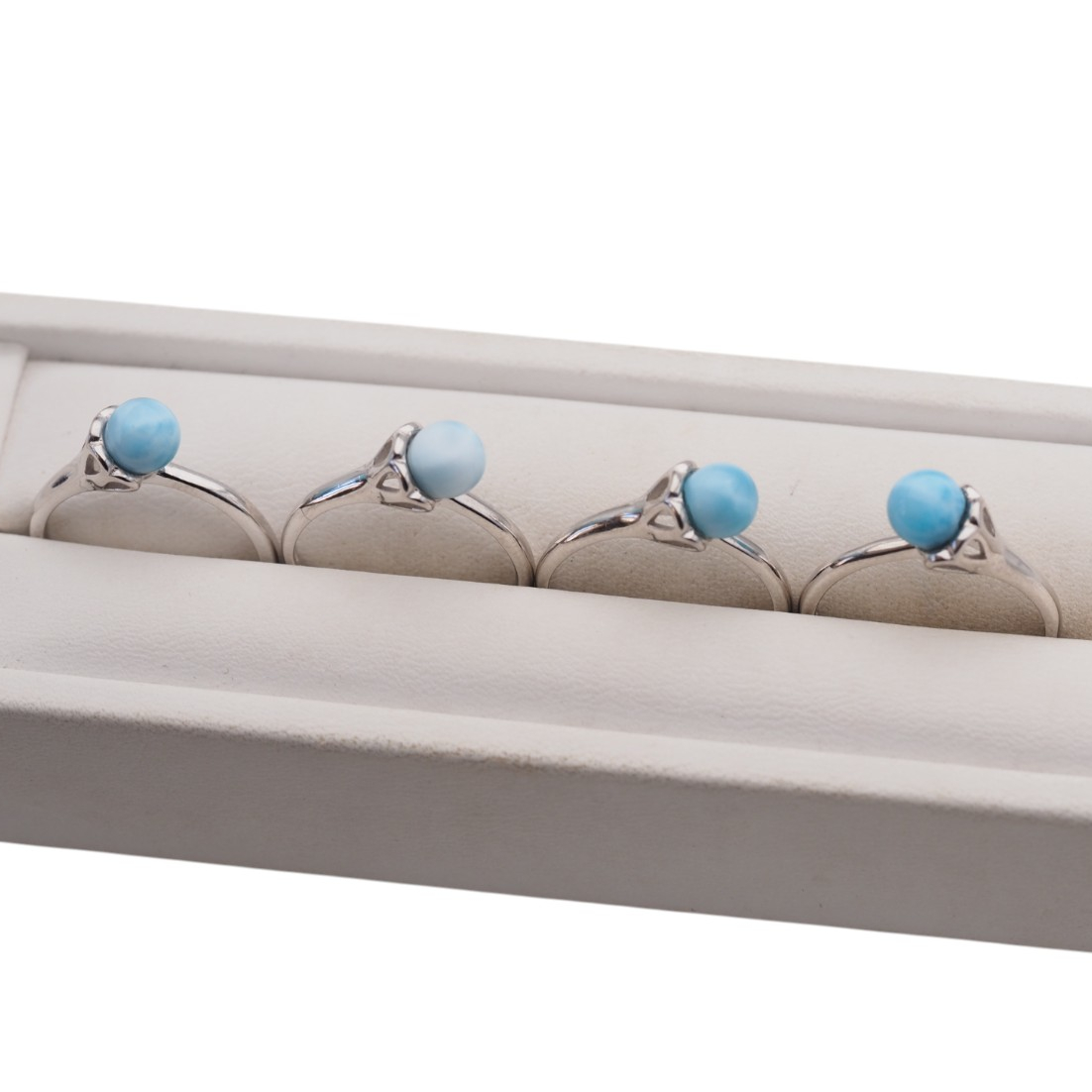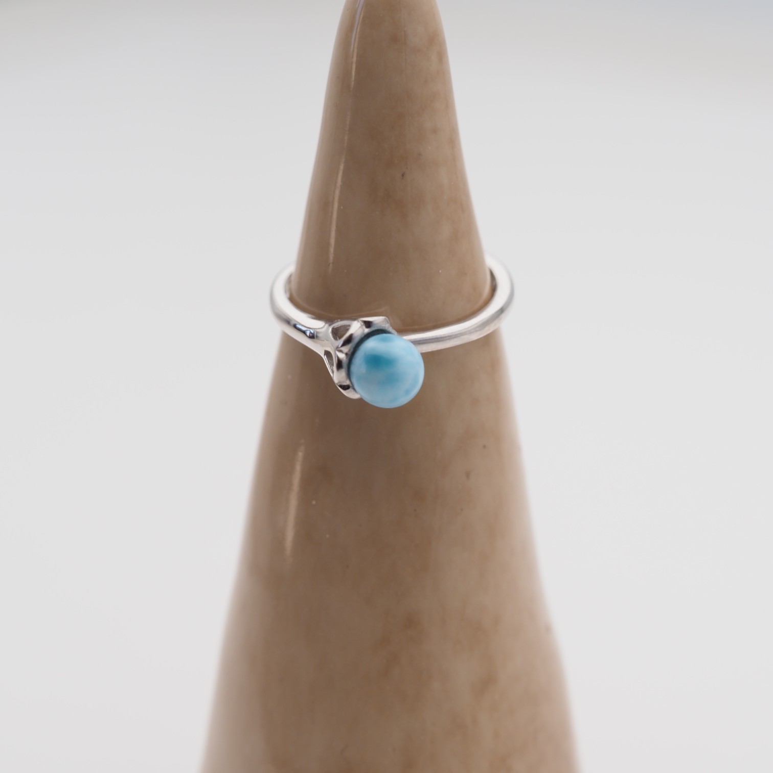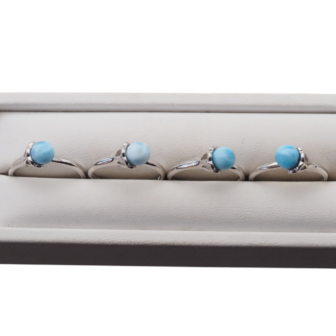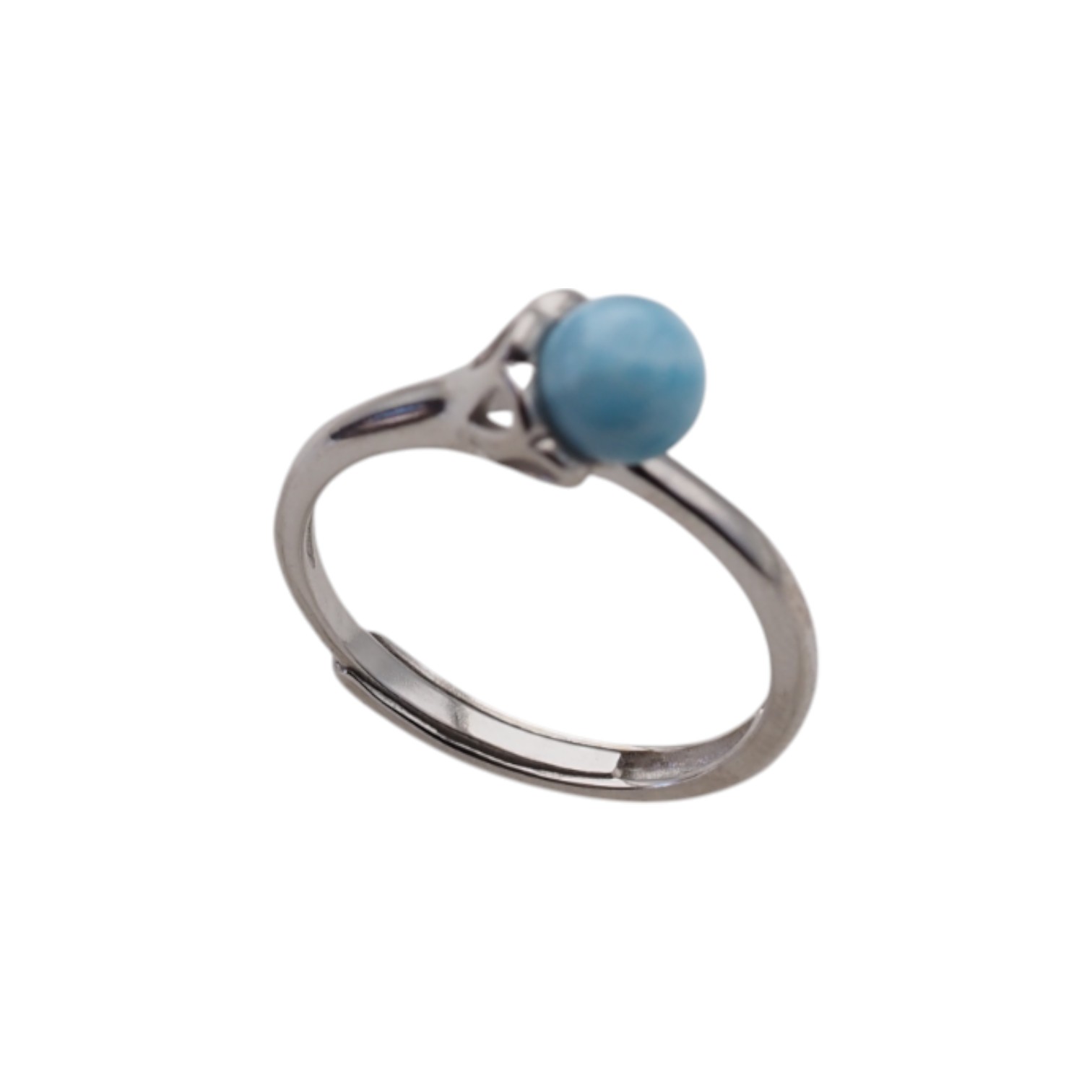 Regulowany pierścionek z naturalnym larimarem w formie gładkiej kulki przyciąga uwagę jasnym, morsko-błękitnym odcieniem kamienia. Całość osadzono w srebrnej oprawie, co daje elegancki, czysty efekt i podkreśla naturalny charakter minerału.