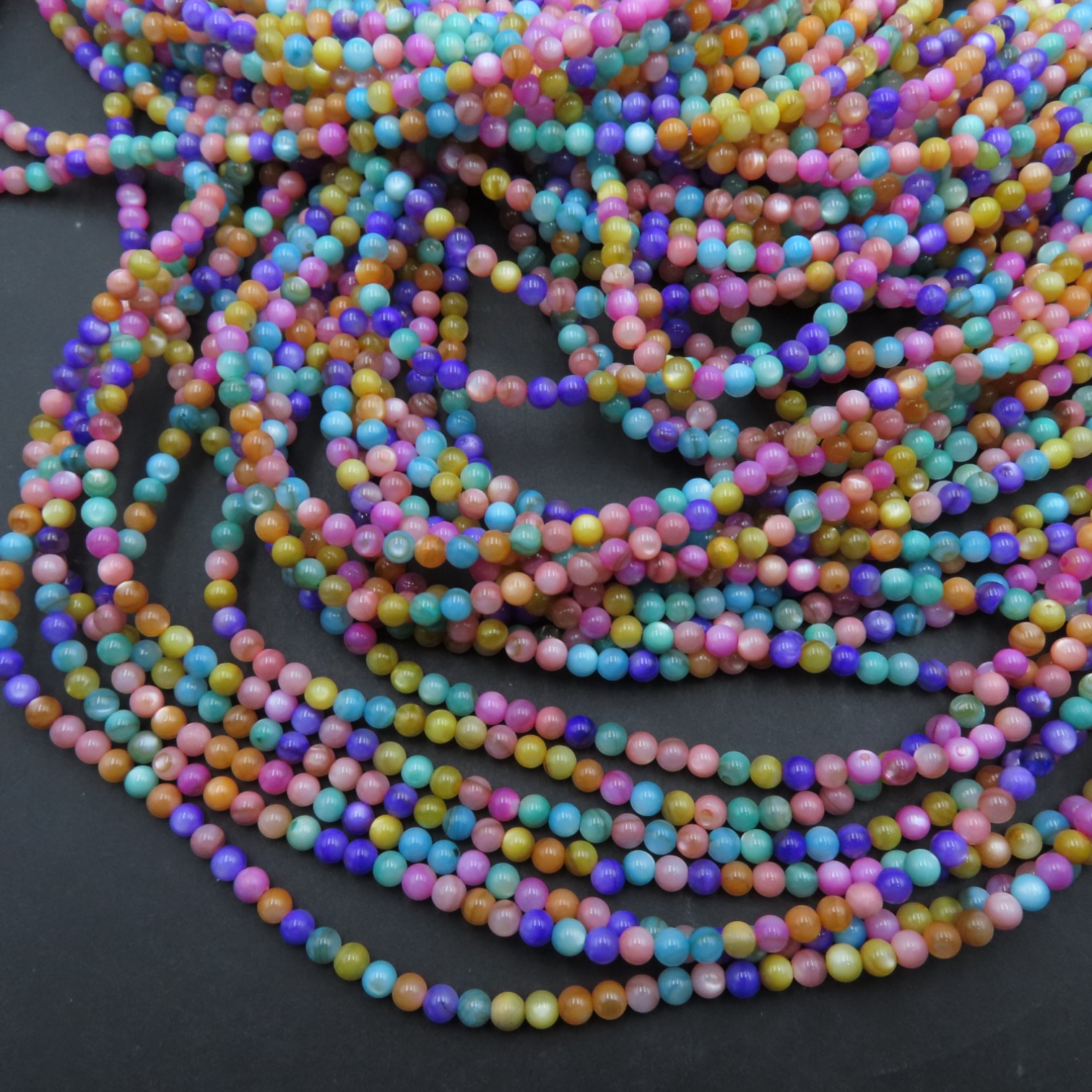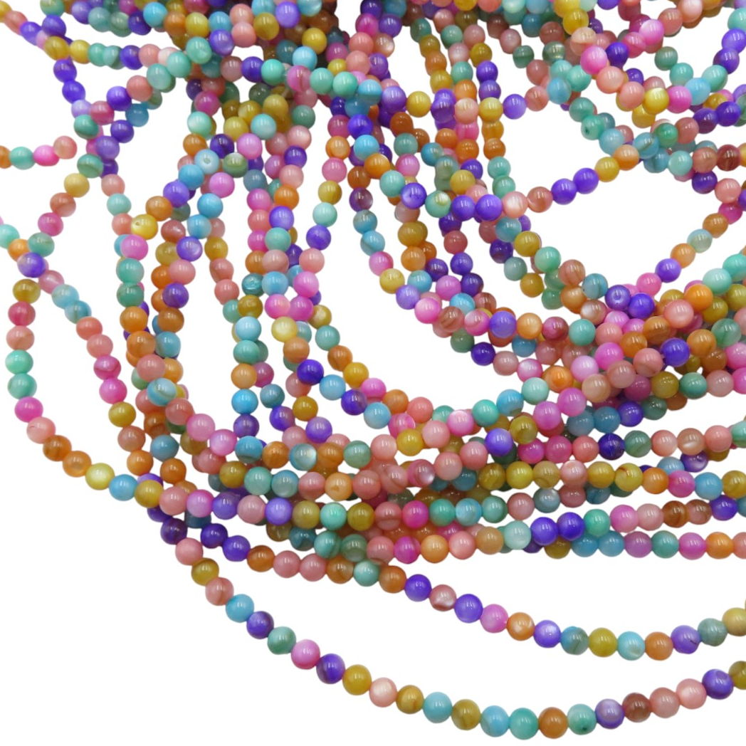 Naturalna, kolorowa muszla w formie polerowanych kulek to koraliki o wyraźnym, perłowo-mieniącym się charakterze. Gładkie wykończenie podkreśla wielobarwność i nadaje elementom elegancki, „biżuteryjny” połysk.