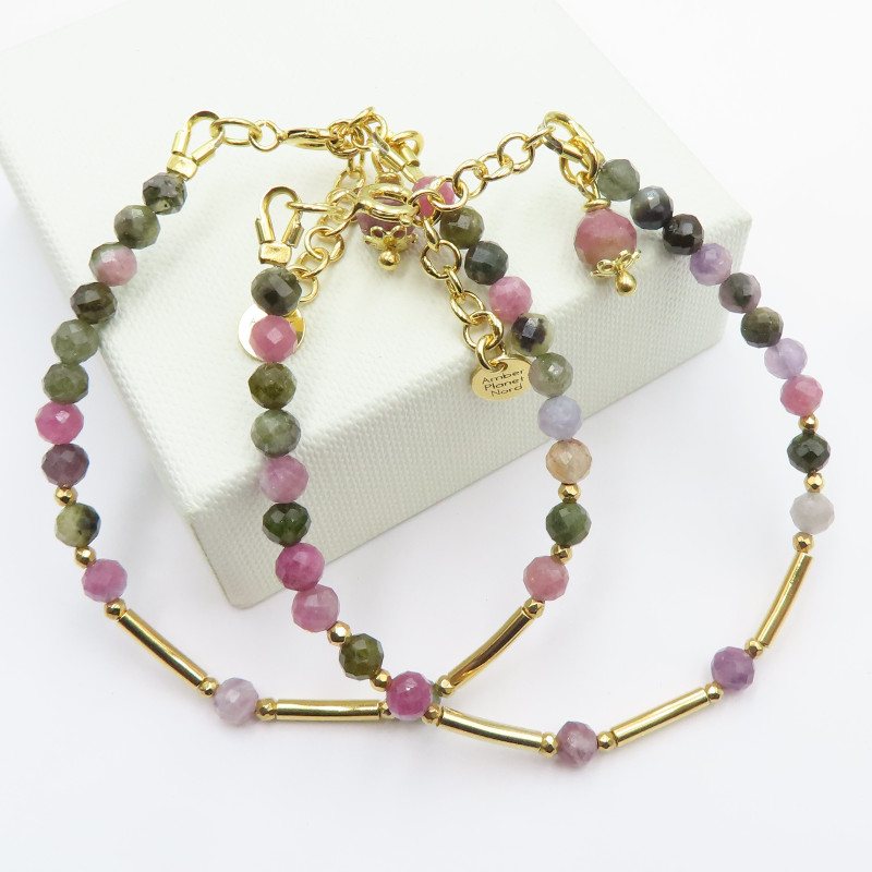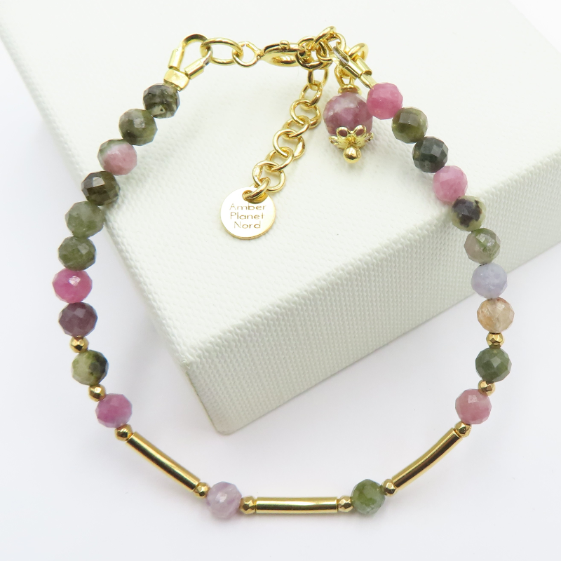 Bransoletka z kolorowego turmalinu i złotego hematytu przyciąga uwagę wielobarwnym, naturalnym rysunkiem kamieni. Zestawienie barw turmalinu z ciepłym połyskiem hematytu tworzy elegancki, a jednocześnie lekki wizualnie efekt. Całość dopełnia zapięcie ze srebra złoconego 24K (próba 925).