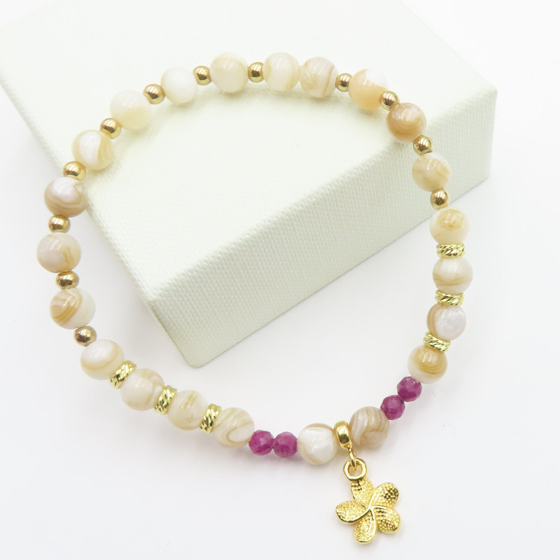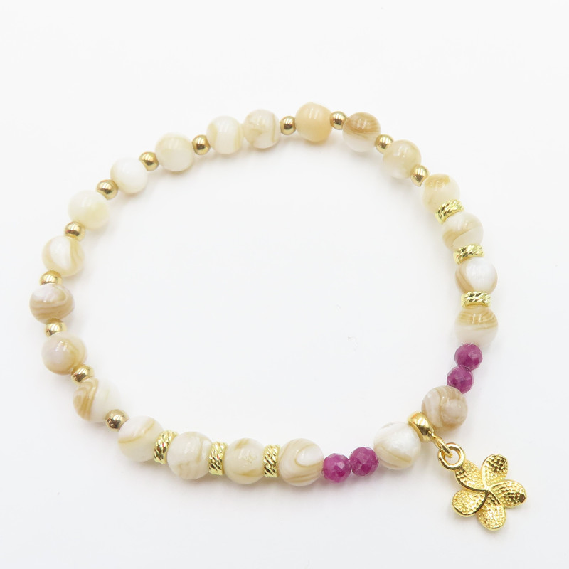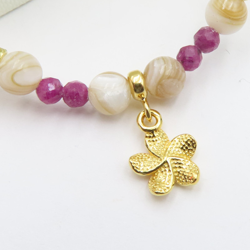 Bransoletka z naturalnym, lekkim akcentem muszli i fasetowanego rubinu, przełamana połyskiem hematytu. Całość uzupełnia srebro złocone 24K (próba 925) oraz delikatna zawieszka w kształcie kwiatka, która dodaje kompozycji subtelnie dekoracyjnego charakteru.