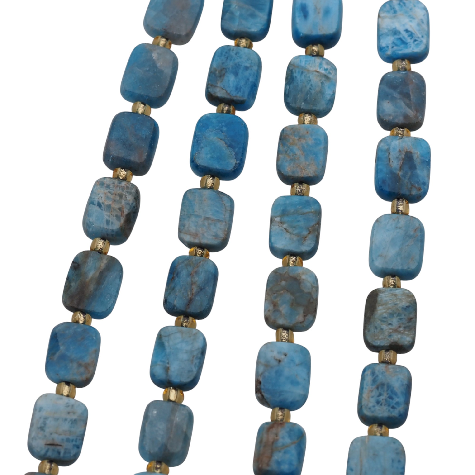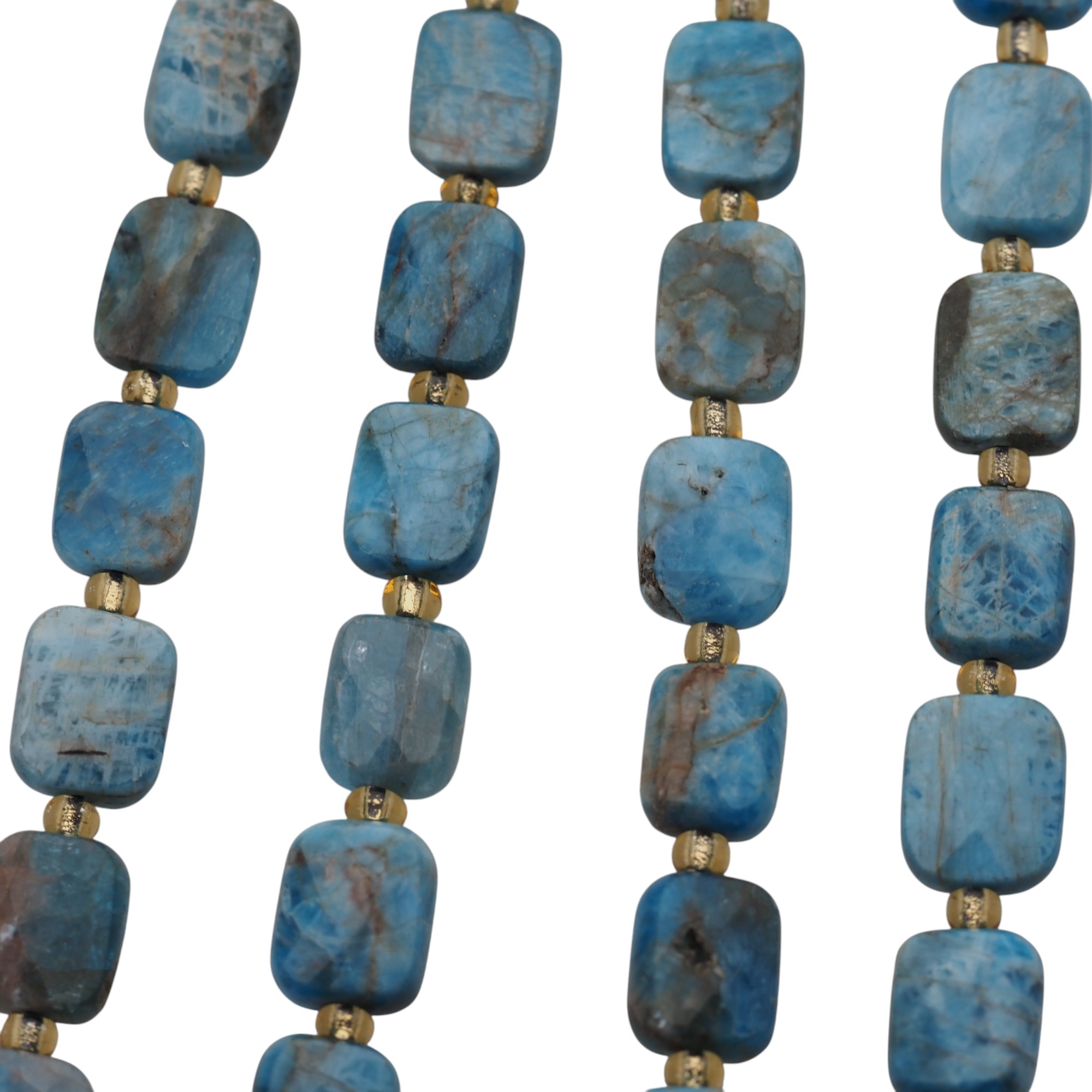 Naturalny apatyt w formie fasetowanych prostokątów to kamień o wyrazistym, eleganckim charakterze. Szlif fasetowany podkreśla grę światła na powierzchni, dzięki czemu elementy prezentują się efektownie zarówno w świetle dziennym, jak i sztucznym.