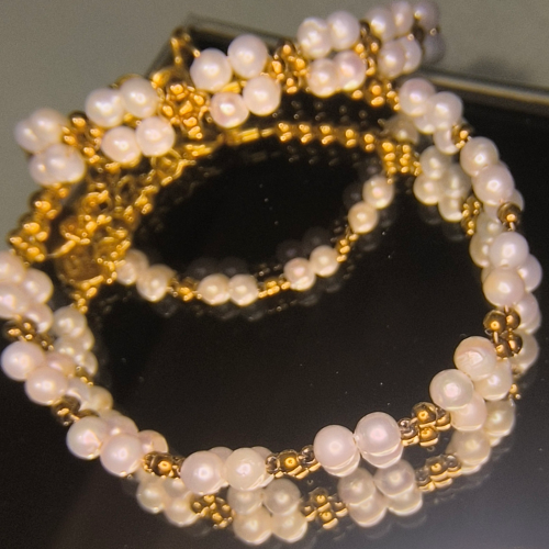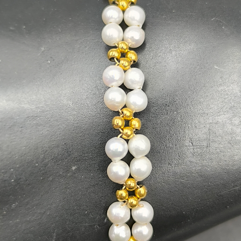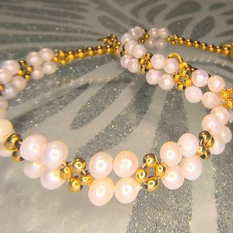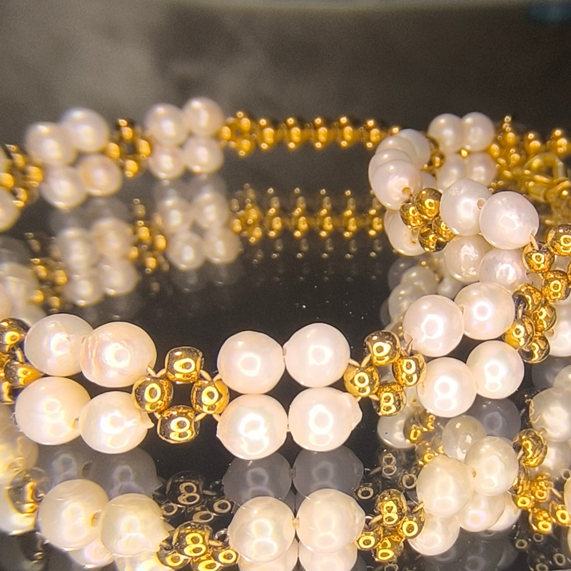 Bransoletka z perłami hodowanymi i hematytami w złoconym wykończeniu zachwyca subtelnym kontrastem: mleczna, satynowa perła spotyka się tu z eleganckim, metalicznym blaskiem. Całość osadzona jest w srebrze złoconym 24K (próba 925), co nadaje biżuterii ciepły, szlachetny ton.