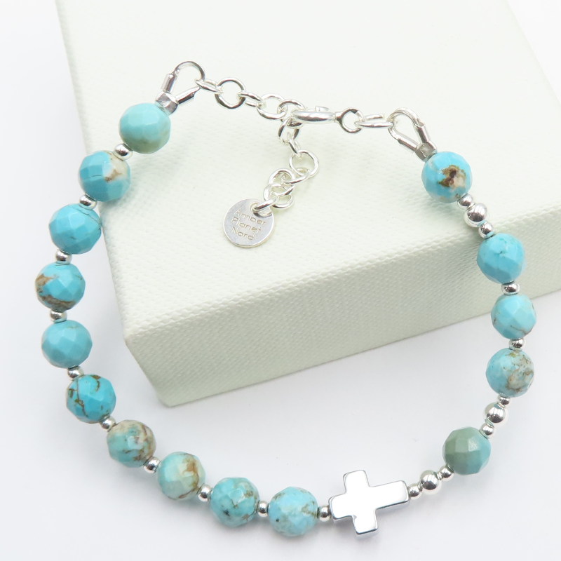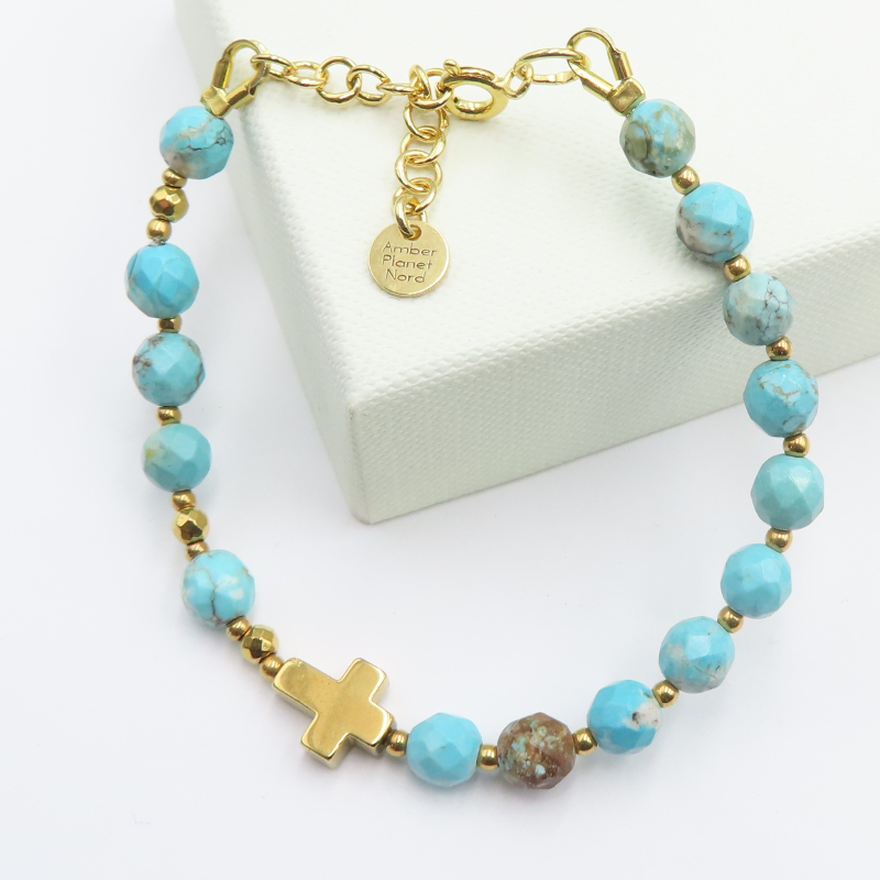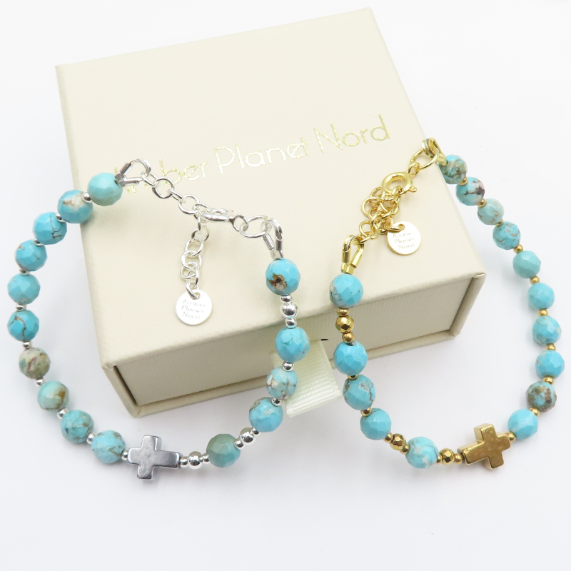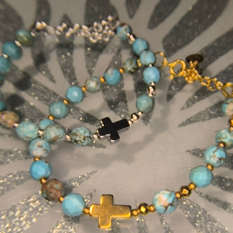 Bransoleta Różaniec - Turkus i Hematyt w srebrze i srebrze złoconym.