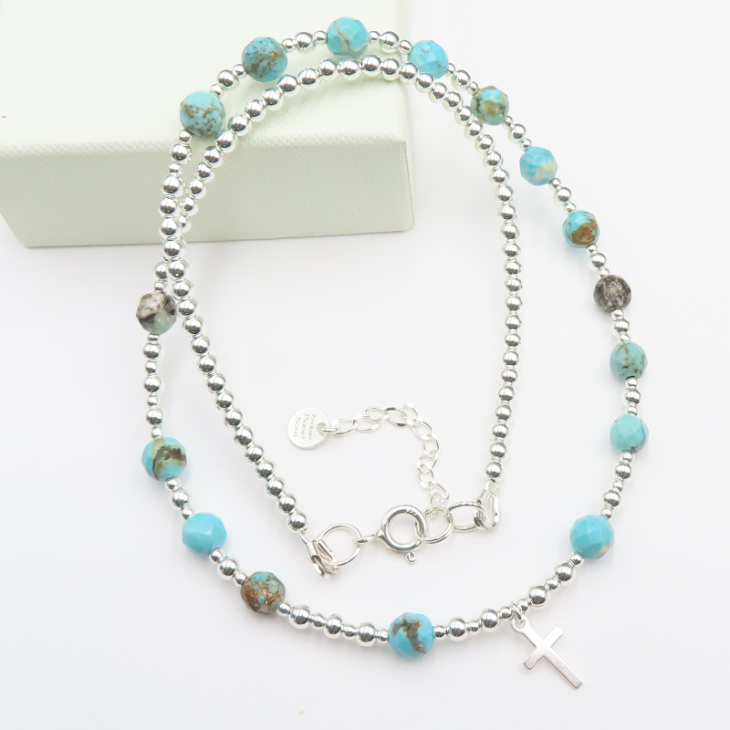 Naszyjnik w formie ozdobnego różańca łączy turkusowe kamienie z połyskiem hematytu oraz detalami ze srebra złoconego. Całość ma dekoracyjny, a jednocześnie elegancki charakter, a elementem wiszącym jest krzyżyk, który nadaje kompozycji symboliczny wymiar.