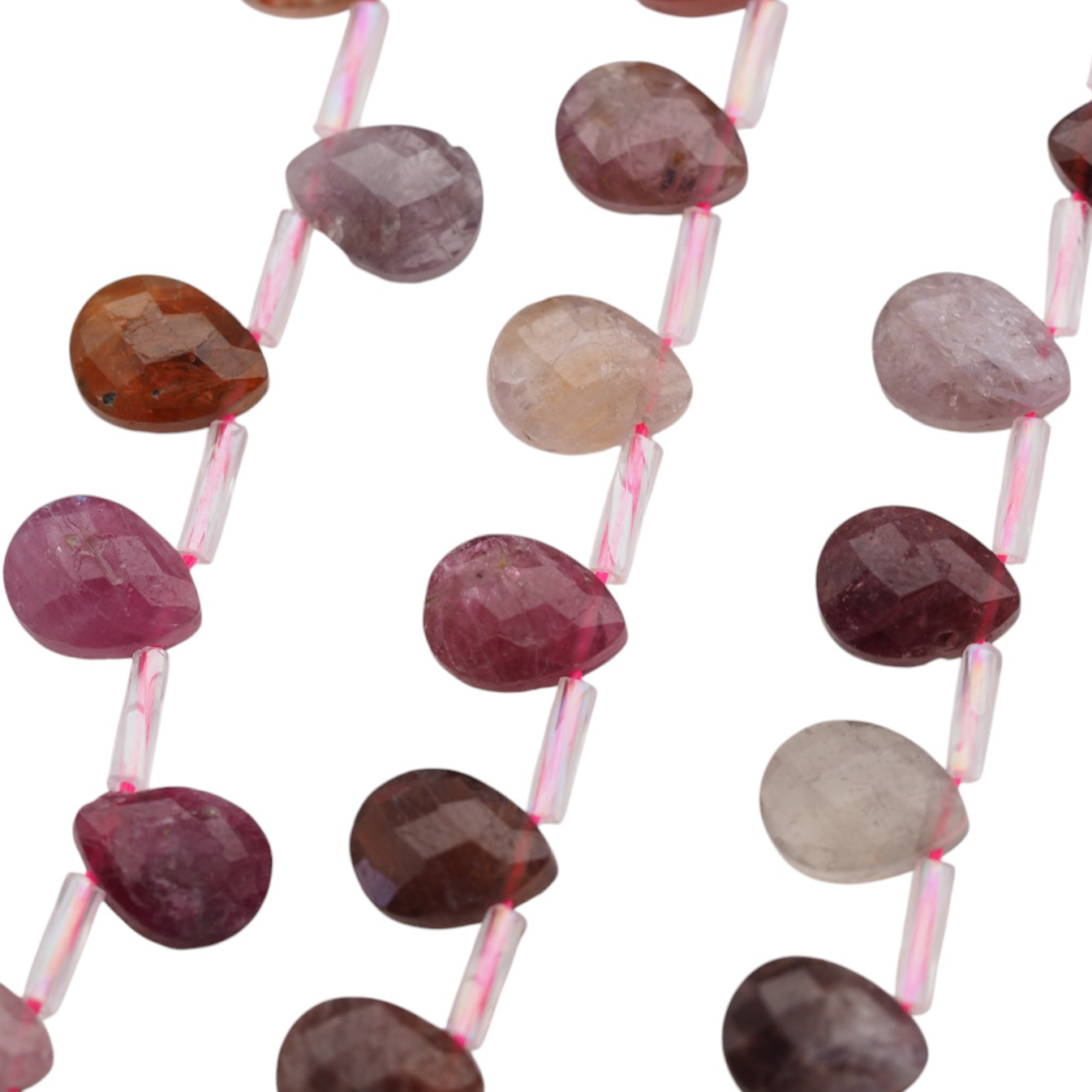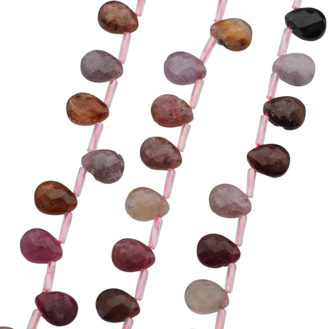 Naturalny spinel kolorowy w formie fasetowanej kropli to materiał o eleganckim, jubilerskim charakterze. Fasetowanie podbija refleksy światła, a wielobarwność kamieni sprawia, że każdy sznur wygląda nieco inaczej.