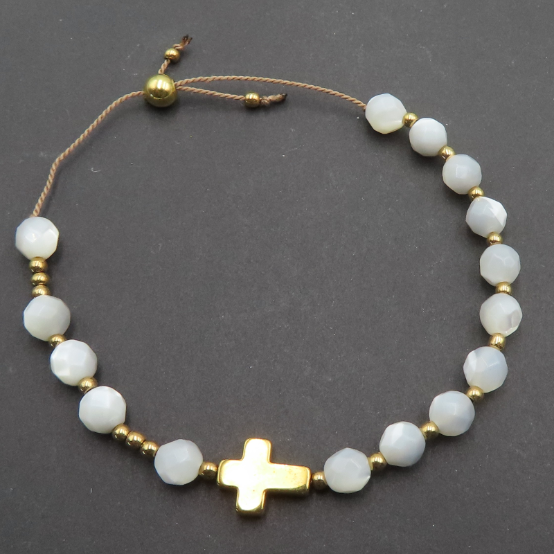 Bransoleta Różaniec - Muszla biała i Hematyt w srebrze złoconym.