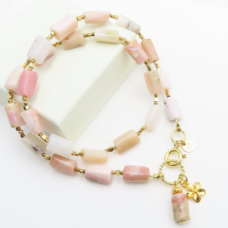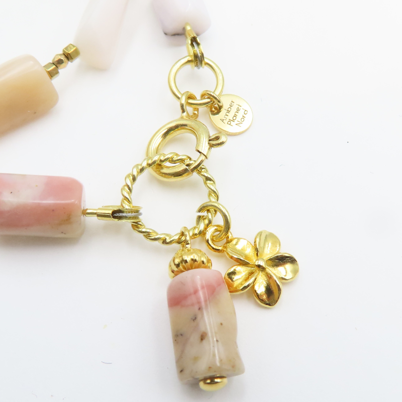 Delikatny naszyjnik z opalem różowym i hematytami, wykończony w srebrze złoconym. Połączenie pudrowego różu z chłodnym, metalicznym połyskiem hematytu tworzy elegancki, nowoczesny efekt – subtelny, ale zauważalny przy dekolcie.