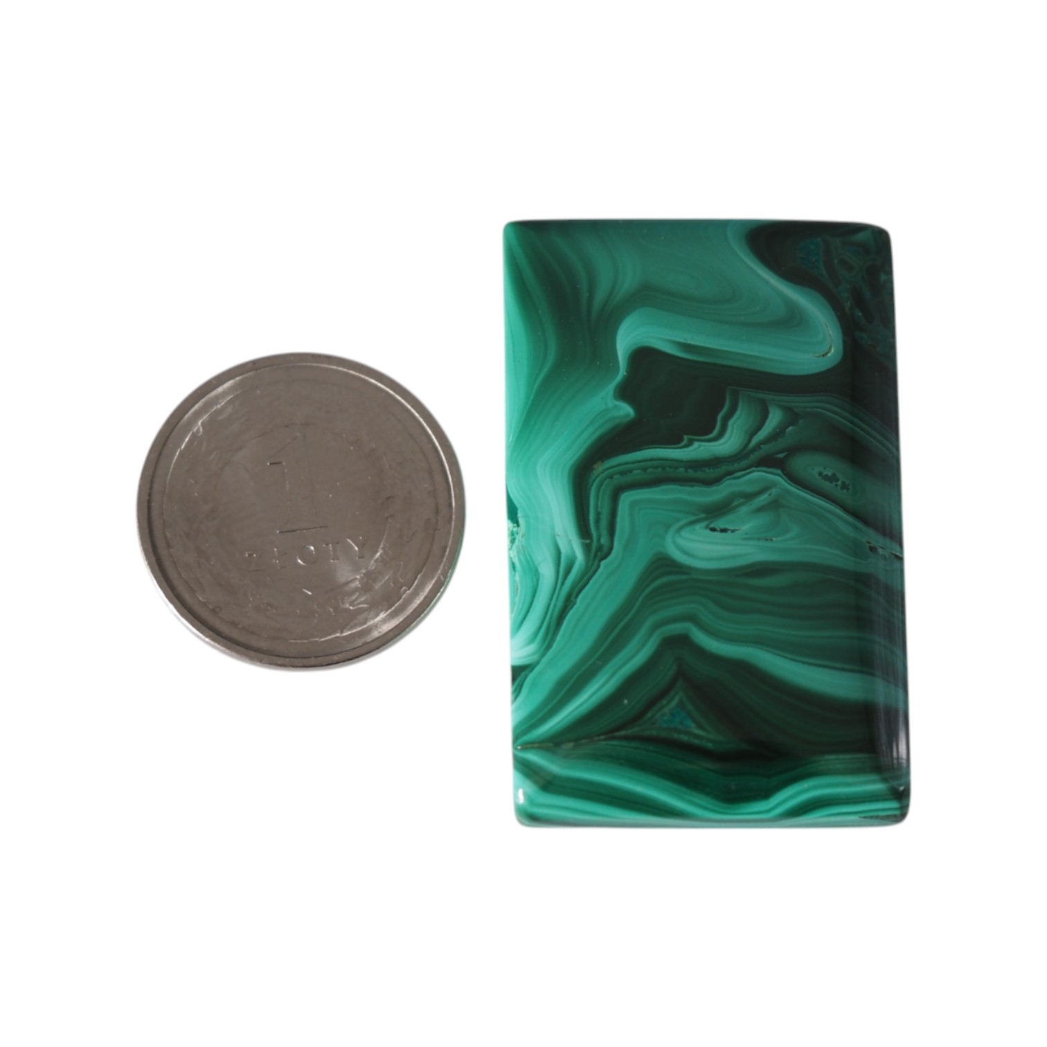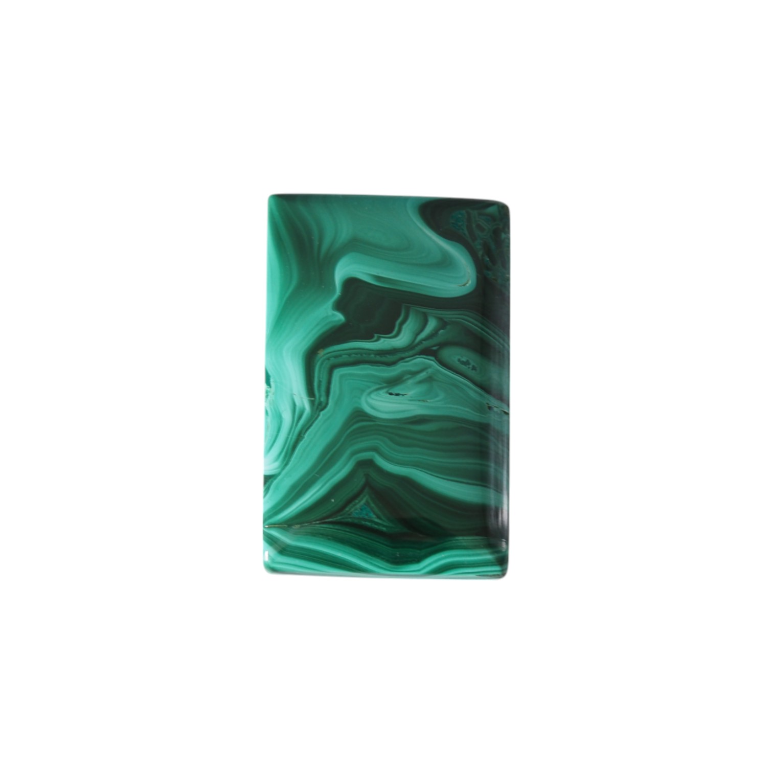 Naturalny malachit w formie prostokątnego kaboszonu zachwyca intensywną zielenią i charakterystycznym, pasmowym rysunkiem. Wypolerowana powierzchnia pięknie podbija głębię koloru, dzięki czemu kamień prezentuje się elegancko i wyraziście.