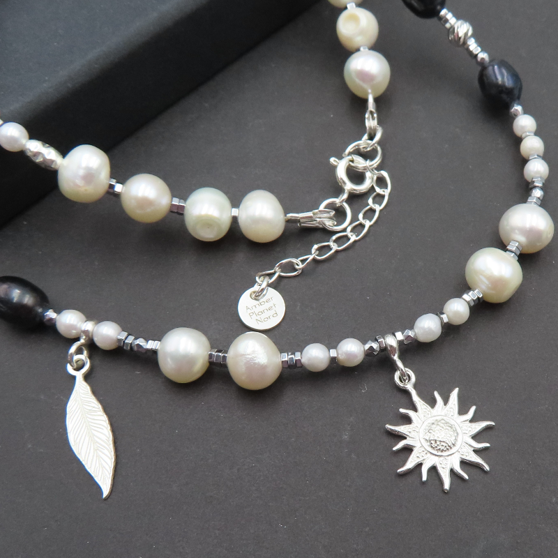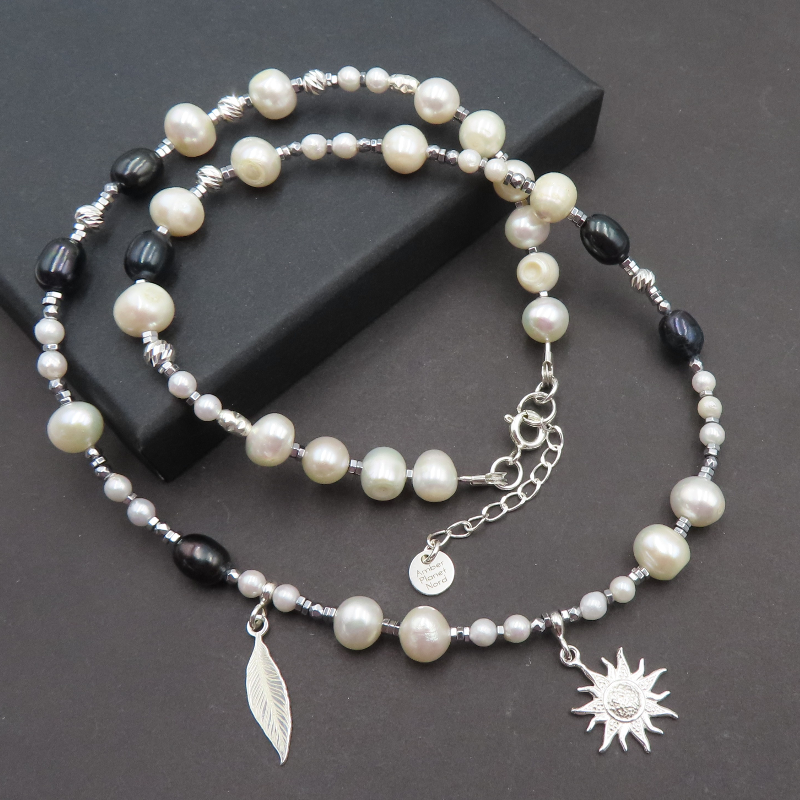 Naszyjnik z Perłami Naturalnymi i Hematytem w srebrze.