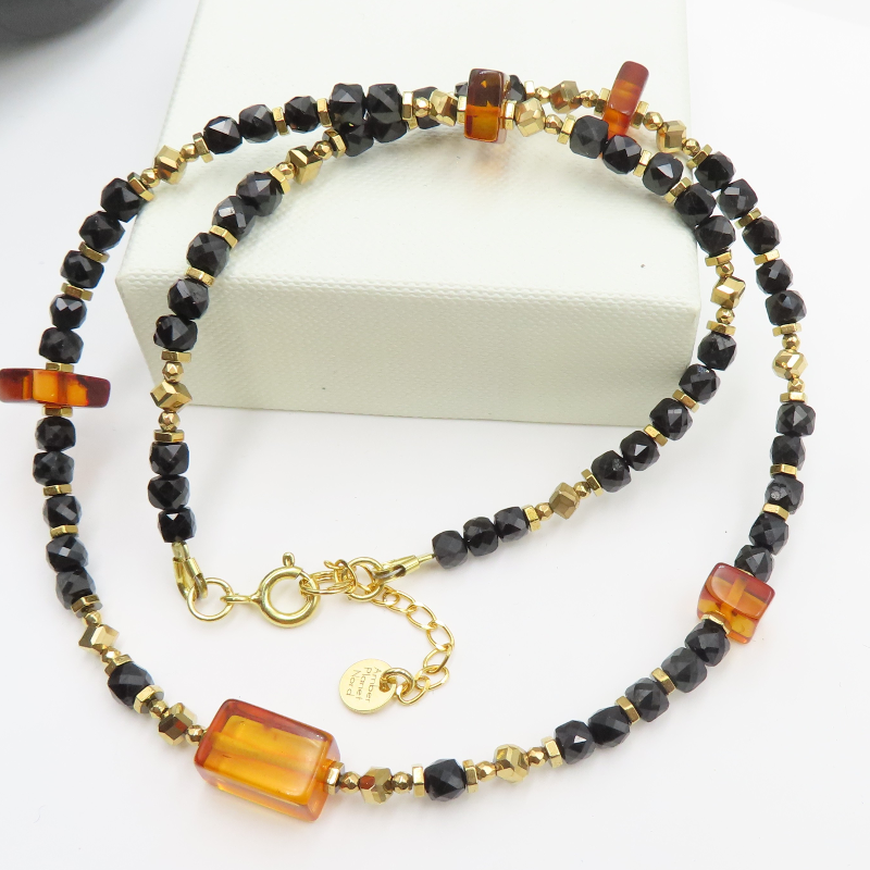 Naszyjnik Czarny Turmalin i Bursztyn w srebrze złoconym.