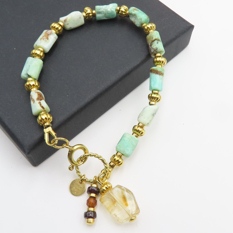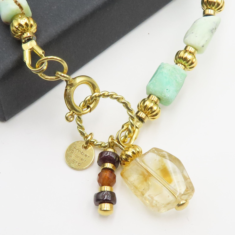 Bransoletka Chryzopraz, Cytryn, Granat i Hematyt w srebrze złoconym.
