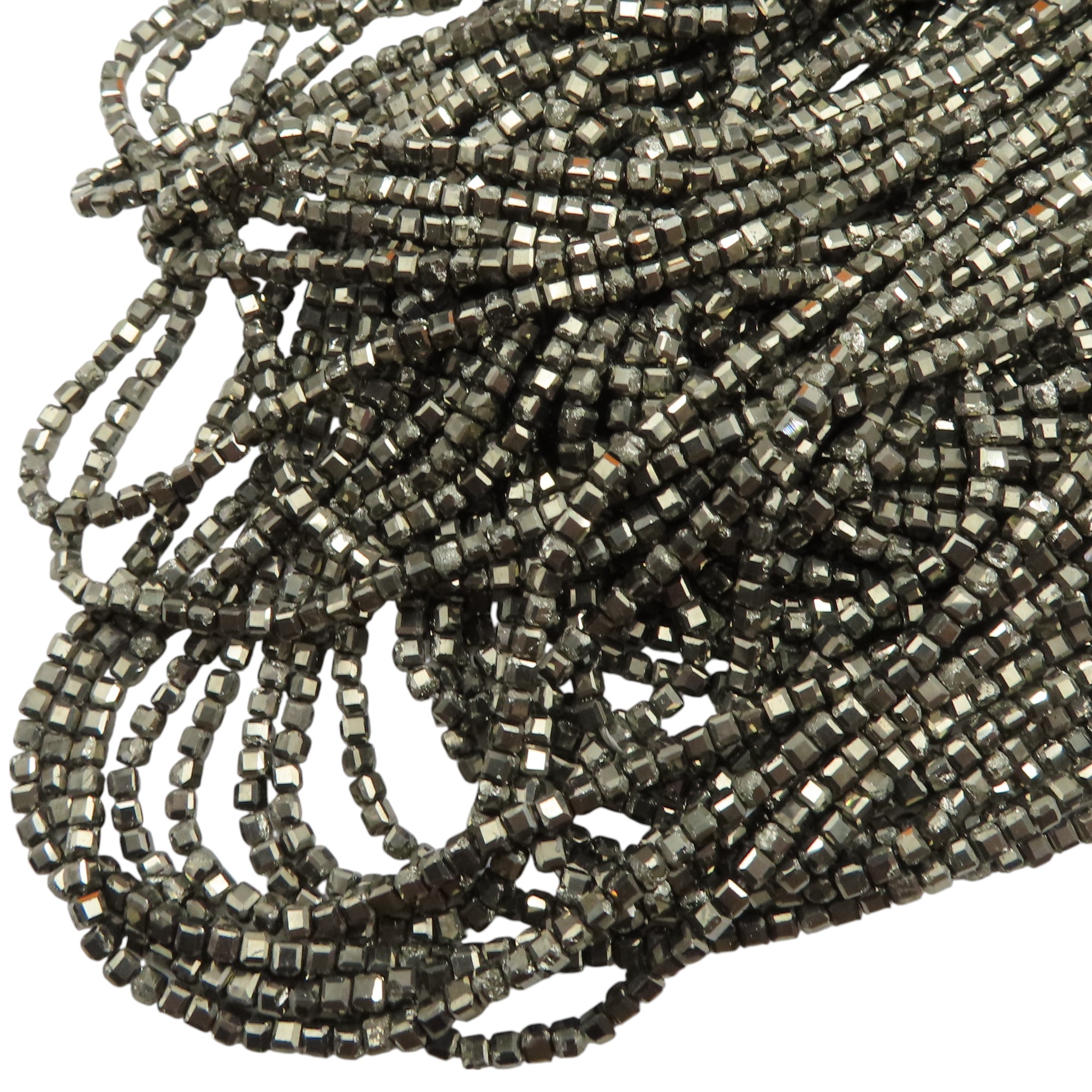 Piryt w formie drobnych, fasetowanych kostek przyciąga wzrok metalicznym połyskiem i „złotawym” refleksem, kojarzonym z eleganckim blaskiem w stylu glamour. Regularny kształt kostki daje rytmiczny, uporządkowany efekt w projekcie, a fasetowanie dodaje światła i głębi.