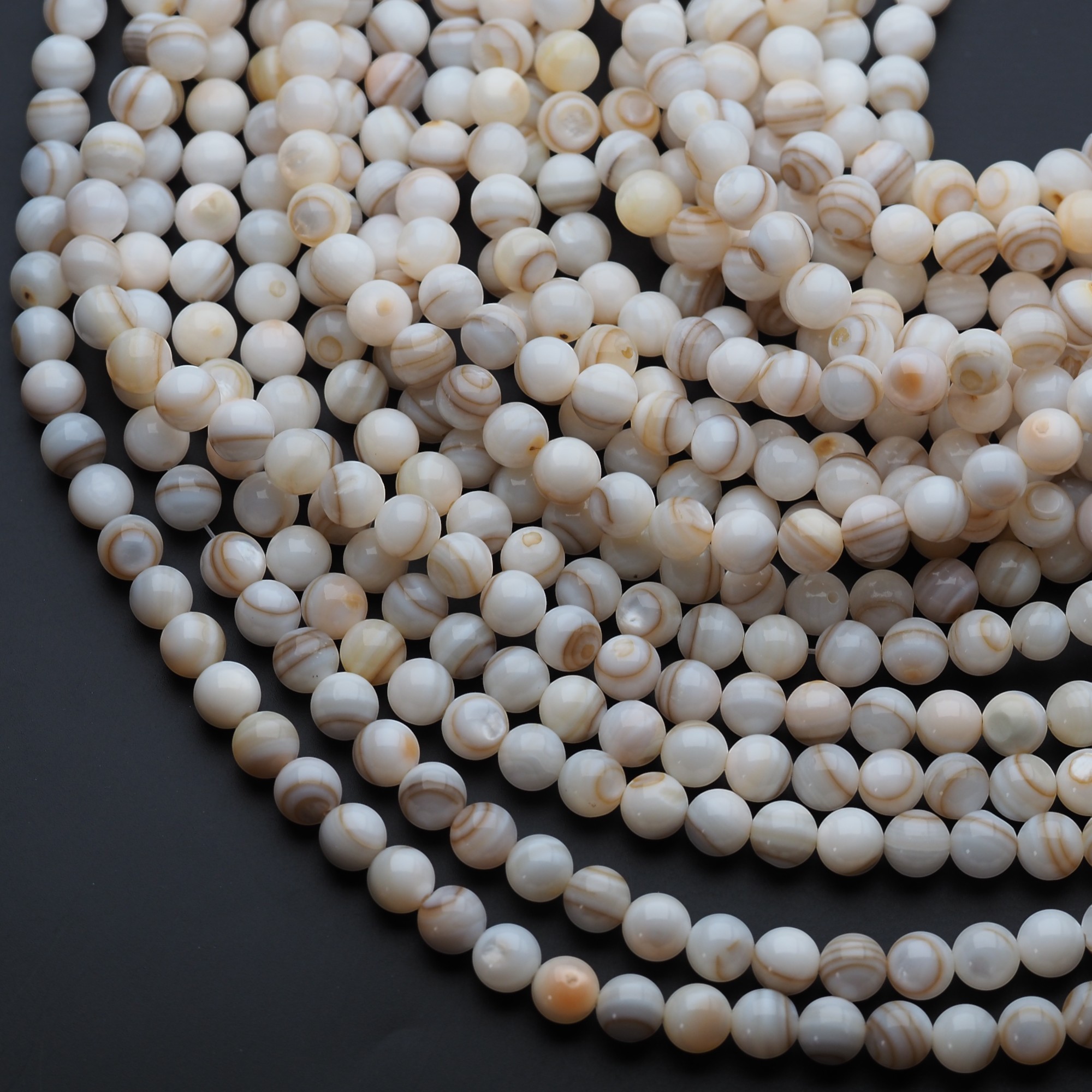 Jasnobeżowe kulki z naturalnej muszli mają delikatny, kremowo-piaskowy odcień i eleganckie, polerowane wykończenie. Subtelny połysk sprawia, że koraliki wyglądają lekko i „morsko”, a przy tym pozostają neutralne kolorystycznie.