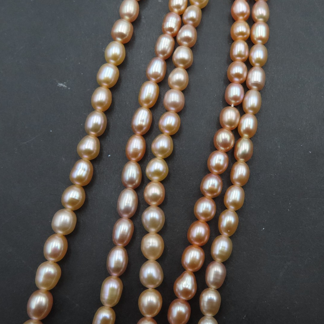 Naturalne perły hodowane słodkowodne w delikatnym, różowym odcieniu. Perełki są wiercone i mają kształt „ryżu”, dzięki czemu prezentują się lekko i subtelnie, z charakterystycznym perłowym połyskiem.
