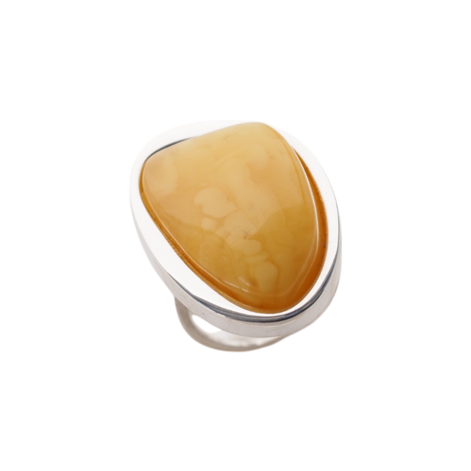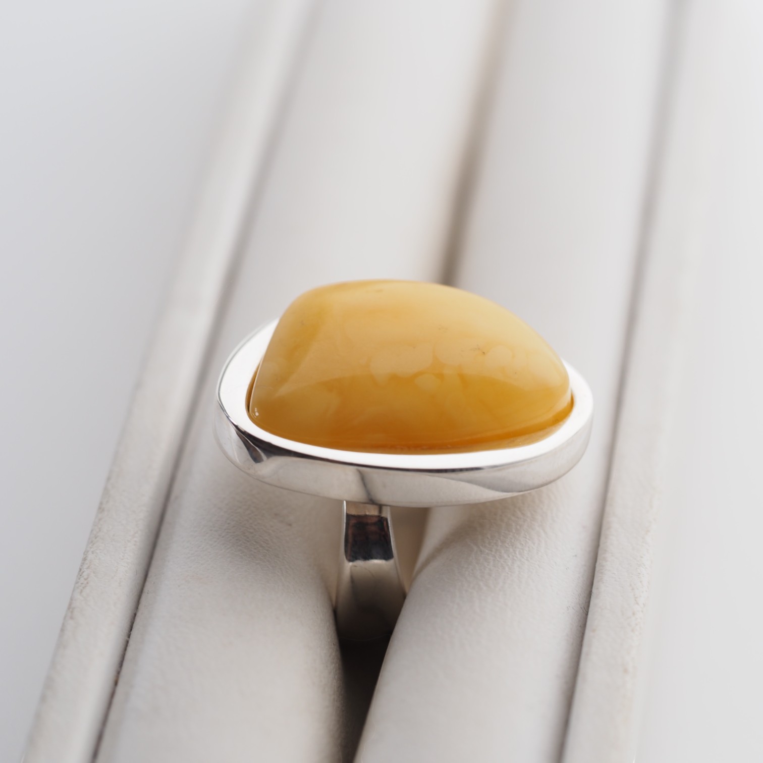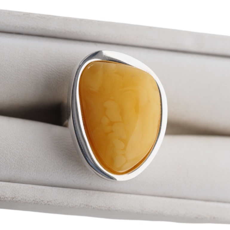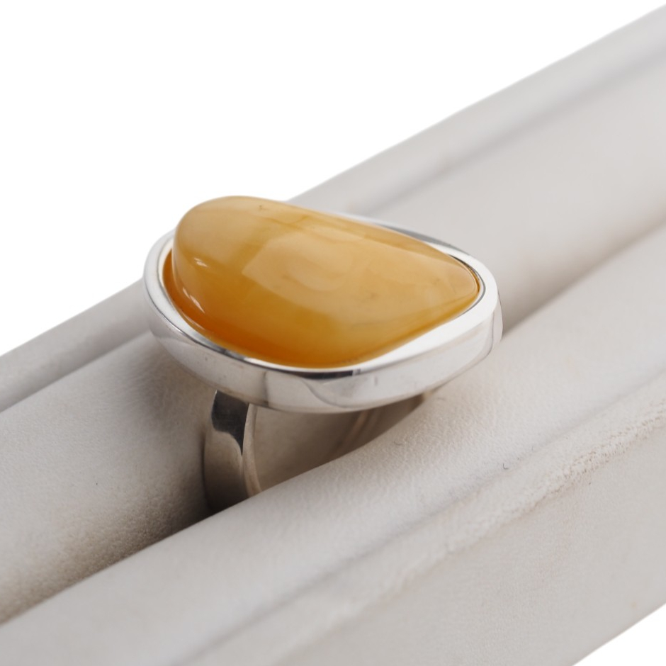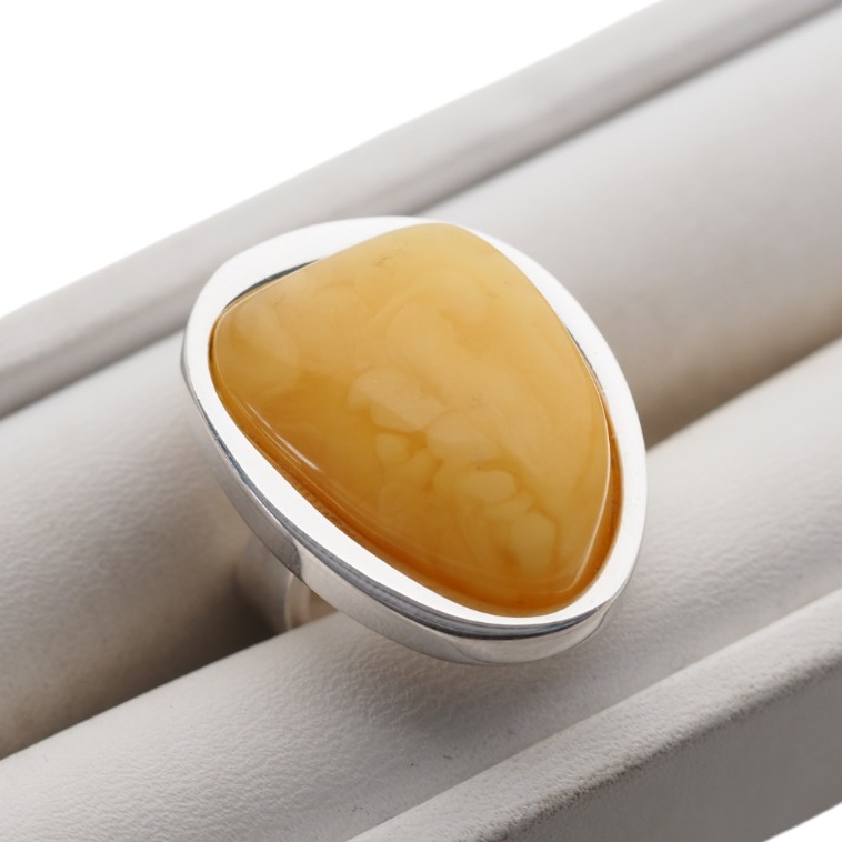 Unikatowy pierścionek wykonany ręcznie z naturalnym bursztynem mlecznym w rzadziej spotykanym kształcie zaokrąglonego trójkąta.