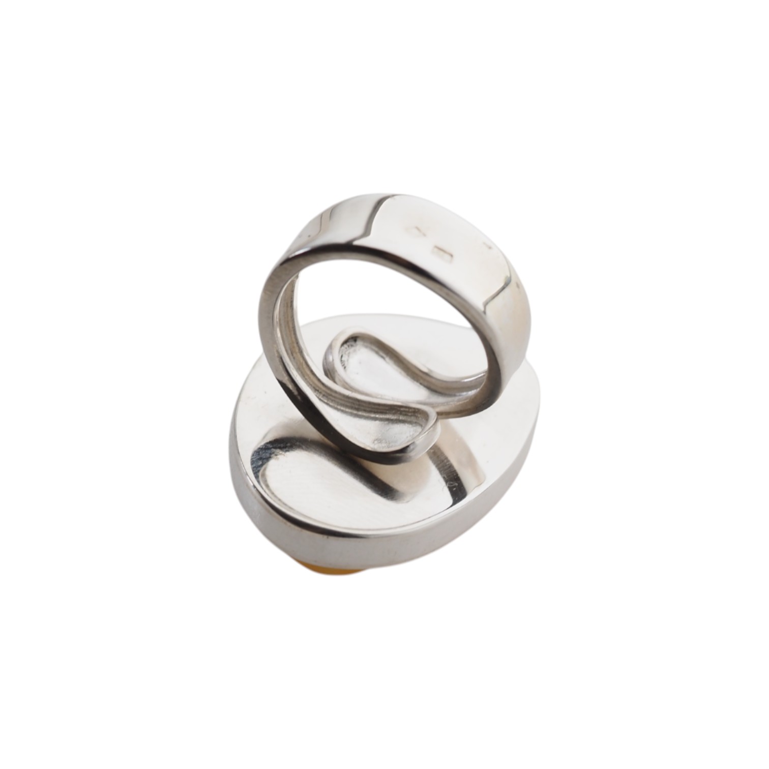 Bursztyn osadzony w srebrnej, pełnej oprawie z wyoblonymi krawędziami.