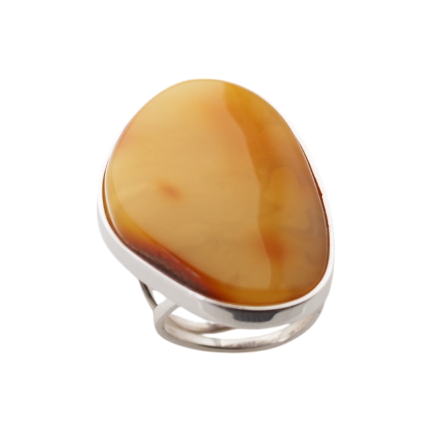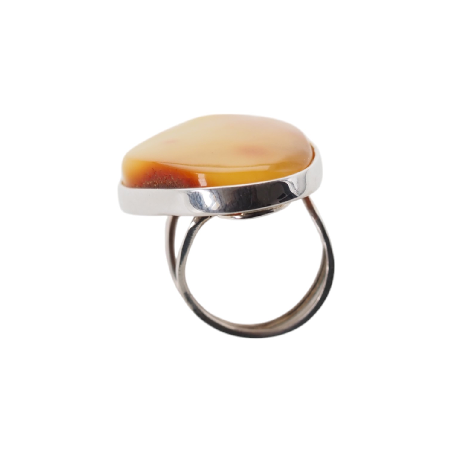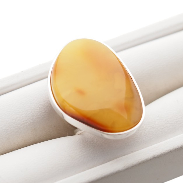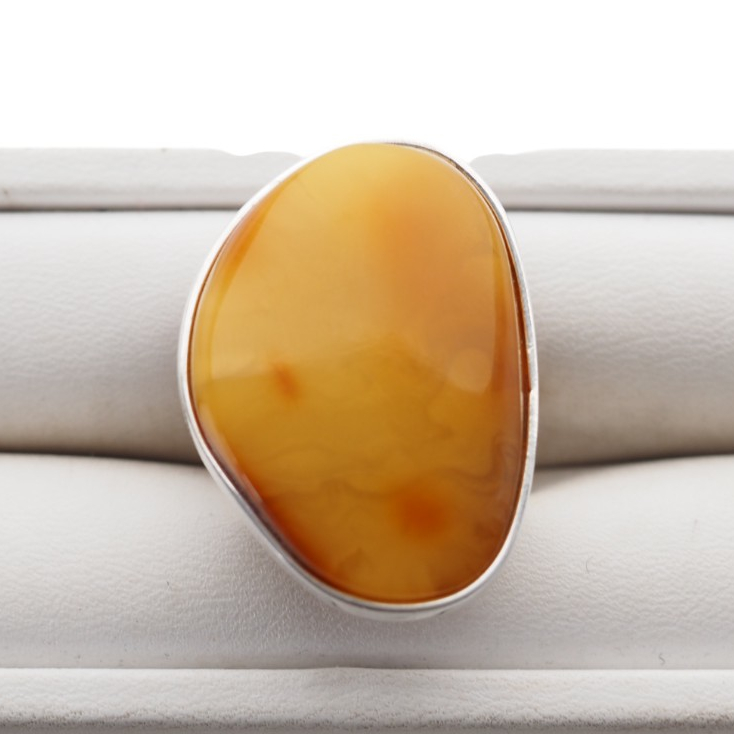 Ręcznie wykonany pierścionek z dużym naturalnym bursztynem mlecznym o unikatowym, organicznym kształcie i charakterystycznej oprawie ze srebra próby 925.