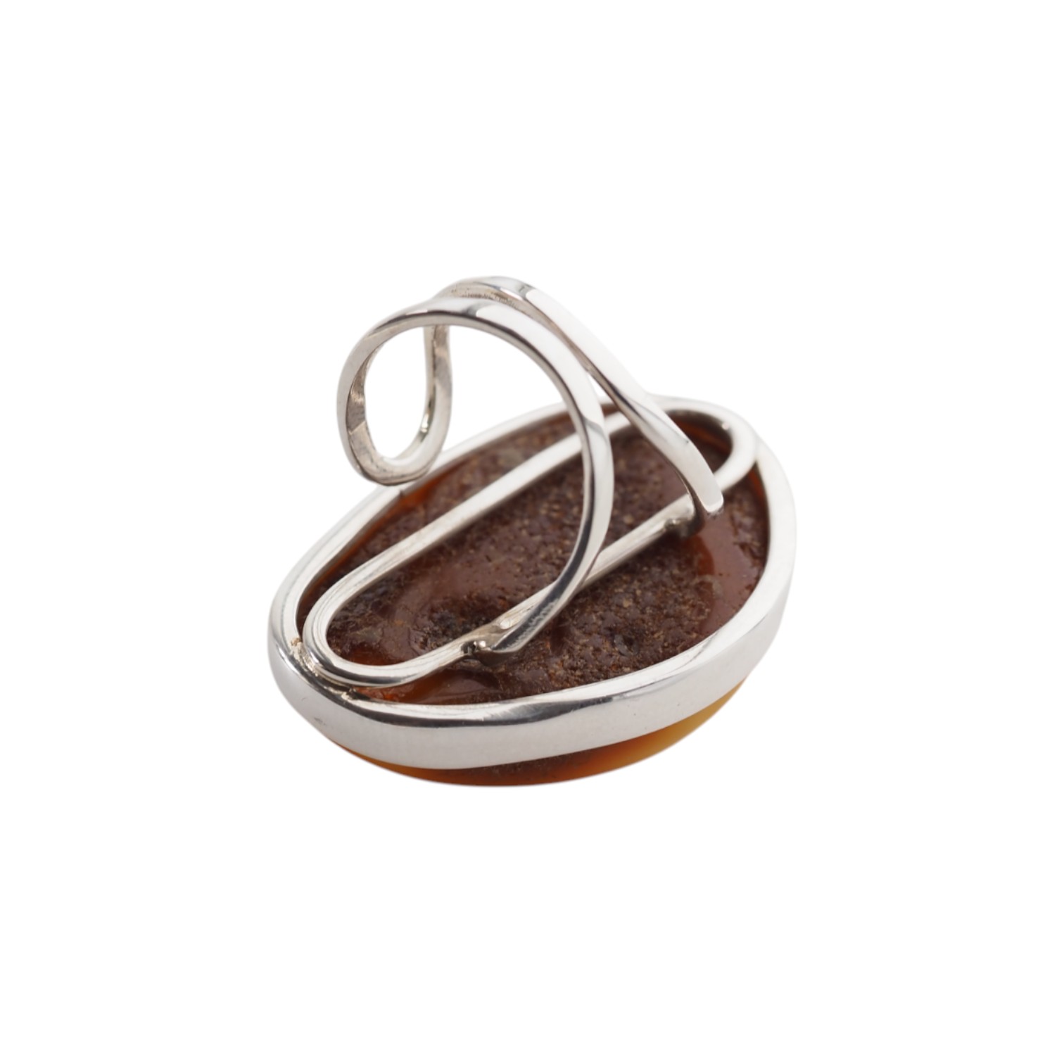 Solidna oprawa ze srebra próby 925 – z nietypowym koszyczkiem i strukturą podpierającą całą powierzchnię bursztynu od spodu.