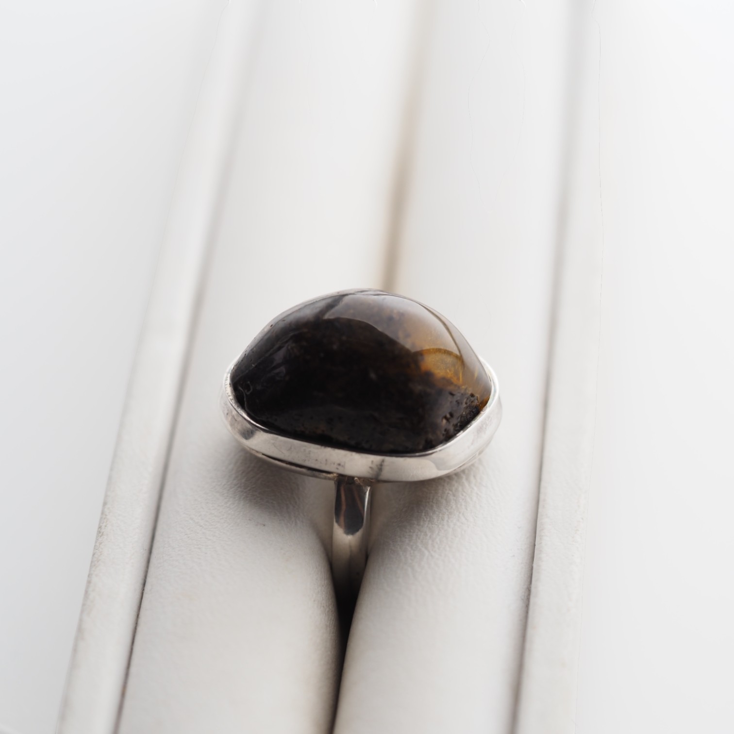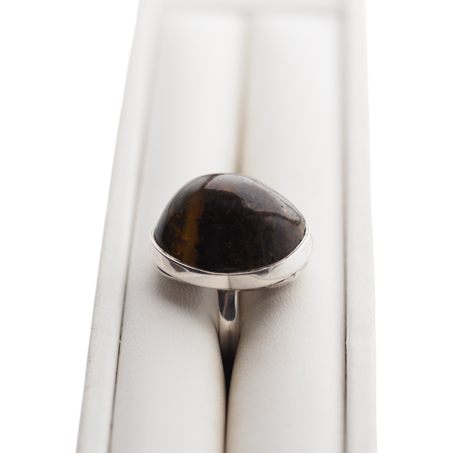 Ręcznie wykonany pierścionek z ciemnym bursztynem bałtyckim w srebrnej oprawie.