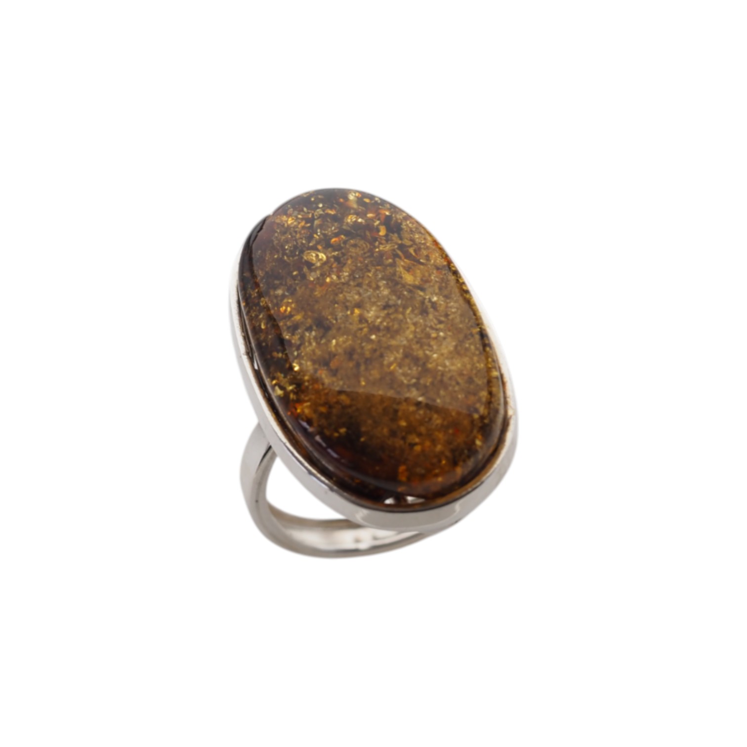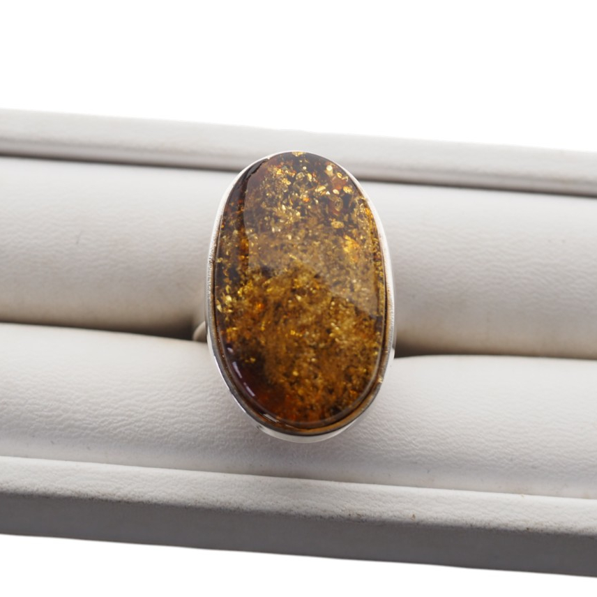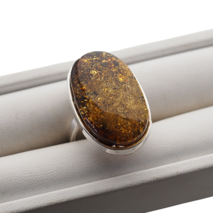 Pierścionek z bursztynem o intensywnie złotej barwie i licznych naturalnych inkluzjach, które połyskują w świetle.
