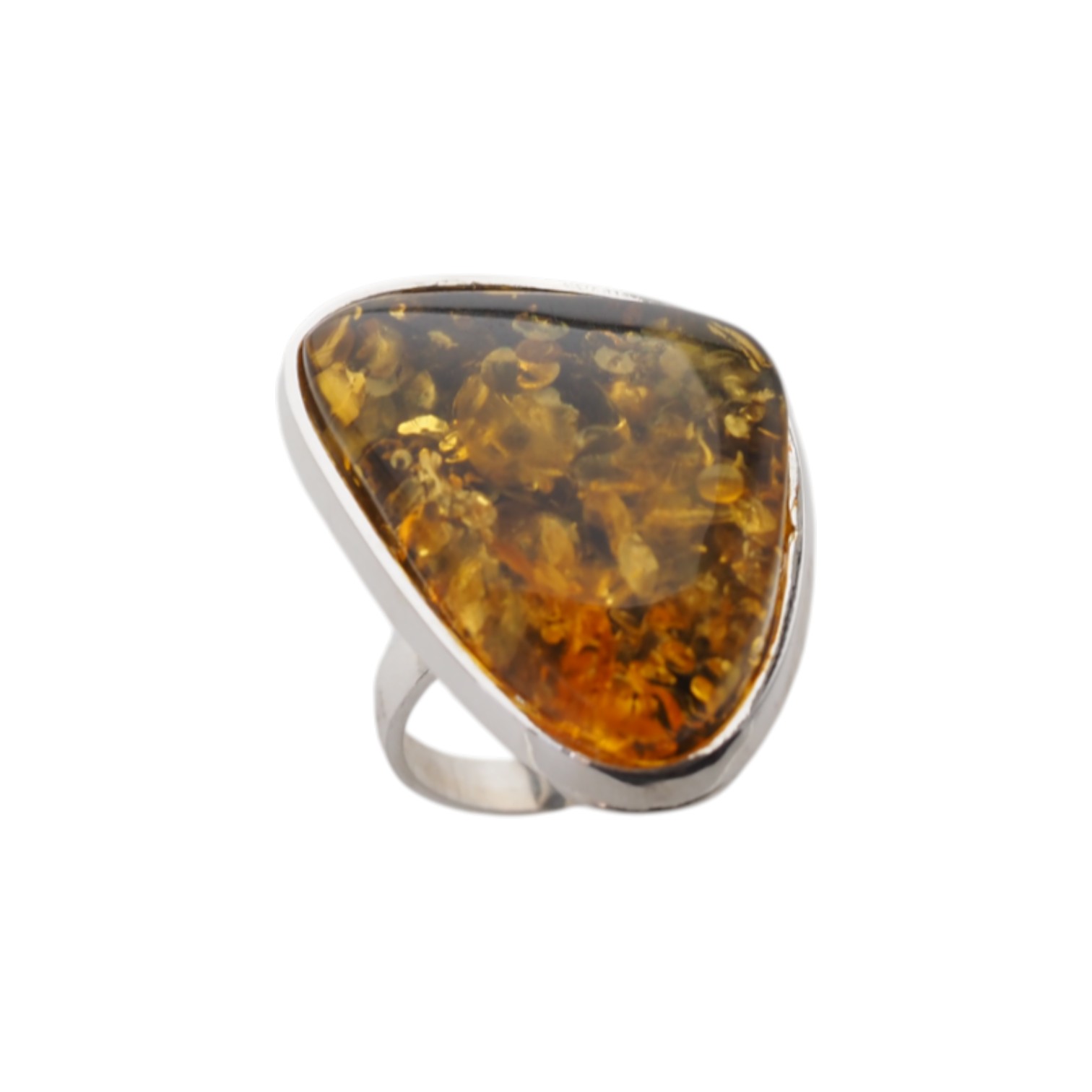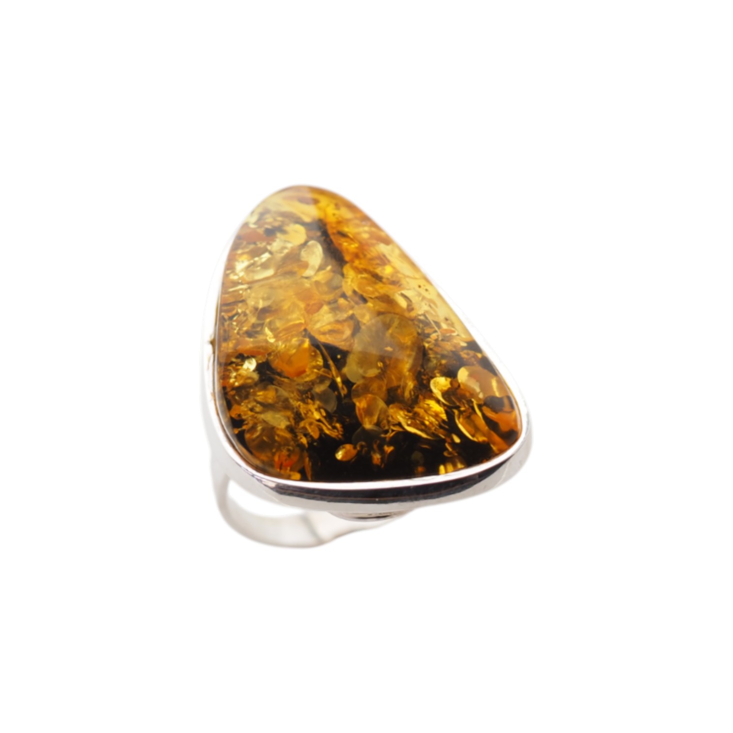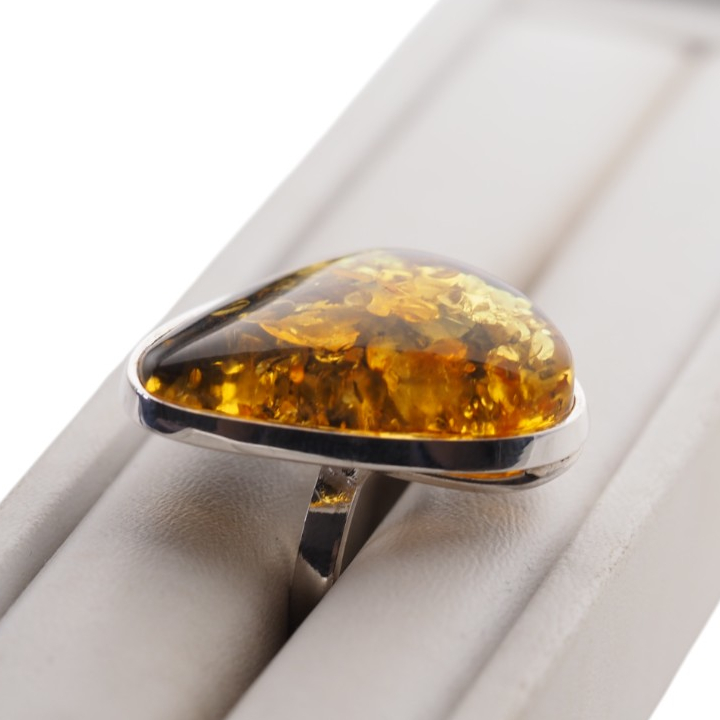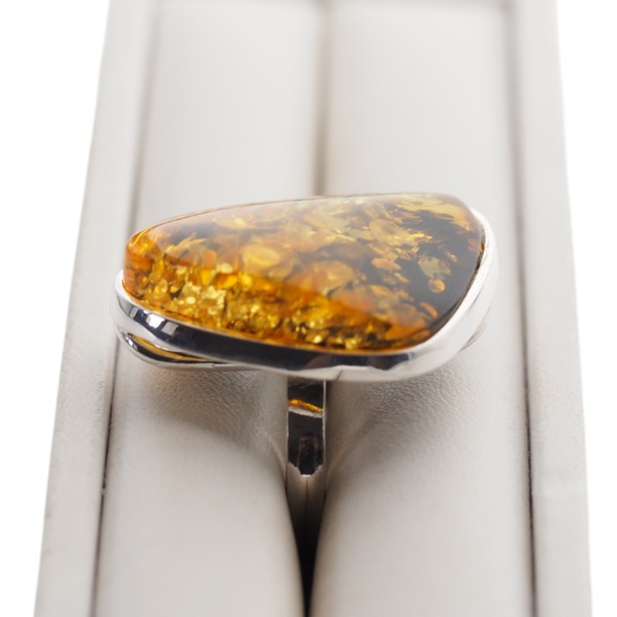 Ręcznie wykonany pierścionek z dużym bursztynem bałtyckim o wyjątkowo nieregularnym kształcie i bogatej, złoto-miodowej barwie.