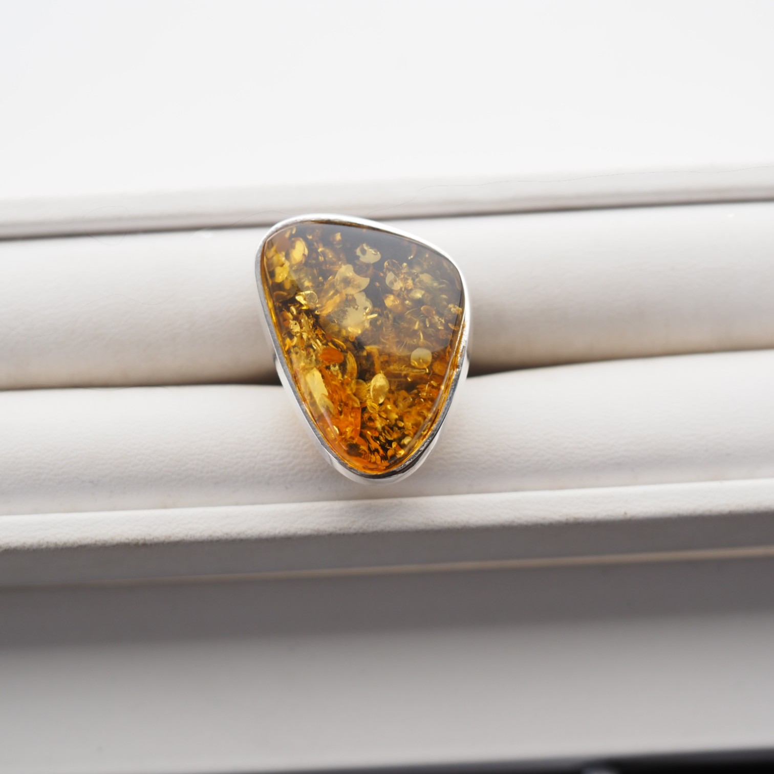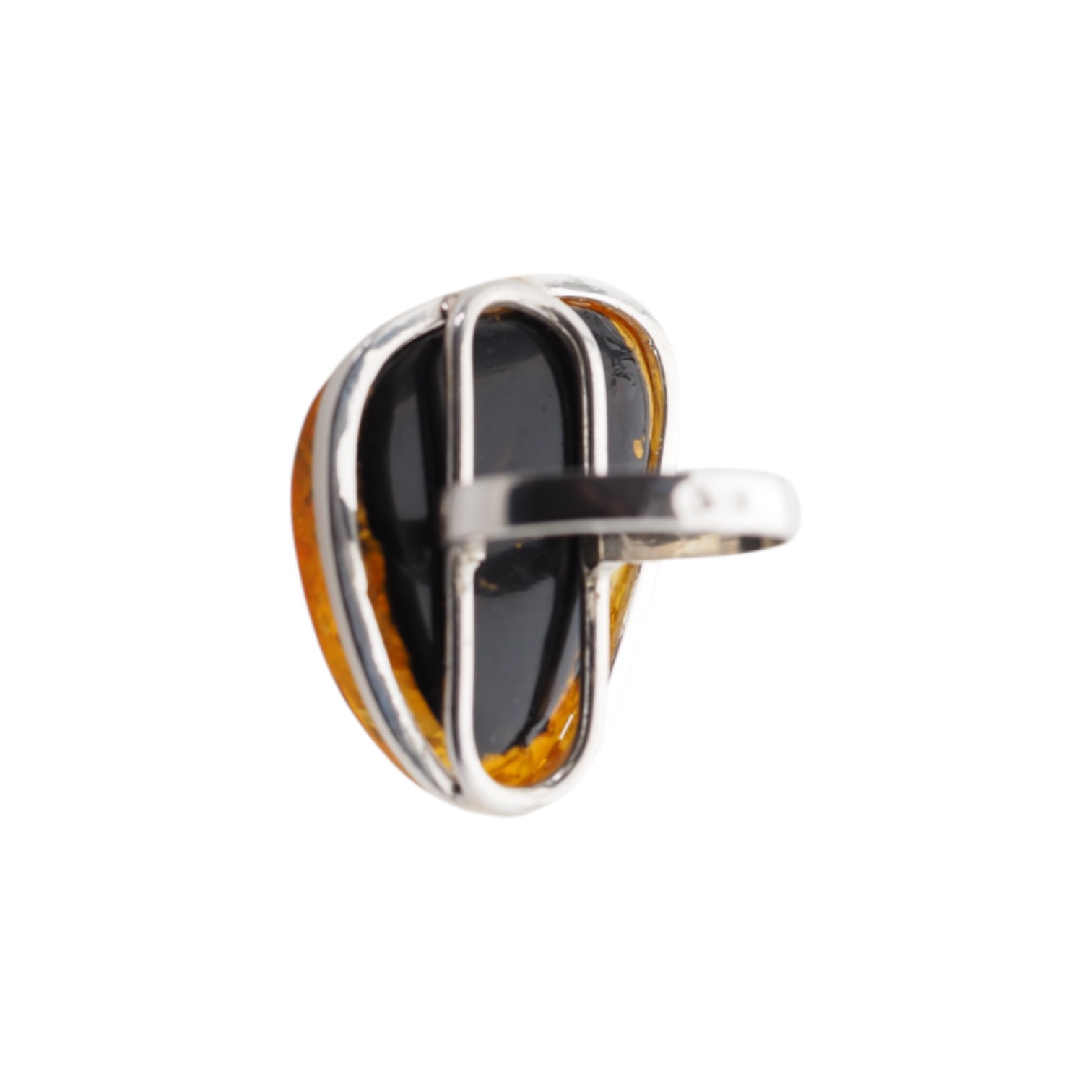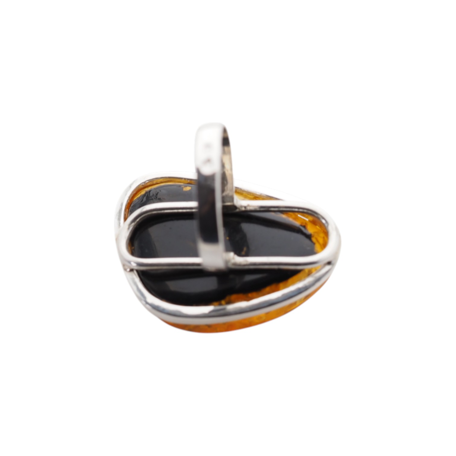 ✔ Obwód całego bursztynu zamknięty w delikatnej ramie – zabezpiecza kamień i eksponuje jego nieregularność.