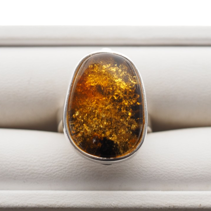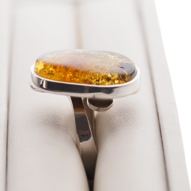 Elegancki pierścionek ręcznie wykonany ze srebra próby 925, osadzony z naturalnym bursztynem bałtyckim w ciepłym, złoto-zielonym odcieniu.