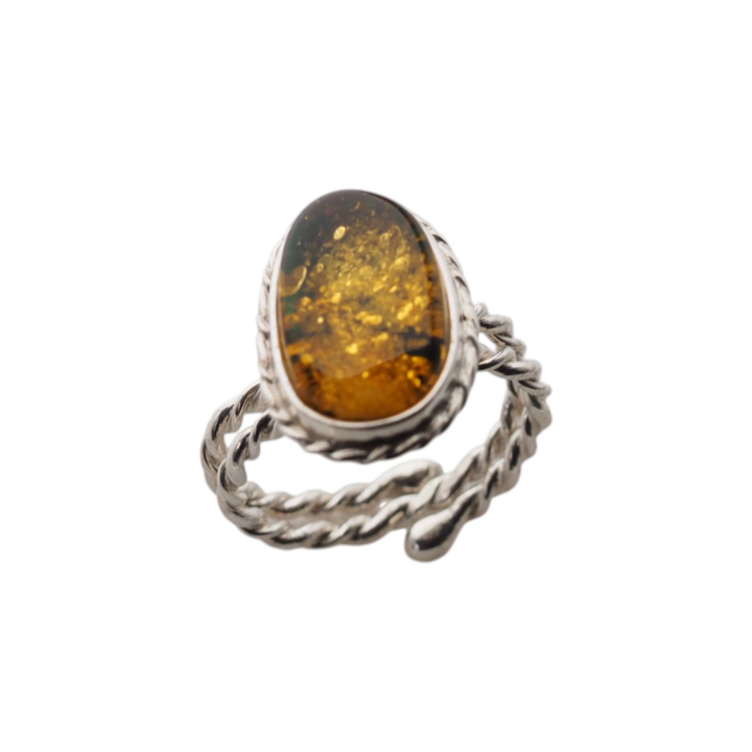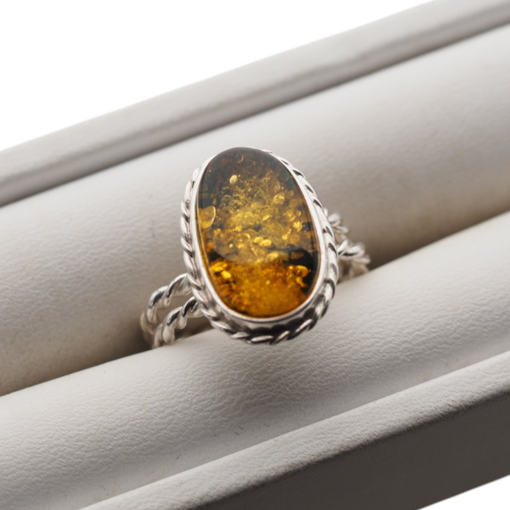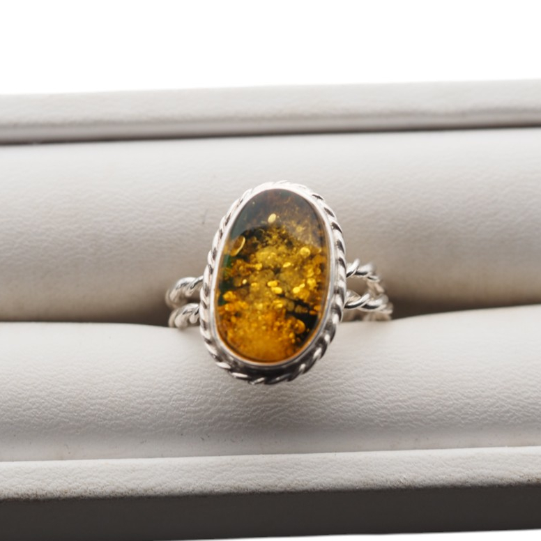 Ręcznie wykonany pierścionek z naturalnym zielonym bursztynem bałtyckim w eleganckiej, owalnej formie.