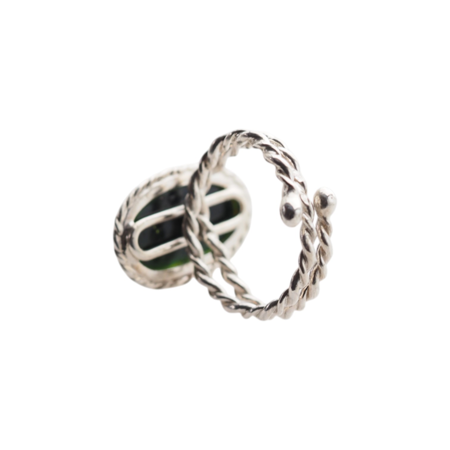 Zielony bursztyn o wyjątkowym blasku, w oprawie z plecionego srebra.