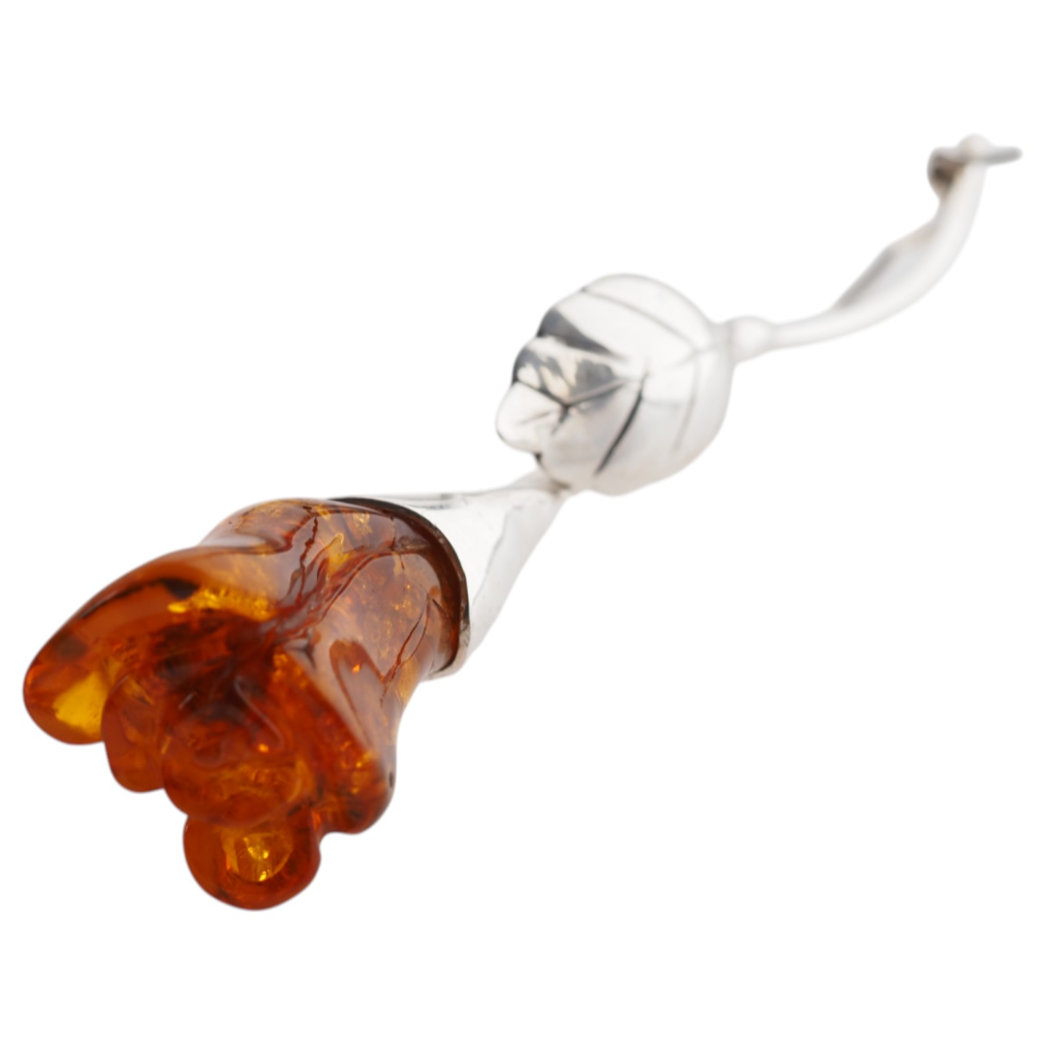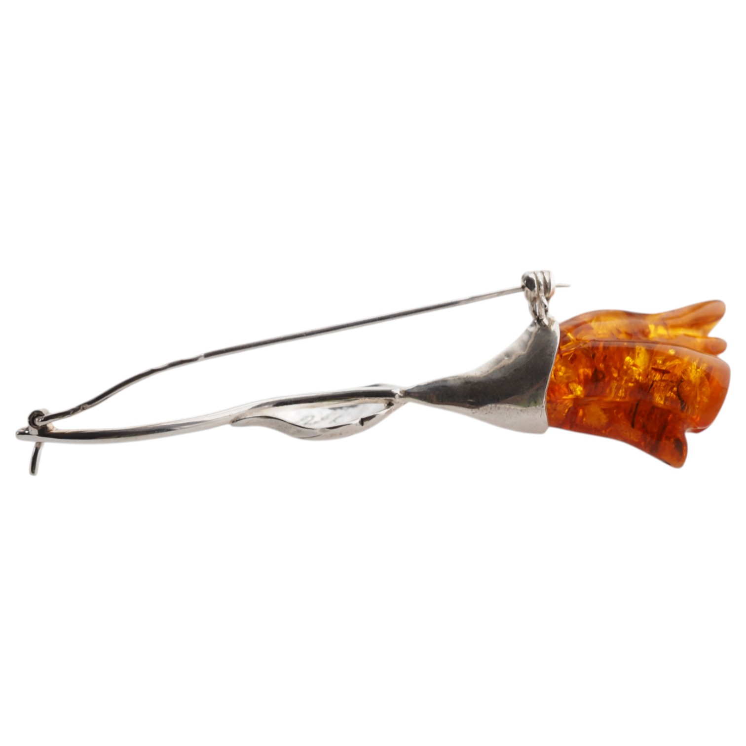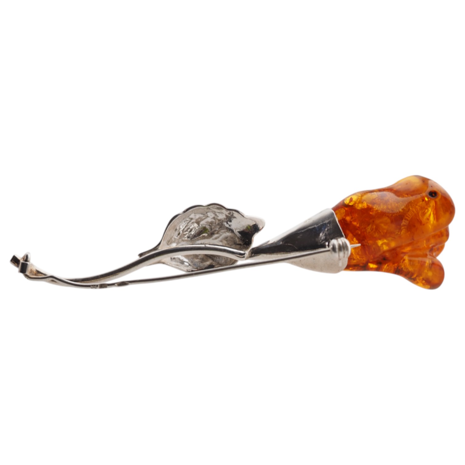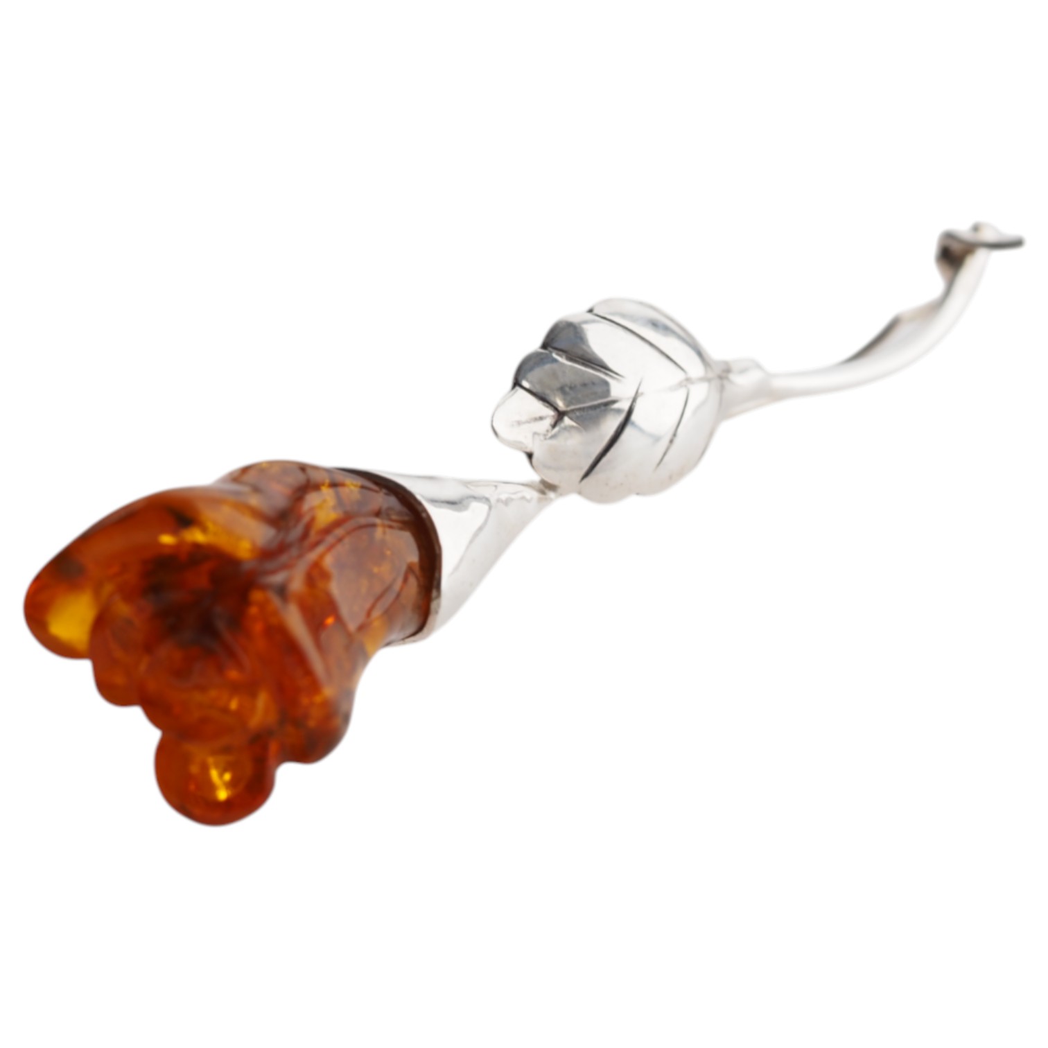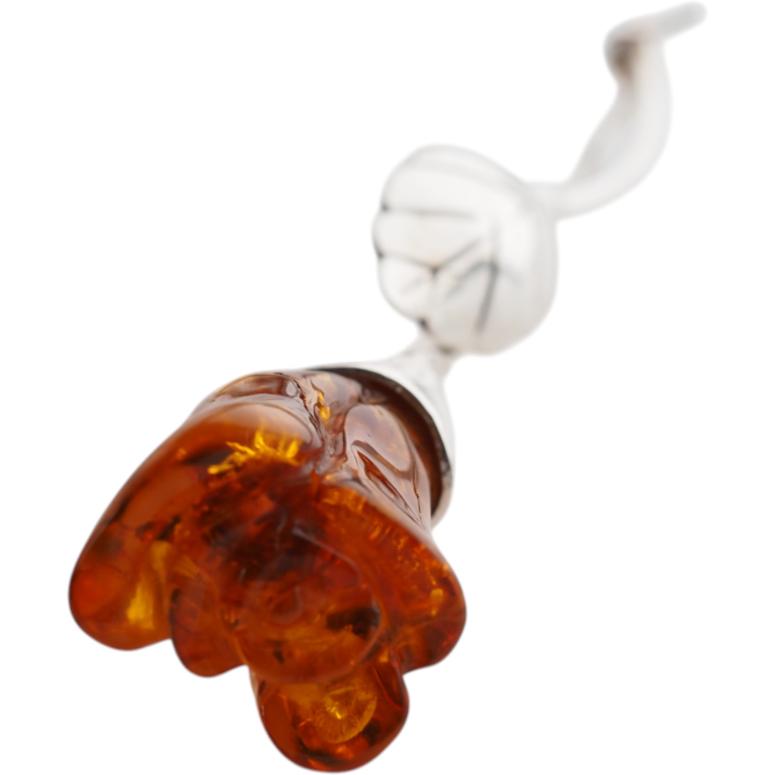 Widoczna gra światła wewnątrz bursztynu oraz rzeźbione detale płatków – zbliżenie ukazuje realistyczne formowanie ręką rzemieślnika.
