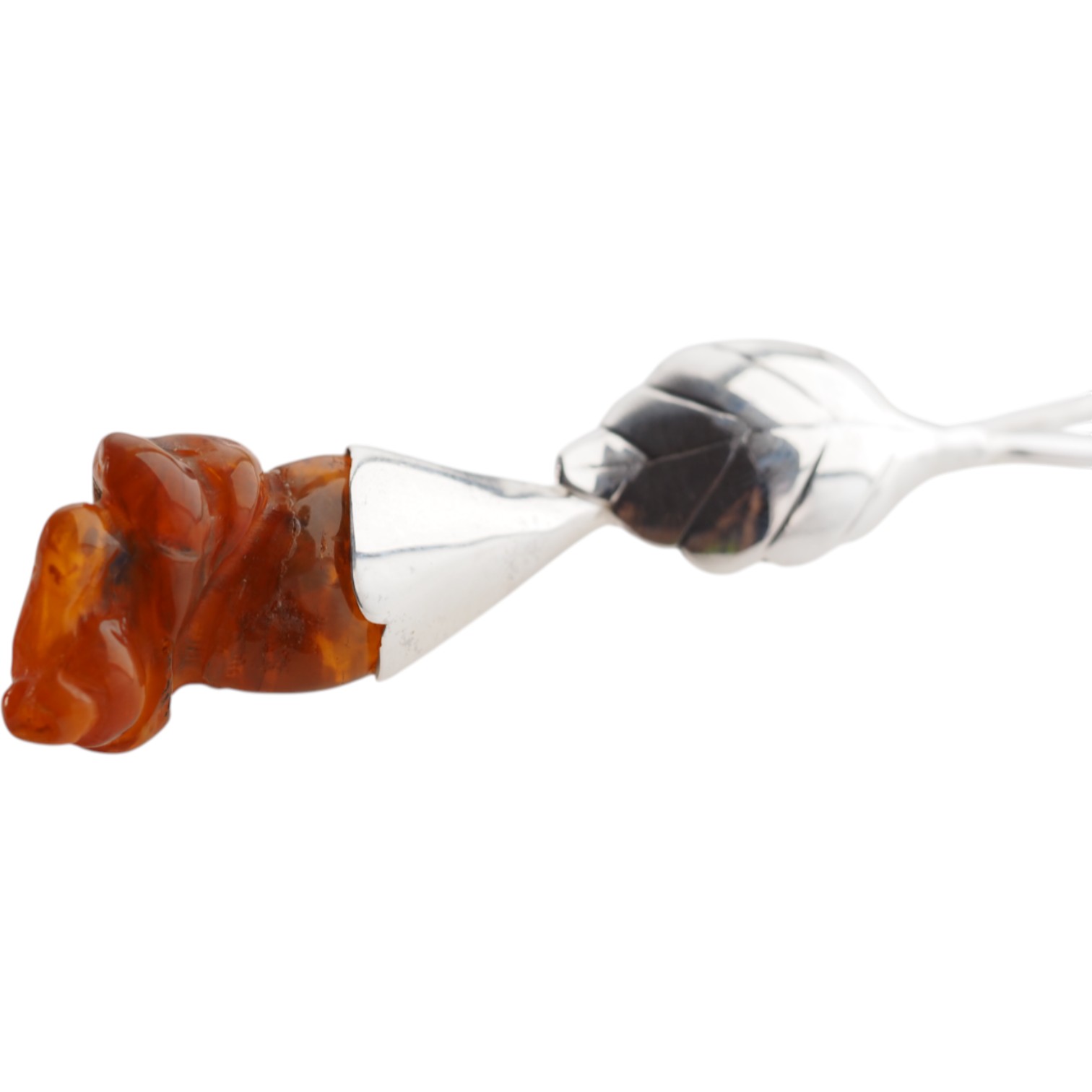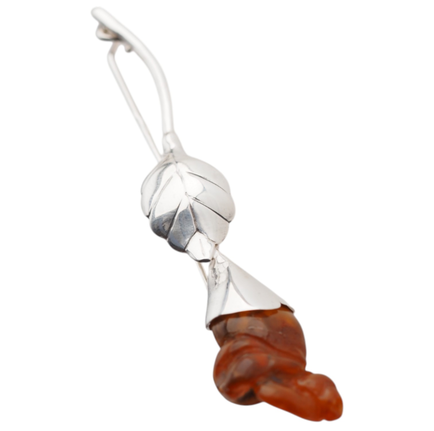Konstrukcja: srebrna łodyga z subtelnym, realistycznym liściem. Oprawa kielicha w formie srebrnego stożka płynnie obejmuje bursztynowy kwiat.