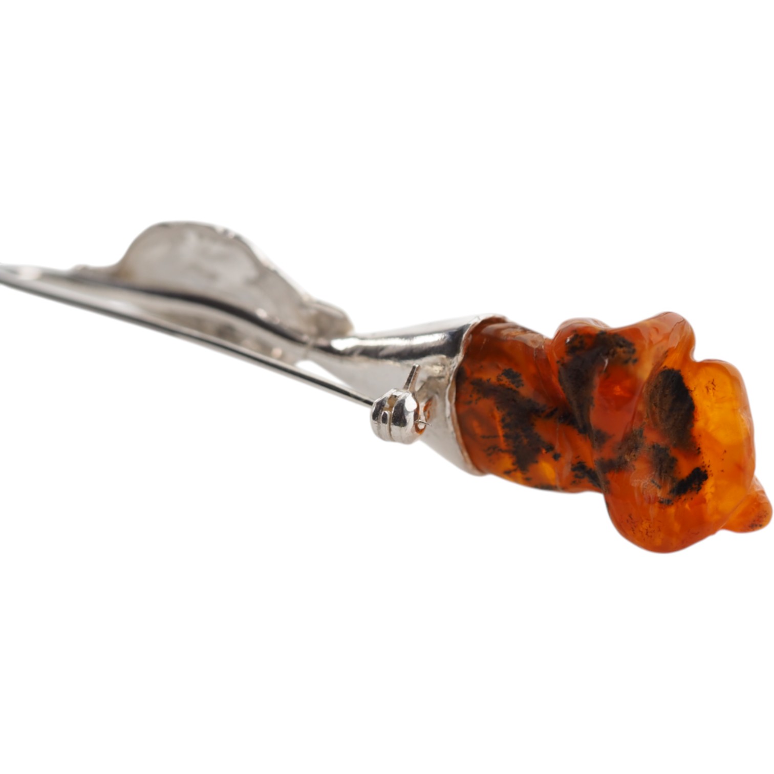 Ręcznie wykonana broszka inspirowana naturą, przedstawiająca delikatną różę z rzeźbionego bursztynu bałtyckiego.