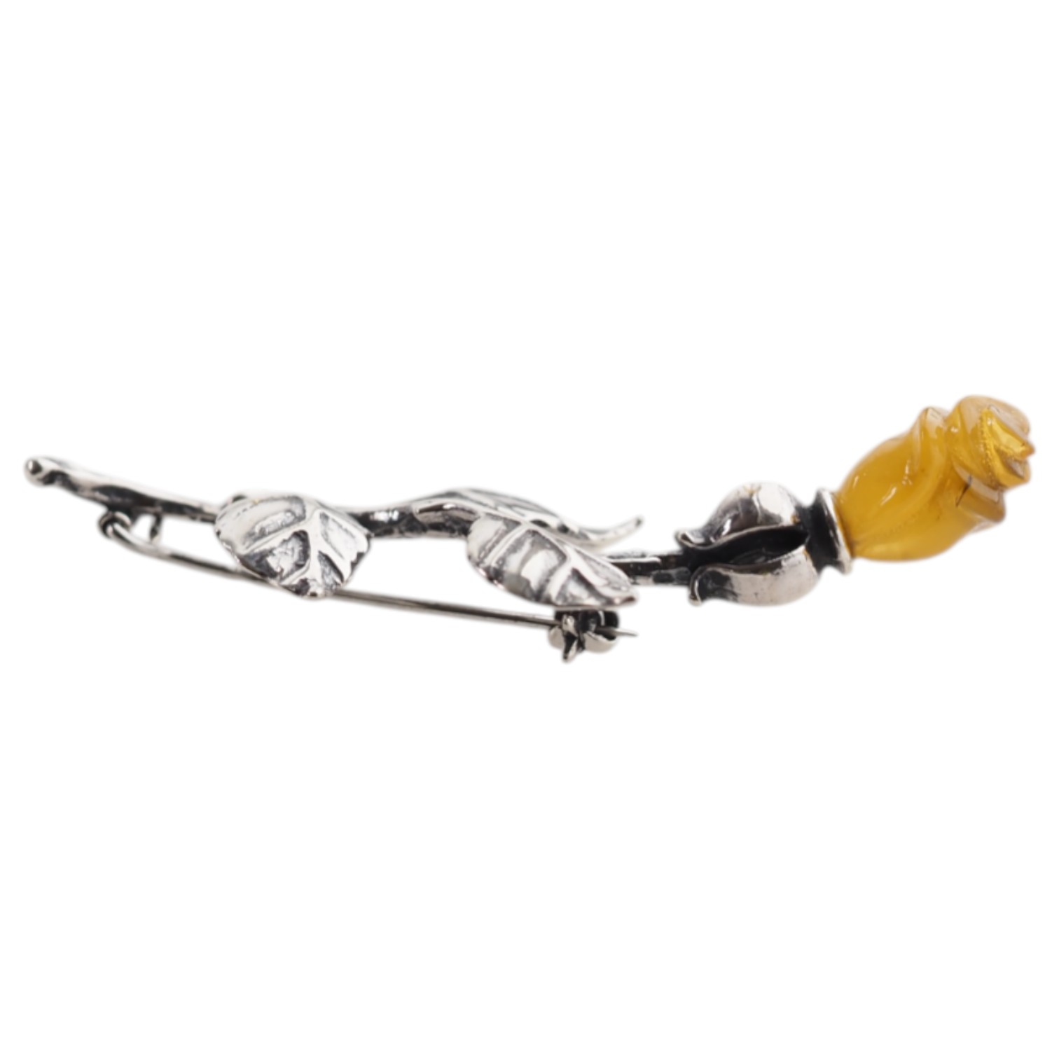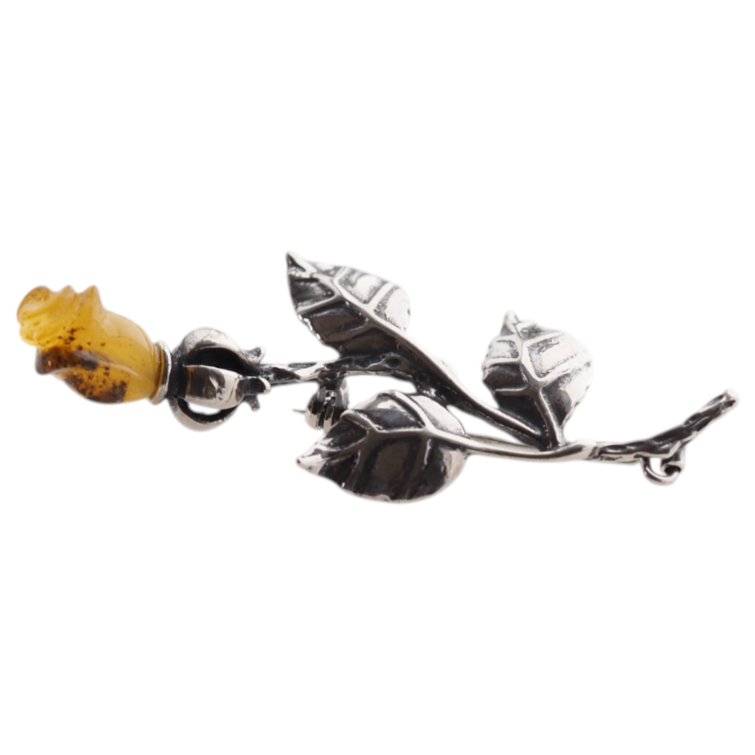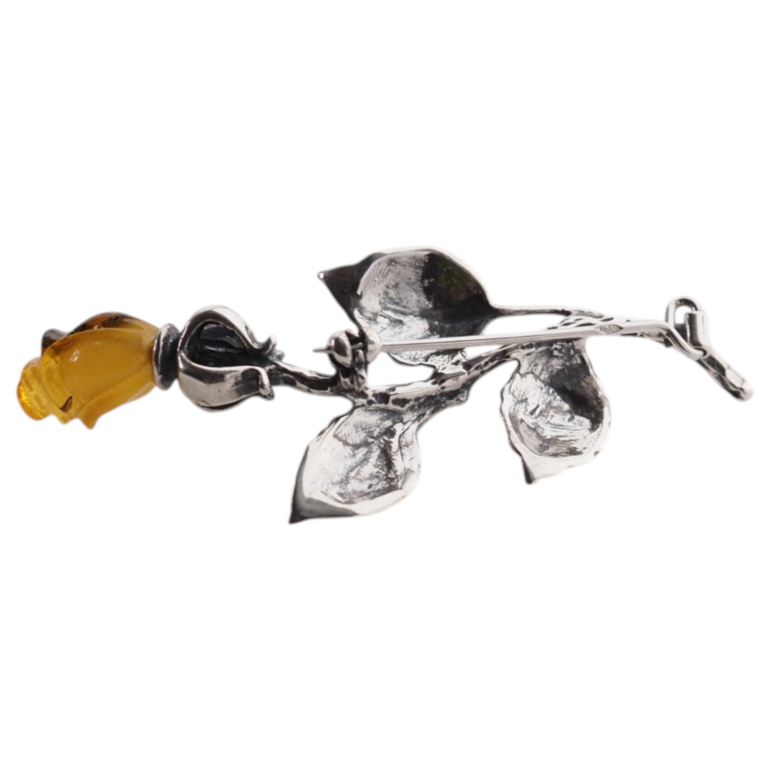 Broszka zachwyca realistycznym odwzorowaniem róży – bursztynowy pąk wyrasta z delikatnej srebrnej łodygi.