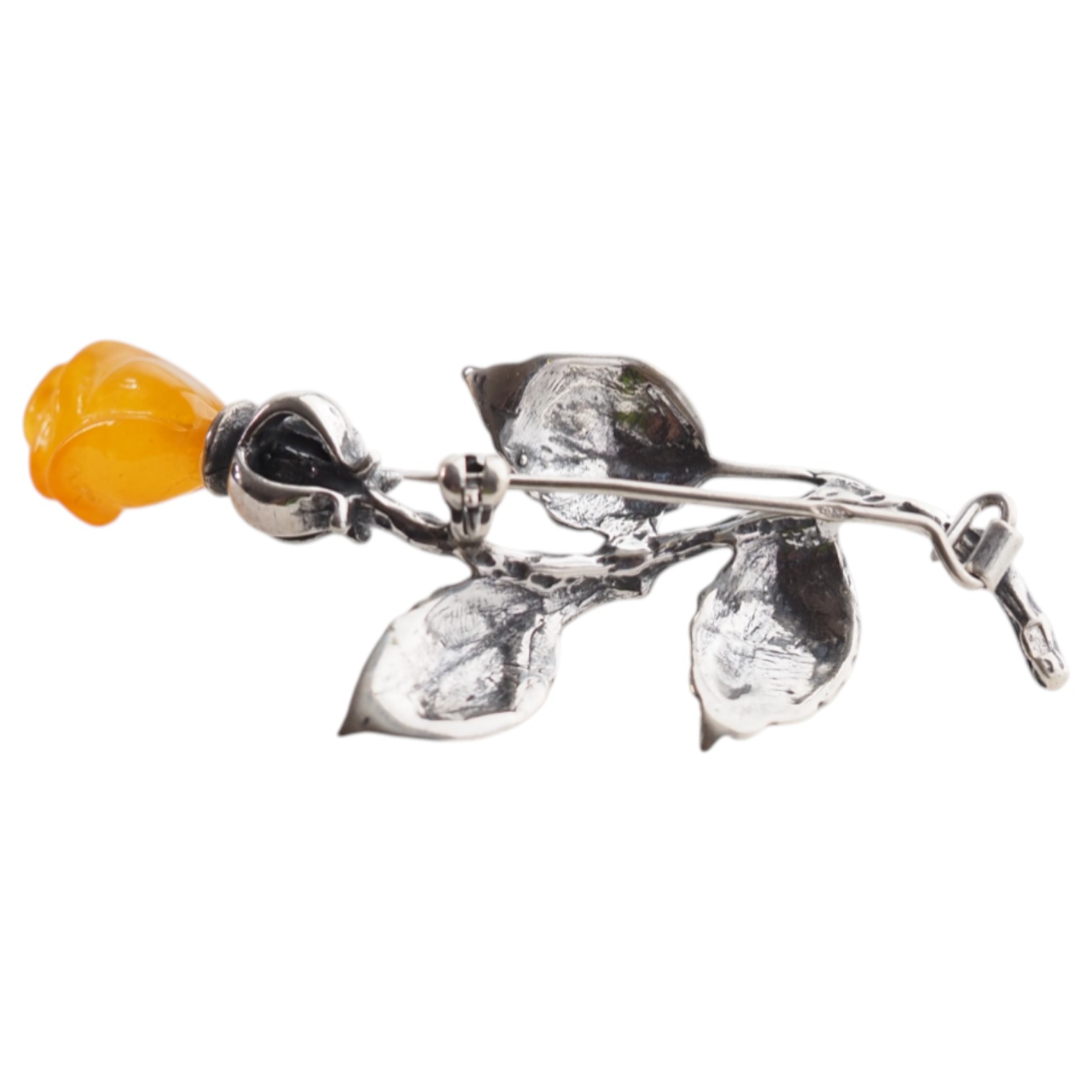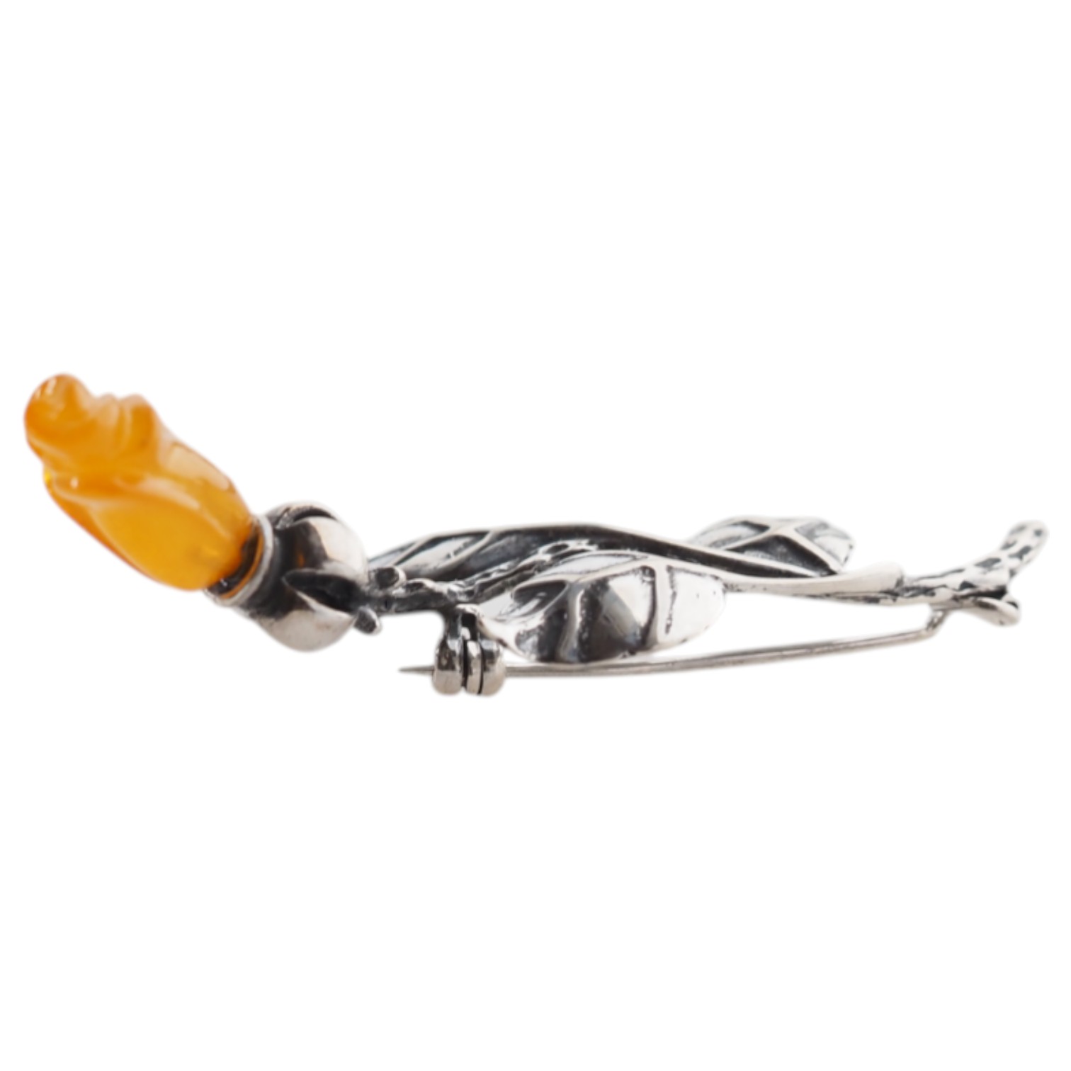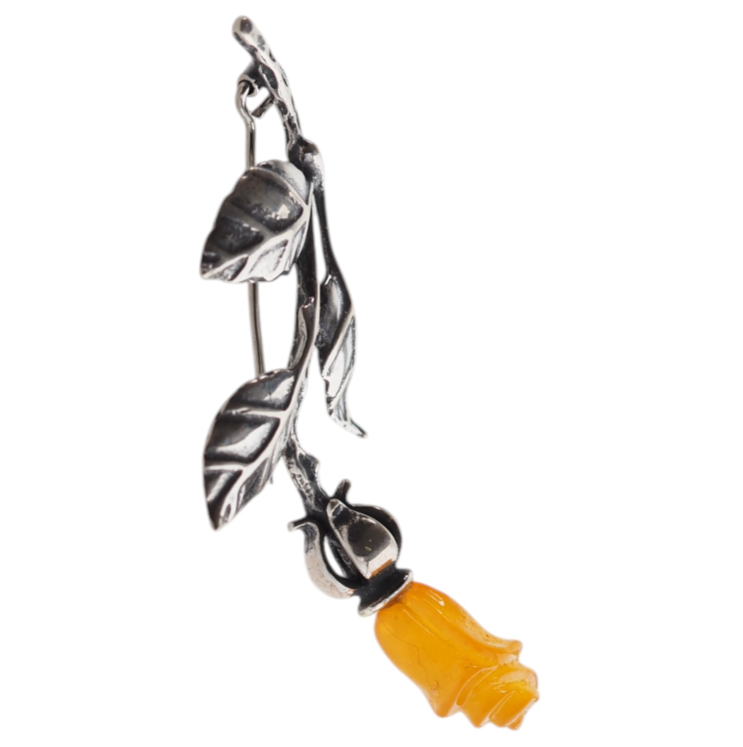 Broszka ukazana w różnych ujęciach – bursztynowy pąk wyrasta z finezyjnej srebrnej łodygi z liśćmi.