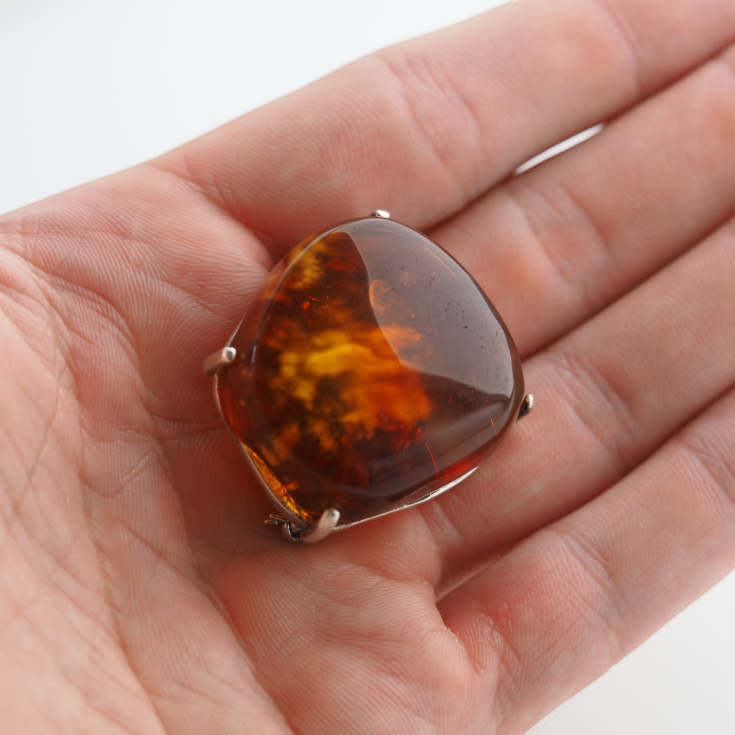 ✔ Barwa: bursztyn o intensywnej, koniakowej tonacji – z widocznymi złocistymi i czerwonawymi refleksami oraz drobnymi inkluzjami organicznymi.