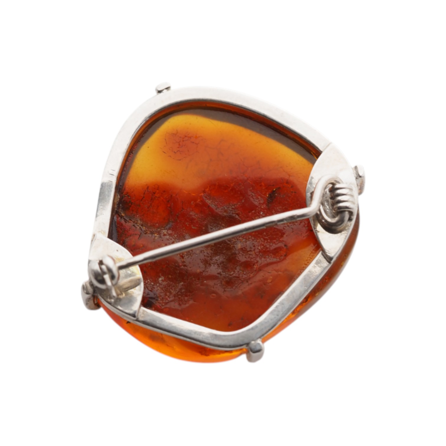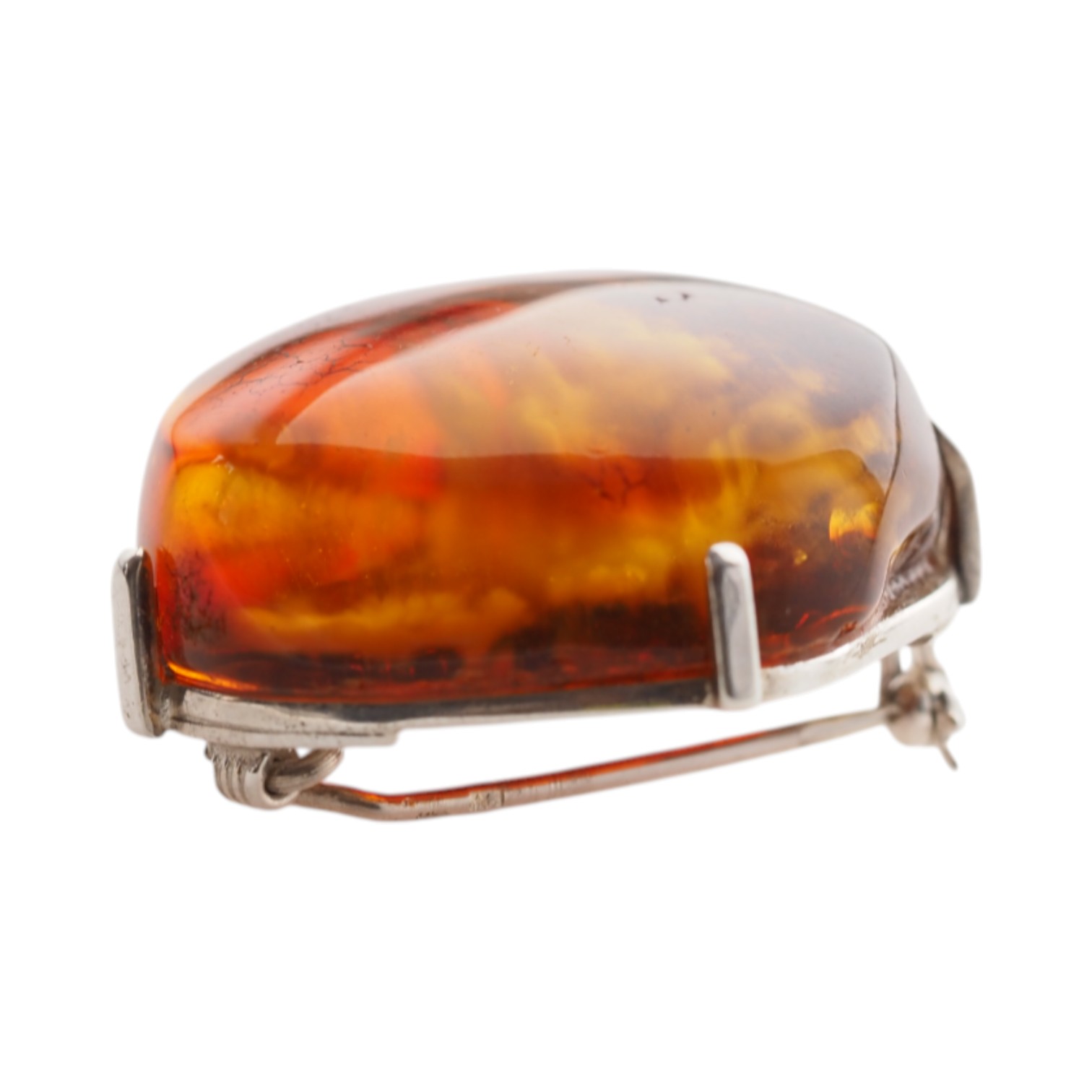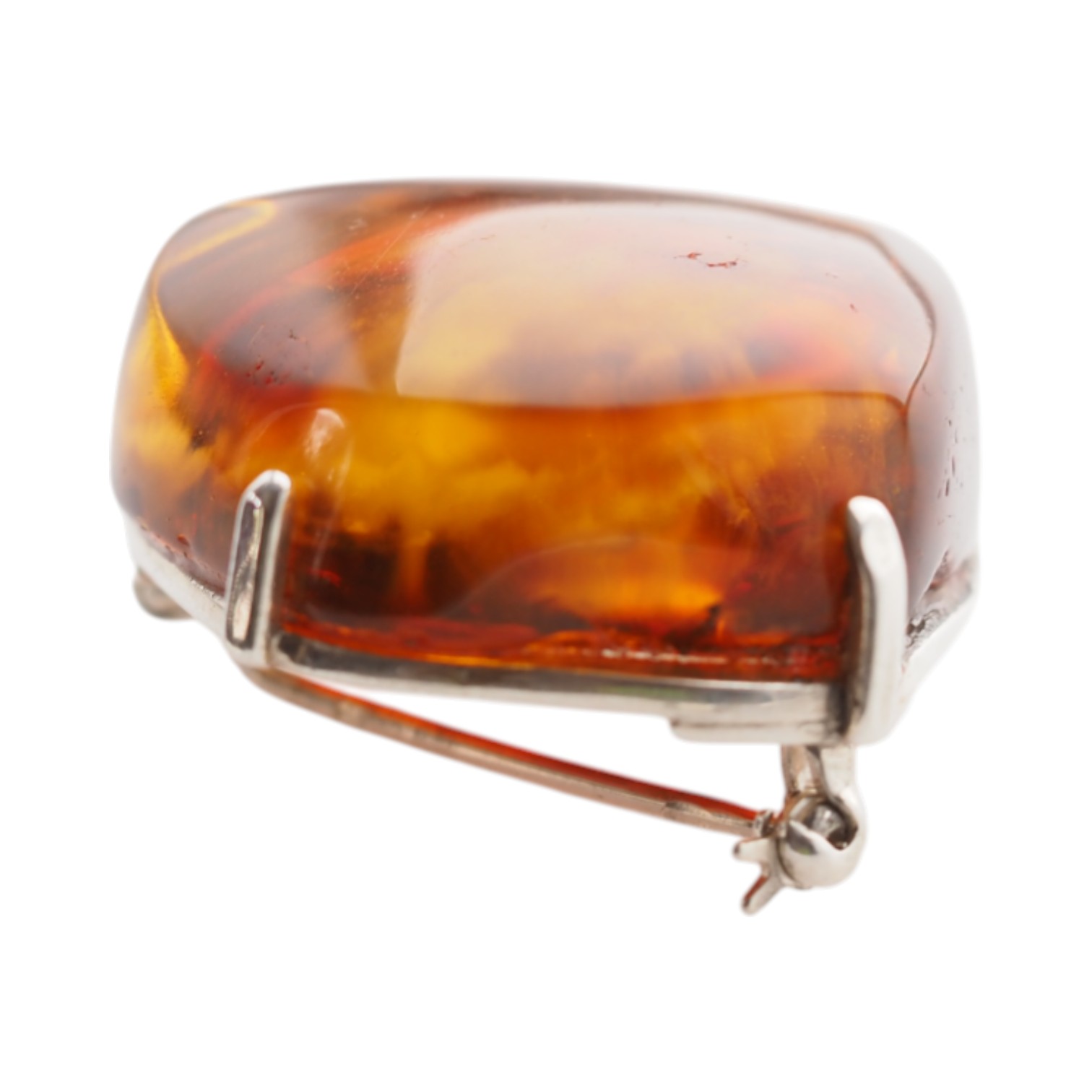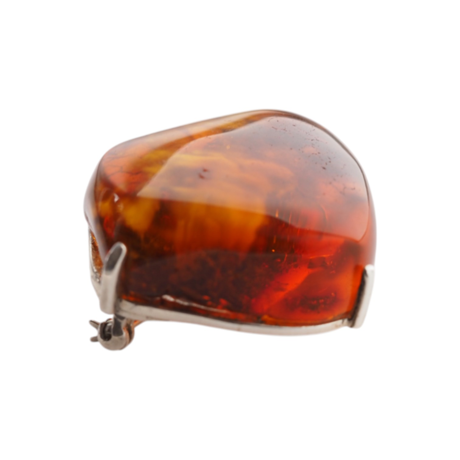 Ręcznie wykonana broszka z dużym bursztynem koniakowym w srebrnej oprawie.