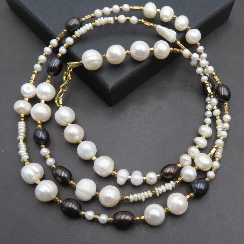 Ten naszyjnik łączy w sobie subtelny blask naturalnych pereł słodkowodnych z wyrazistym, metalicznym akcentem hematytu. Całość dopełnia srebro złocone, które podkreśla elegancki charakter kompozycji i nadaje jej ciepły ton.