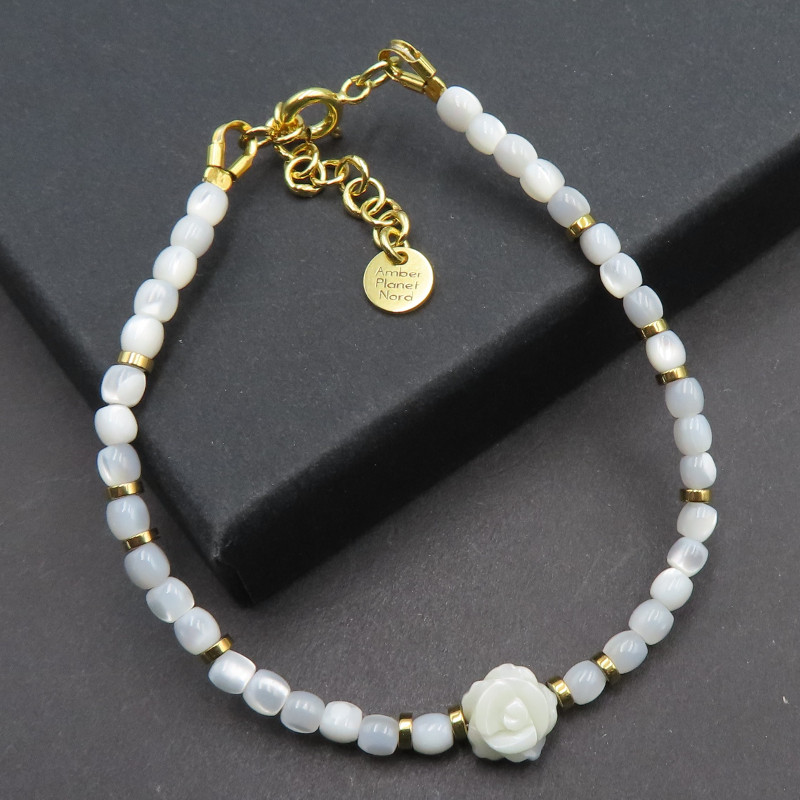 Bransoletka „Muszla i Hematyt” w srebrze złoconym 24K (próba 925) łączy jasny, perłowy charakter muszli z chłodnym połyskiem hematytu. Centralnym akcentem jest ozdobna róża umieszczona w środku, która nadaje całości romantyczny, dopracowany wygląd.