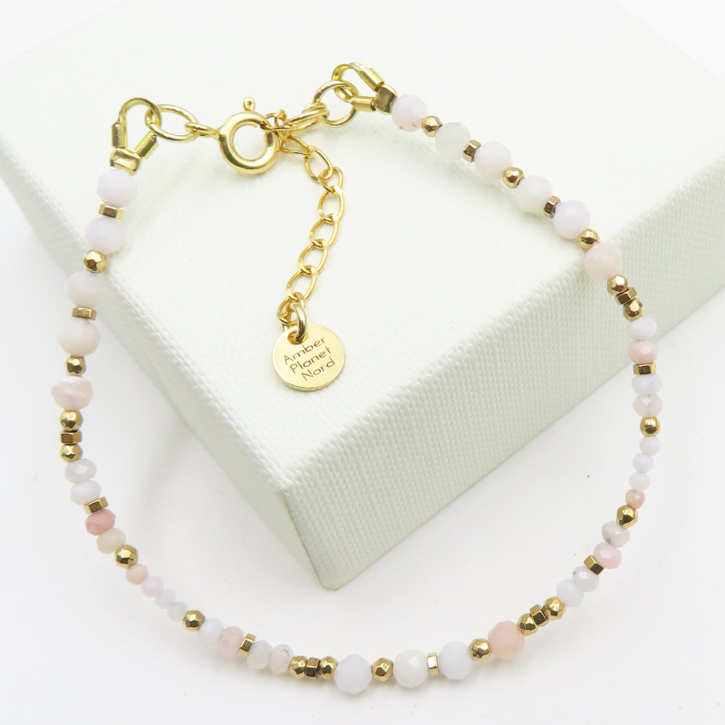 Bransoletka Opal Różowy i Hematyt to subtelne połączenie delikatnego, pastelowego różu z eleganckim, metalicznym połyskiem hematytu. Całość osadzono w srebrze złoconym 24K próby 925, co nadaje biżuterii ciepły, szlachetny charakter i estetykę nowoczesnej klasyki.