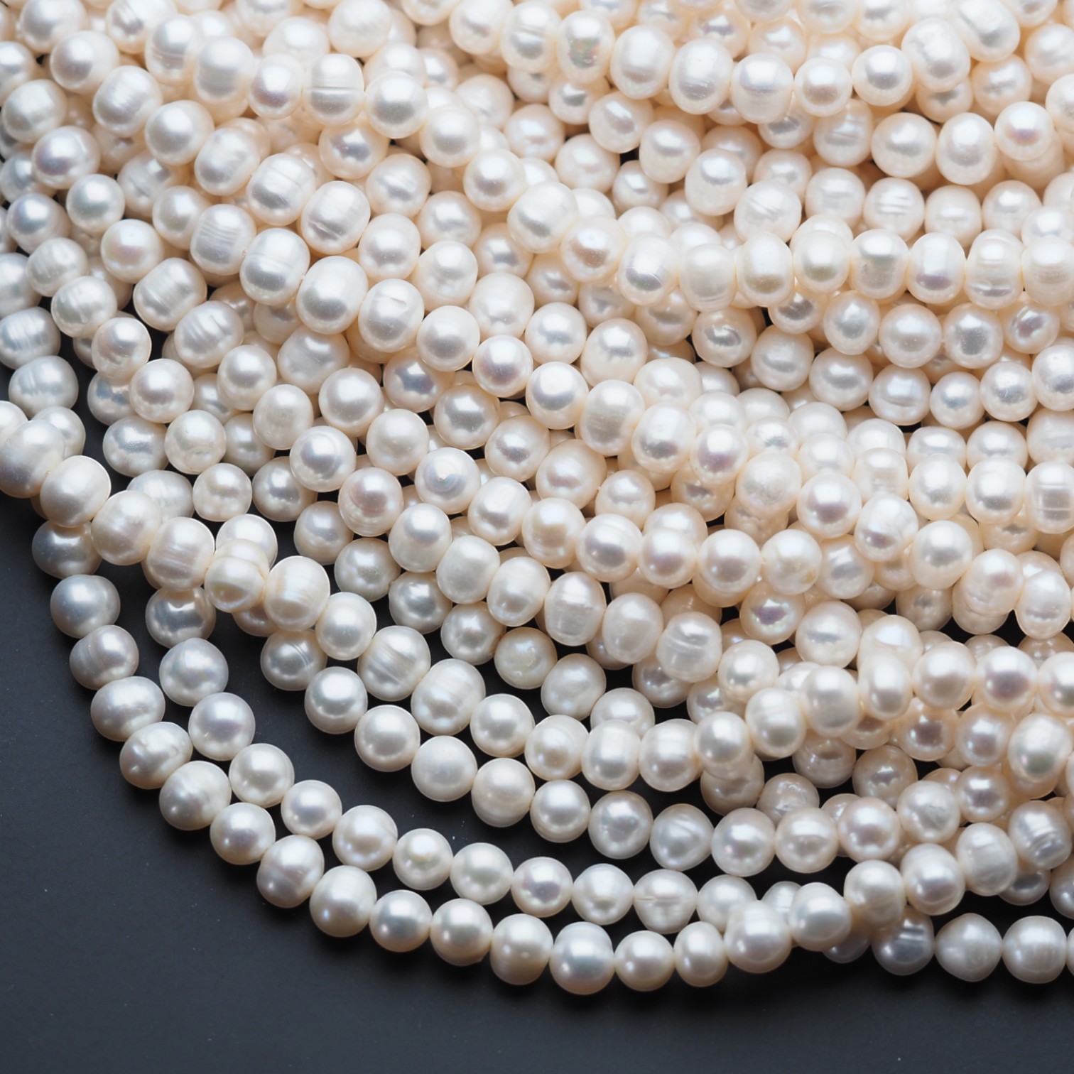 Białe perły hodowane słodkowodne zachwycają subtelnym połyskiem i jasną, klasyczną barwą. Na sznurze prezentują się lekko i harmonijnie, wprowadzając do projektów wrażenie czystości oraz ponadczasowej elegancji.